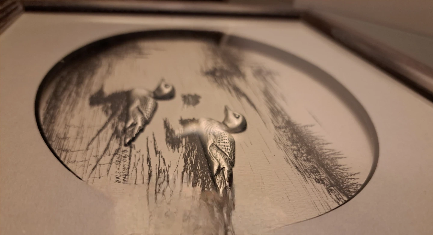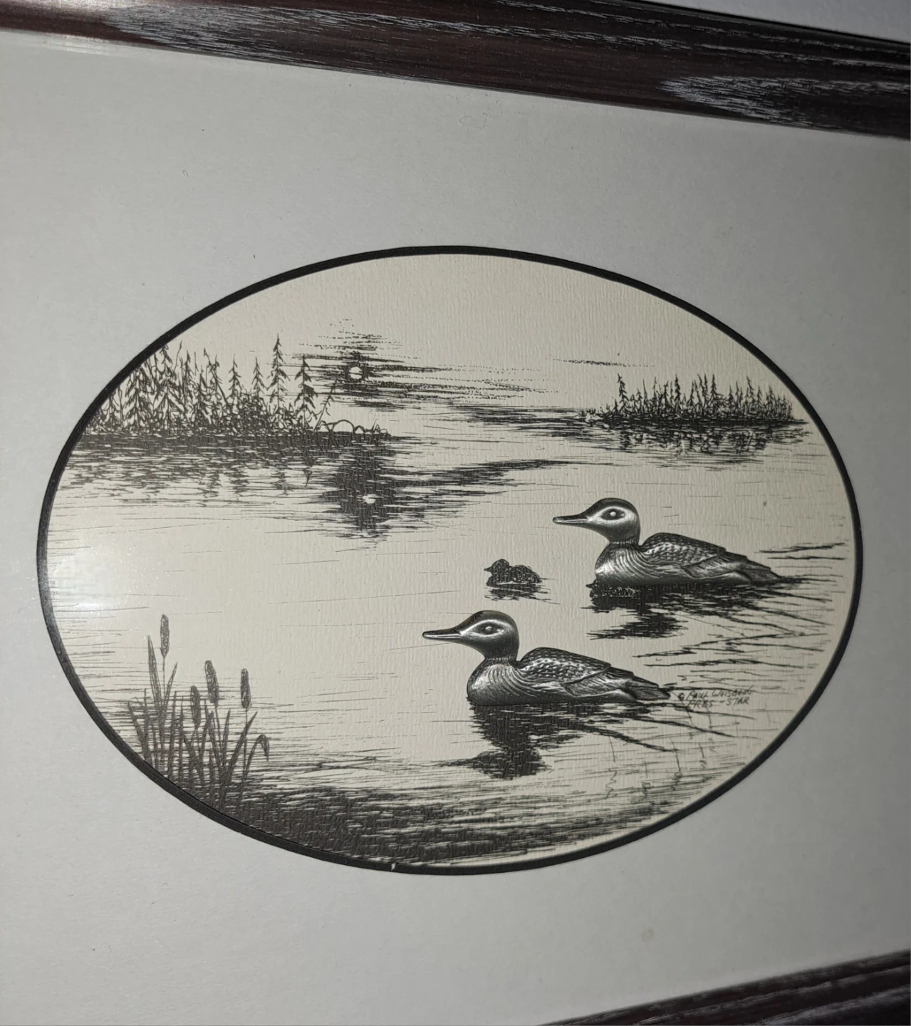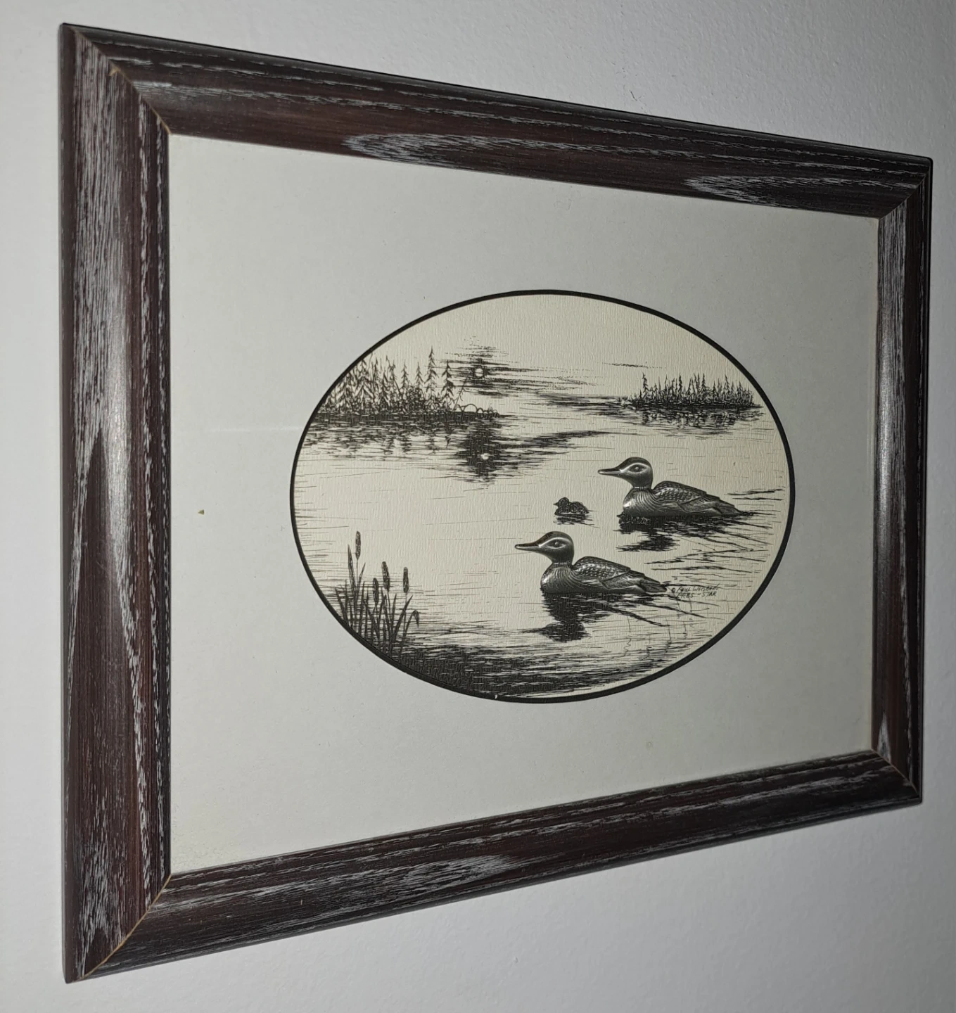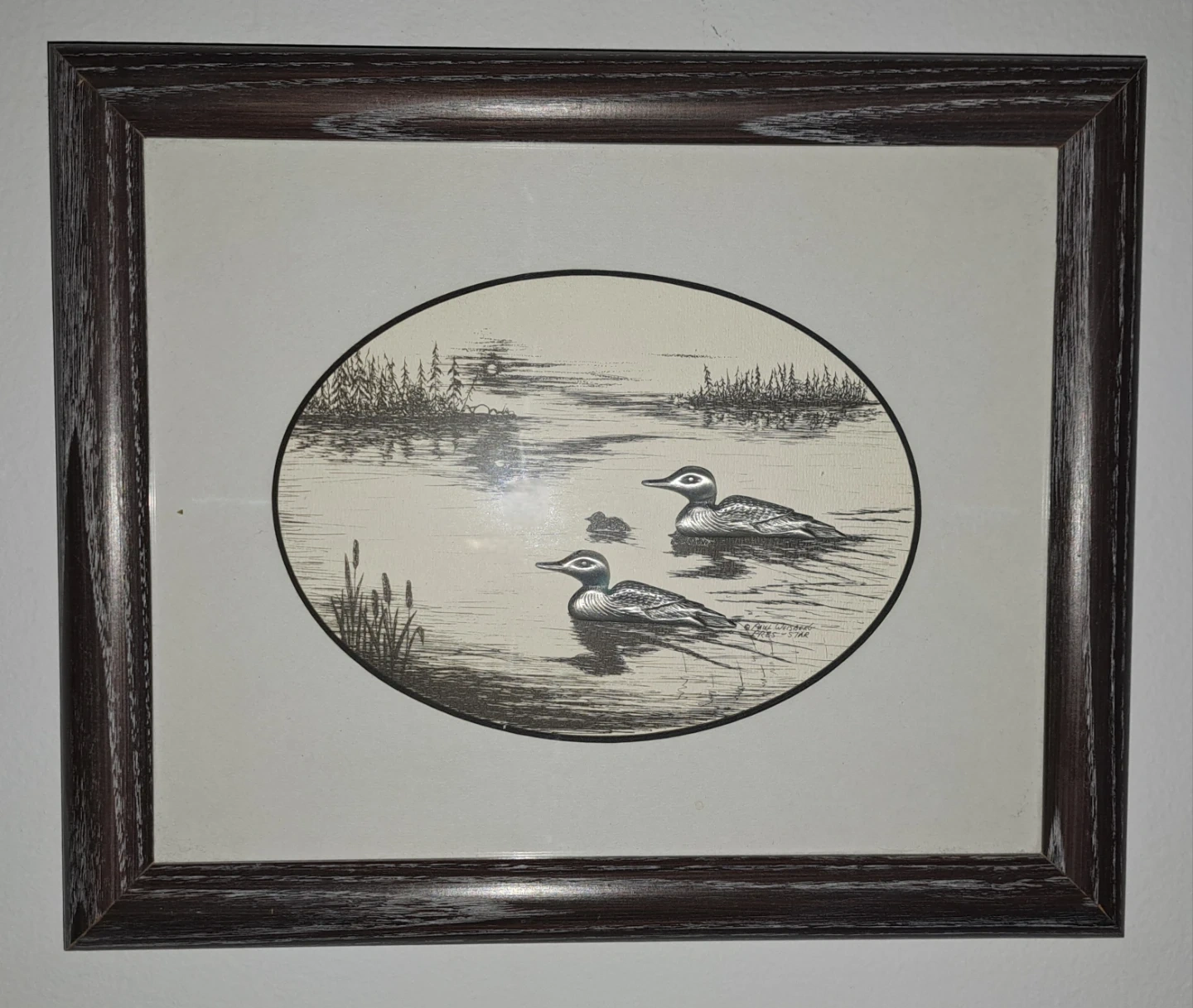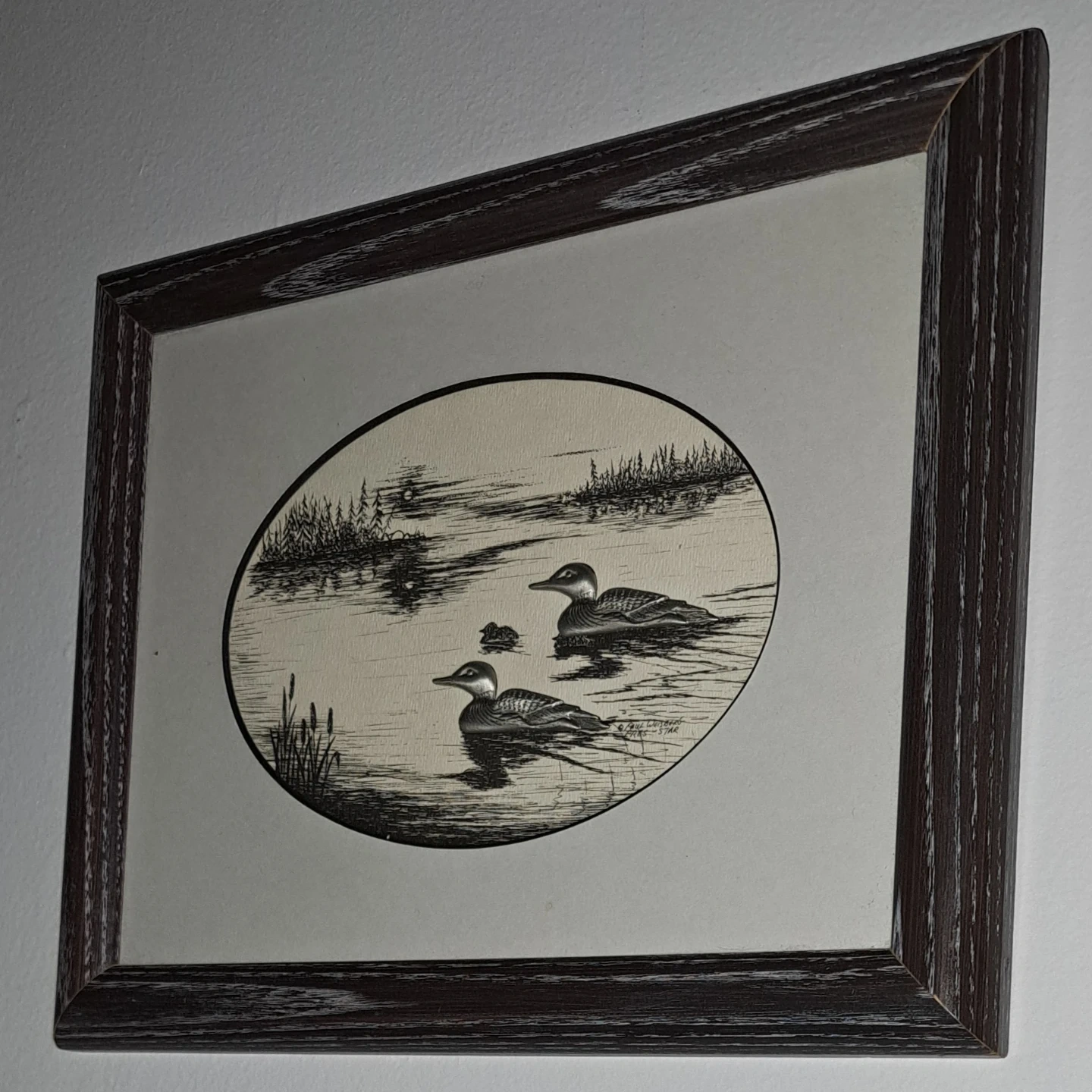 213Small, framed print featuring a lovely loon scene. It's in excellent shape, no chips, cracks or damage. The silver coloured loons are raised against the background. This would make a fantastic photo for the cottage. From a smoke free home. $20 ca$h
