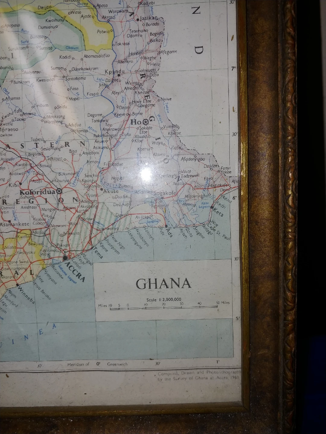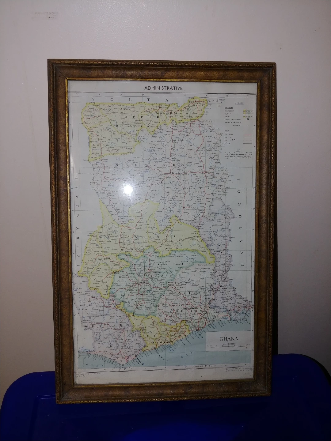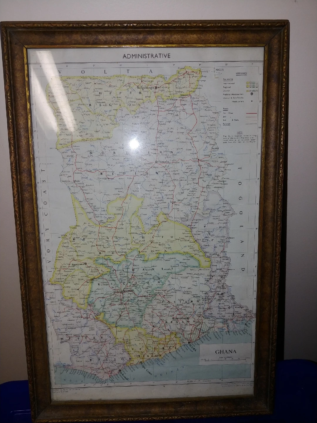 17Selling a framed map of Ghana. It's in great shape and ready to hang! The frame is a nice gold colour, and the map itself has lots of interesting details.