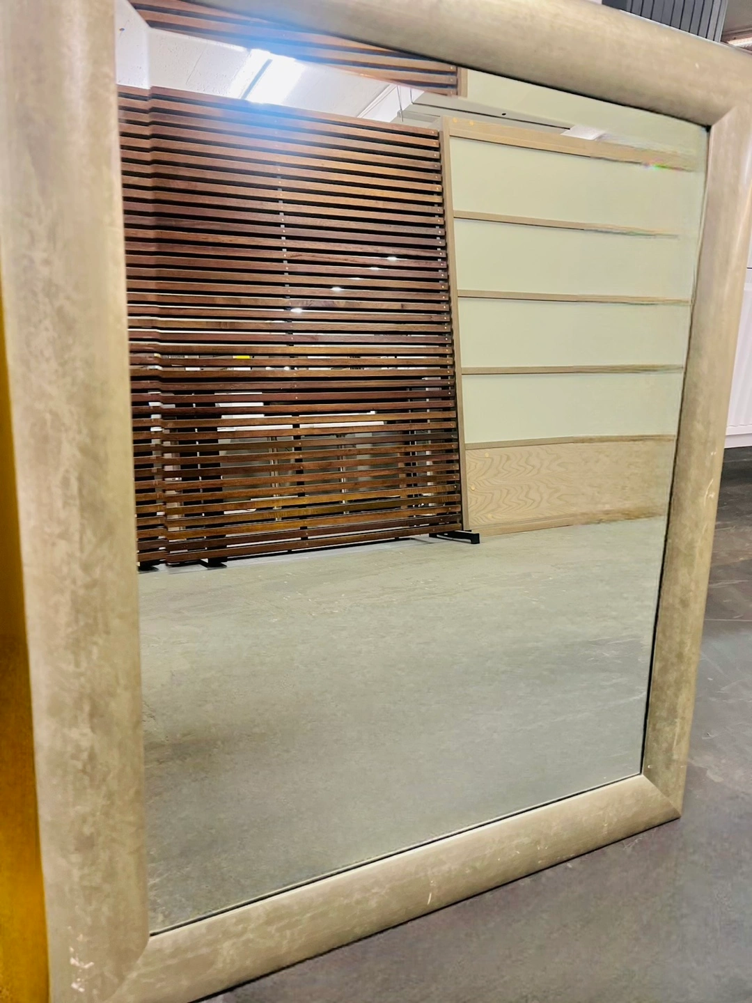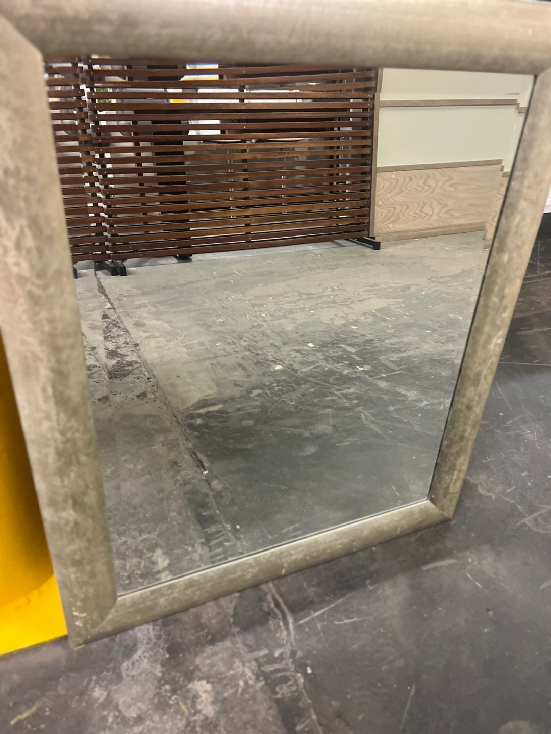 22Rectangular mirror. Frame appears to be wooden. The frame has a textured, neutral colour finish. This mirror would be a great addition to any room and can help create a sense of space.