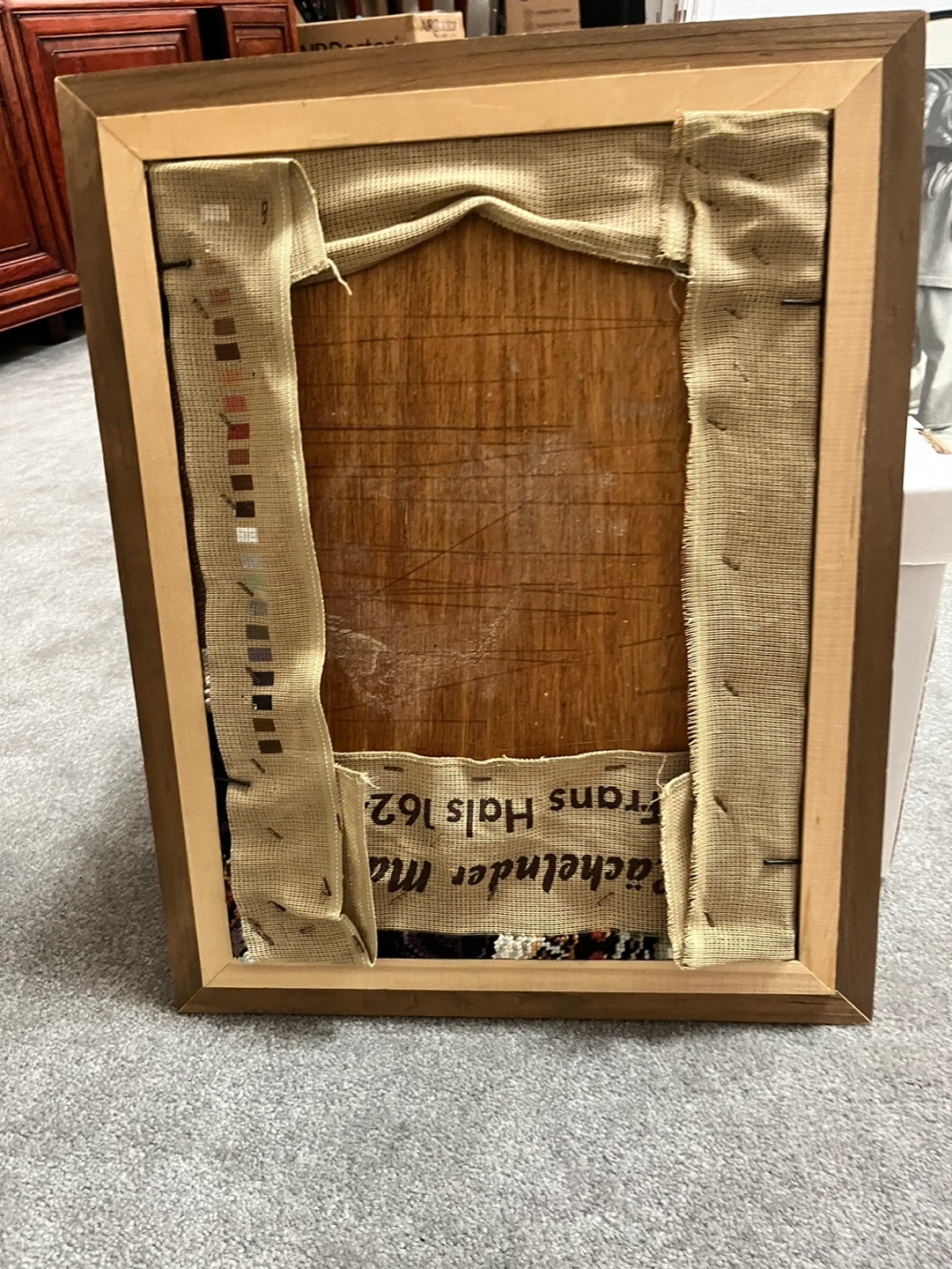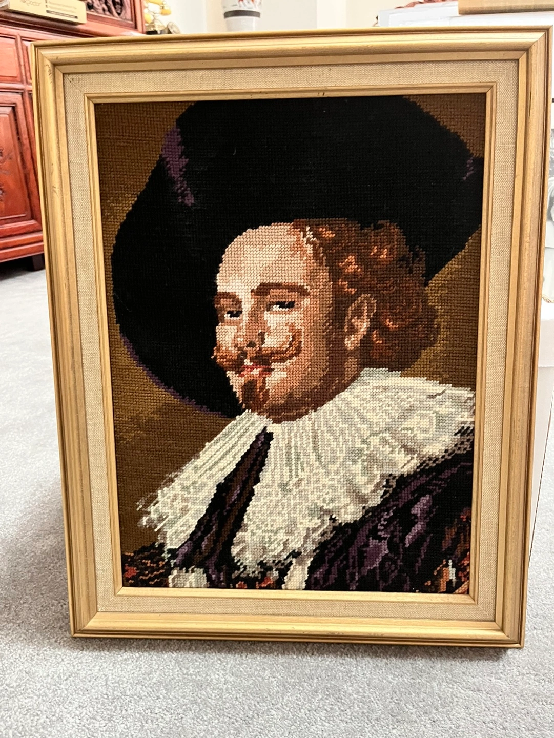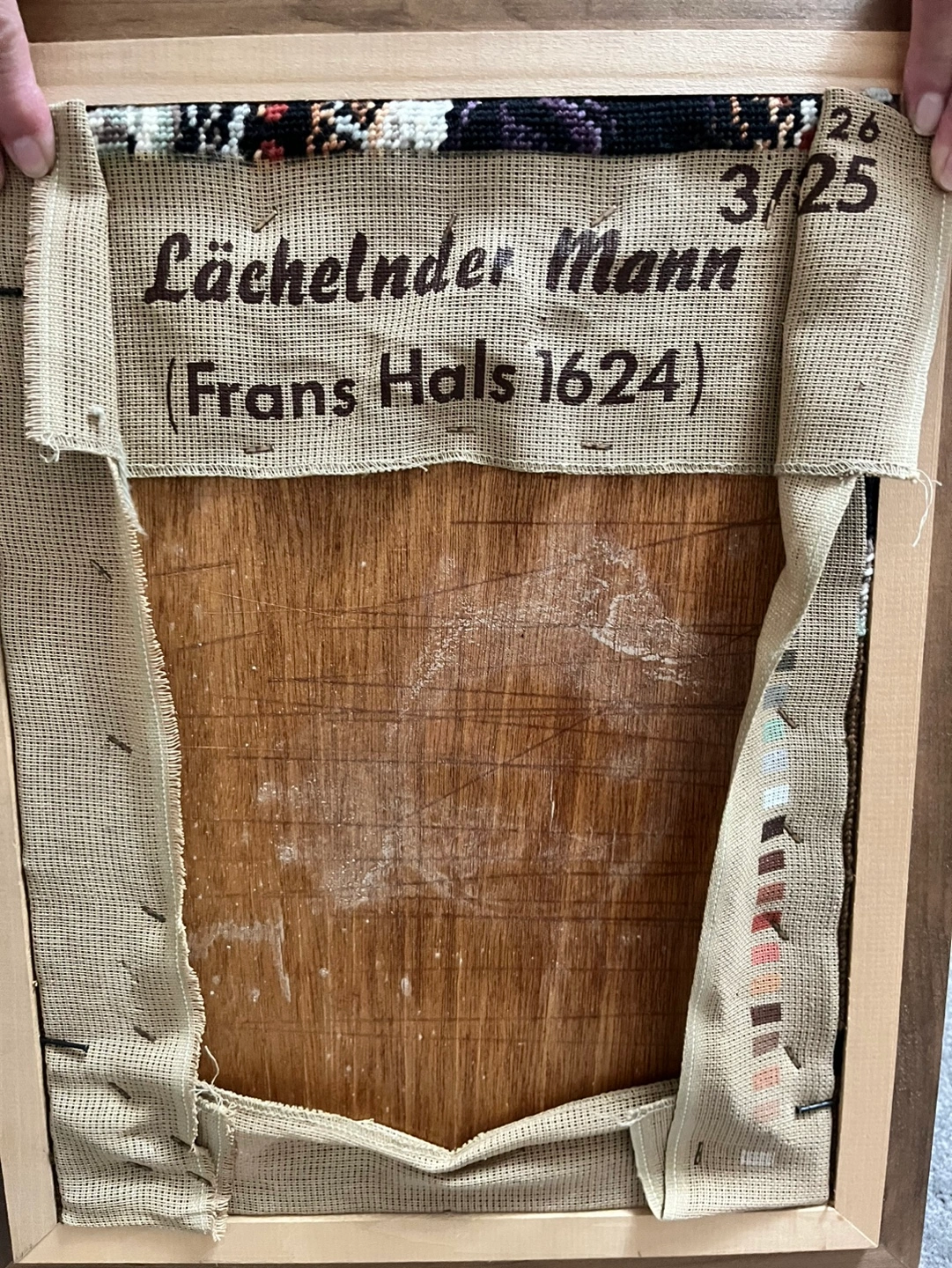 Framed needlepoint of Frans Hals's Laughing Man. The image is mounted on a frame.