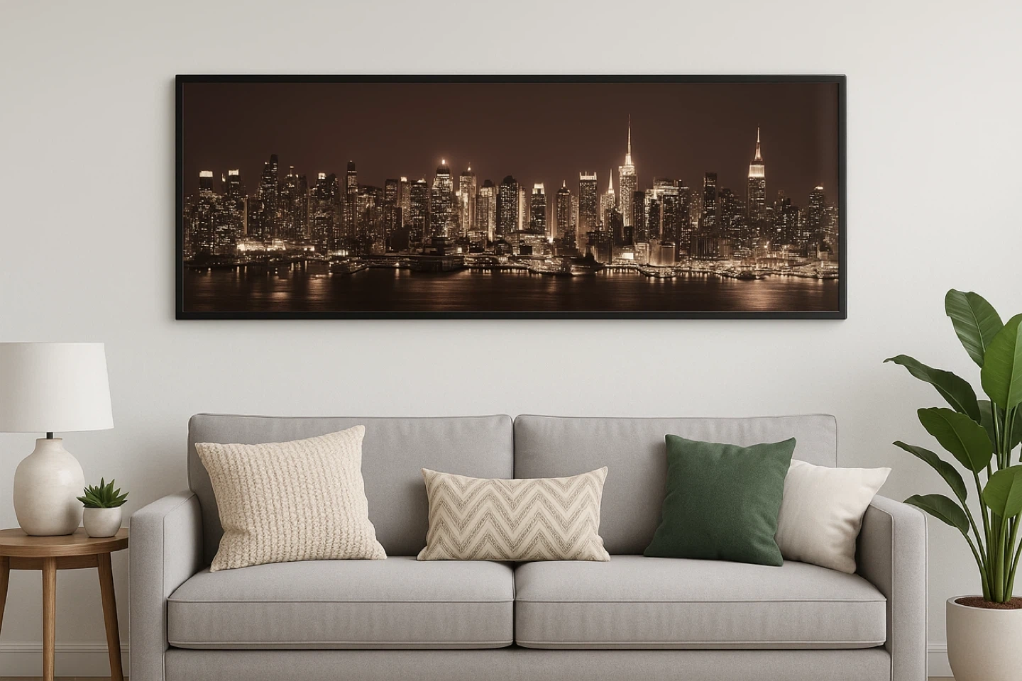 15This is a beautiful panoramic piece of wall art featuring the iconic New York City skyline at night! It's framed and ready to hang, perfect for adding a touch of city chic to any room