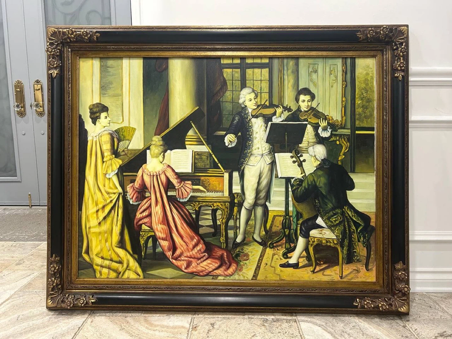 5Selling a framed oil painting. The dimensions are 145 x 120 cm. It depicts a scene with musicians and figures in period attire. A beautiful piece for your home!