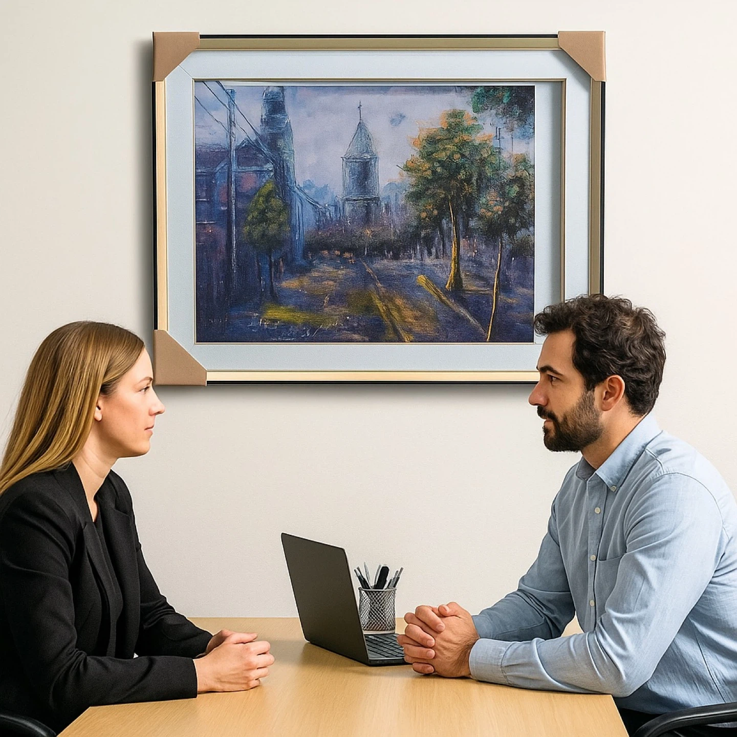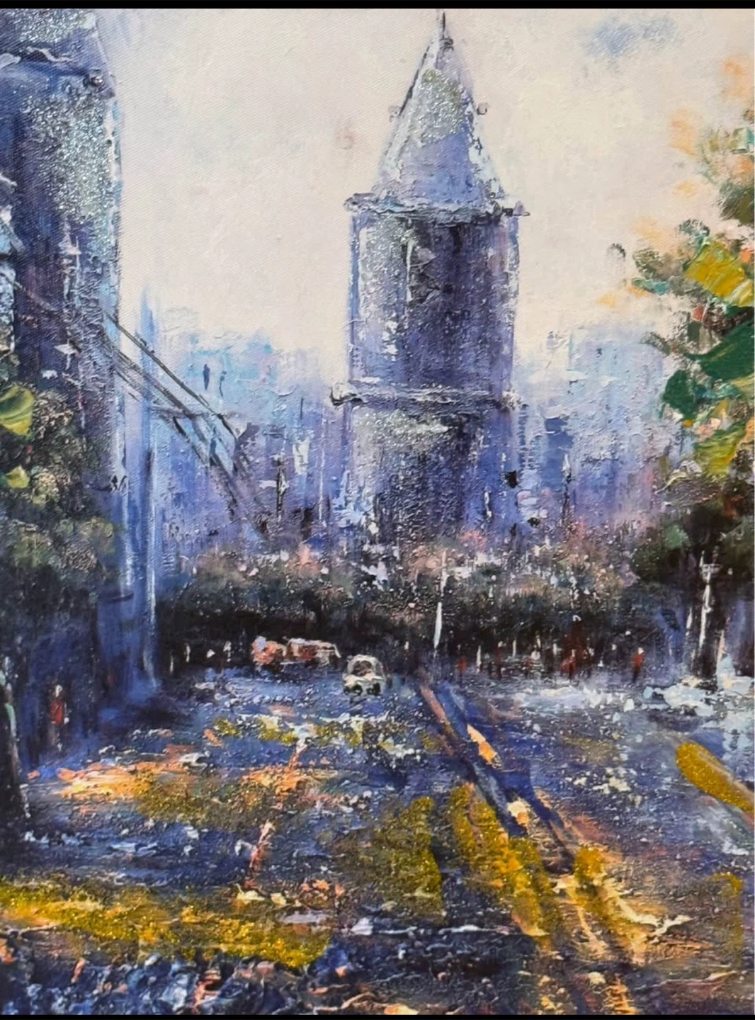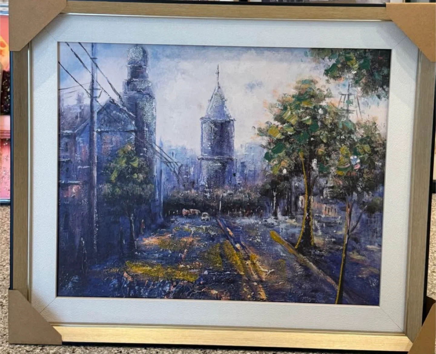 15Selling a framed oil painting. It depicts a cityscape with a tower and trees. It's in great condition and ready to hang