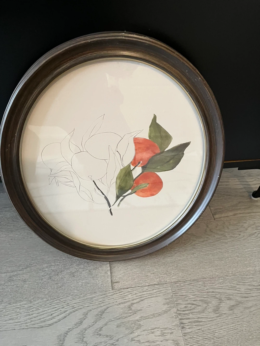 75Selling a framed watercolour art piece featuring oranges. The frame is a dark brown, and the artwork itself is a simple yet elegant design. It's in great condition and would look lovely in any room!