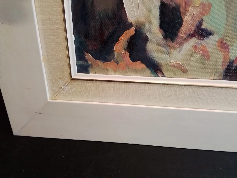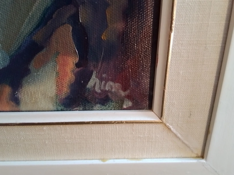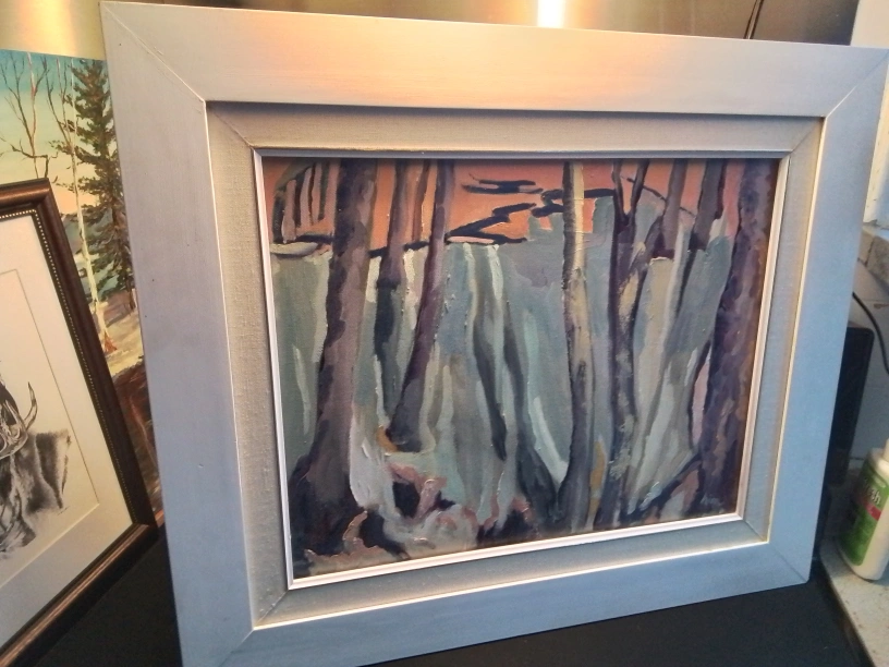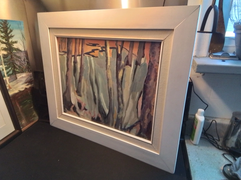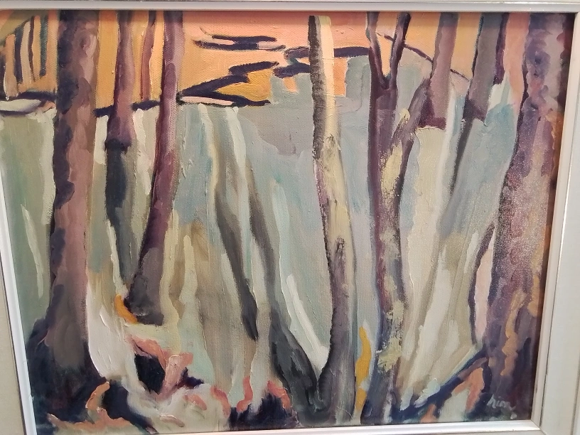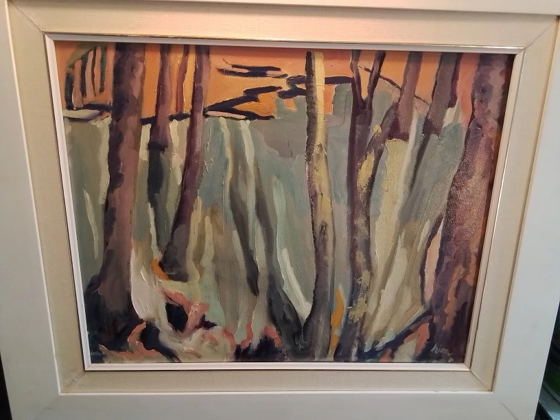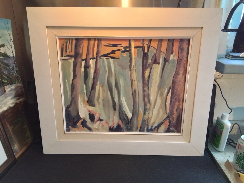 Framed Original Oil Painting of Trees by him Original oil painting on canvas. Depicts trees in a forest setting. Framed in a white frame. Signed Measurements 24.75 x 21 Pickup at Young Street and Steels Ave