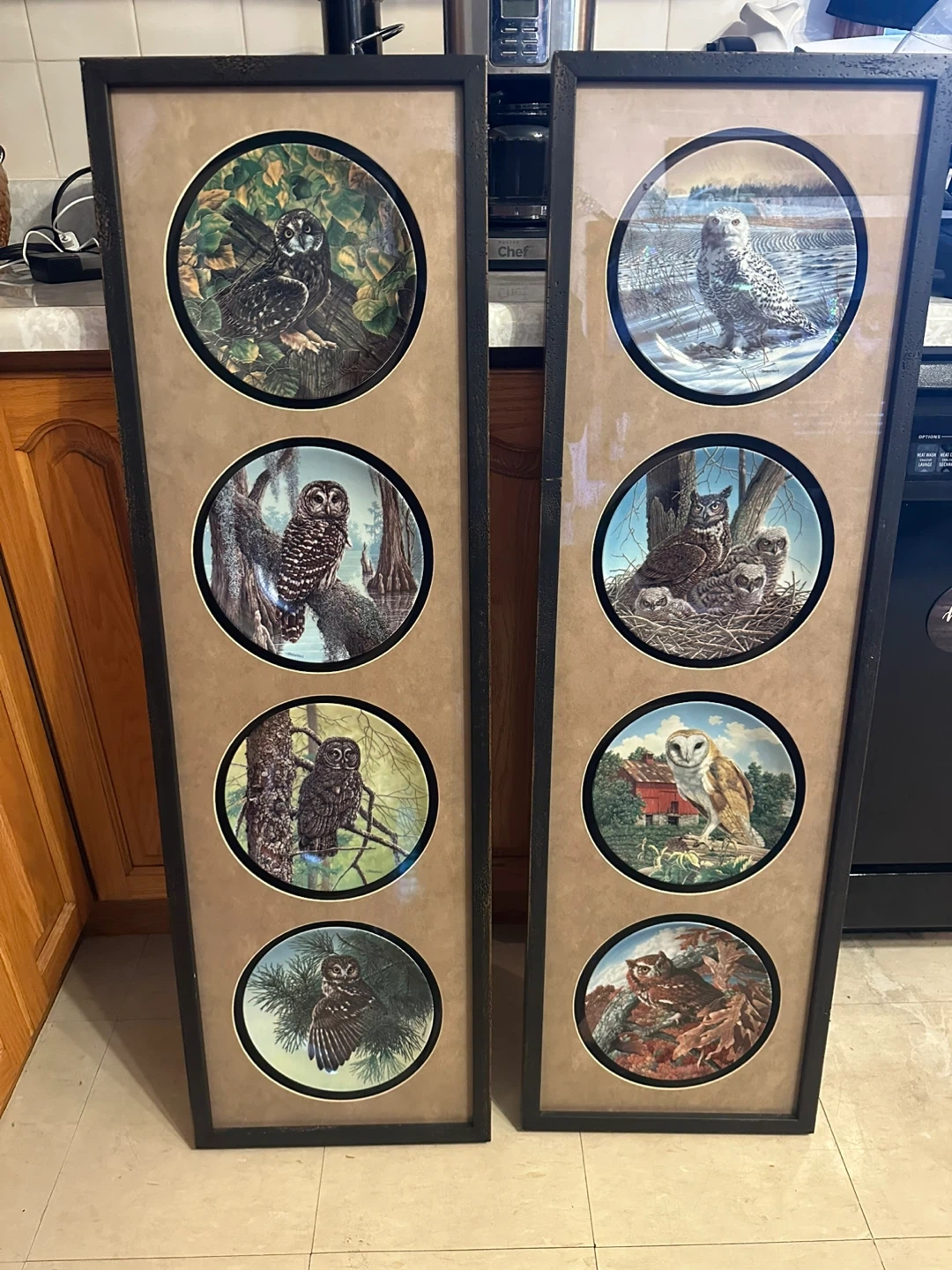 77Selling two framed art pieces featuring a collection of owl plates. They'd make a lovely addition to any room!