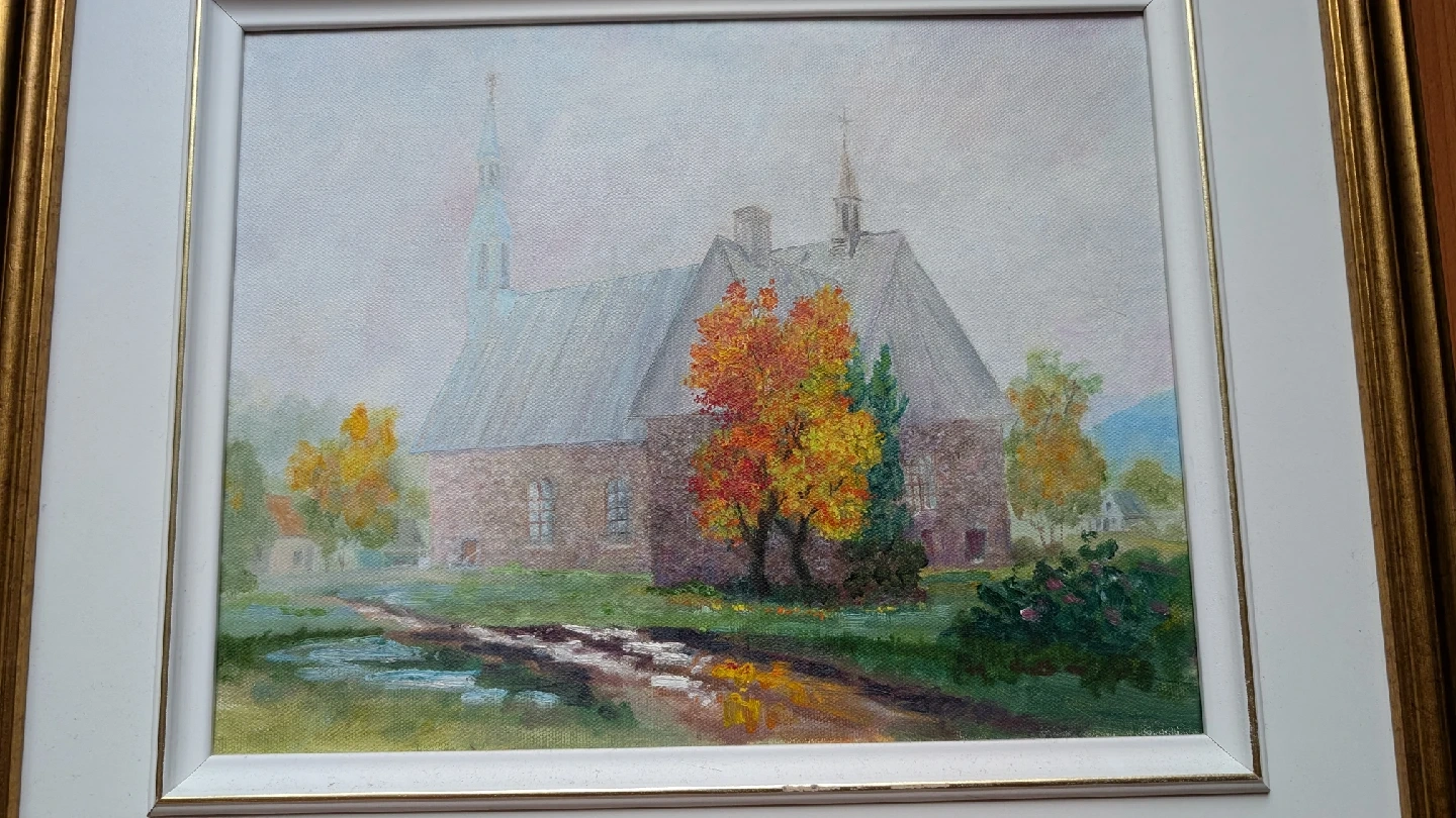 17Original painting by an artist. The painting depicts a building in a rural setting with trees in autumn colours. The frame is gold coloured. 22 by 18 inch