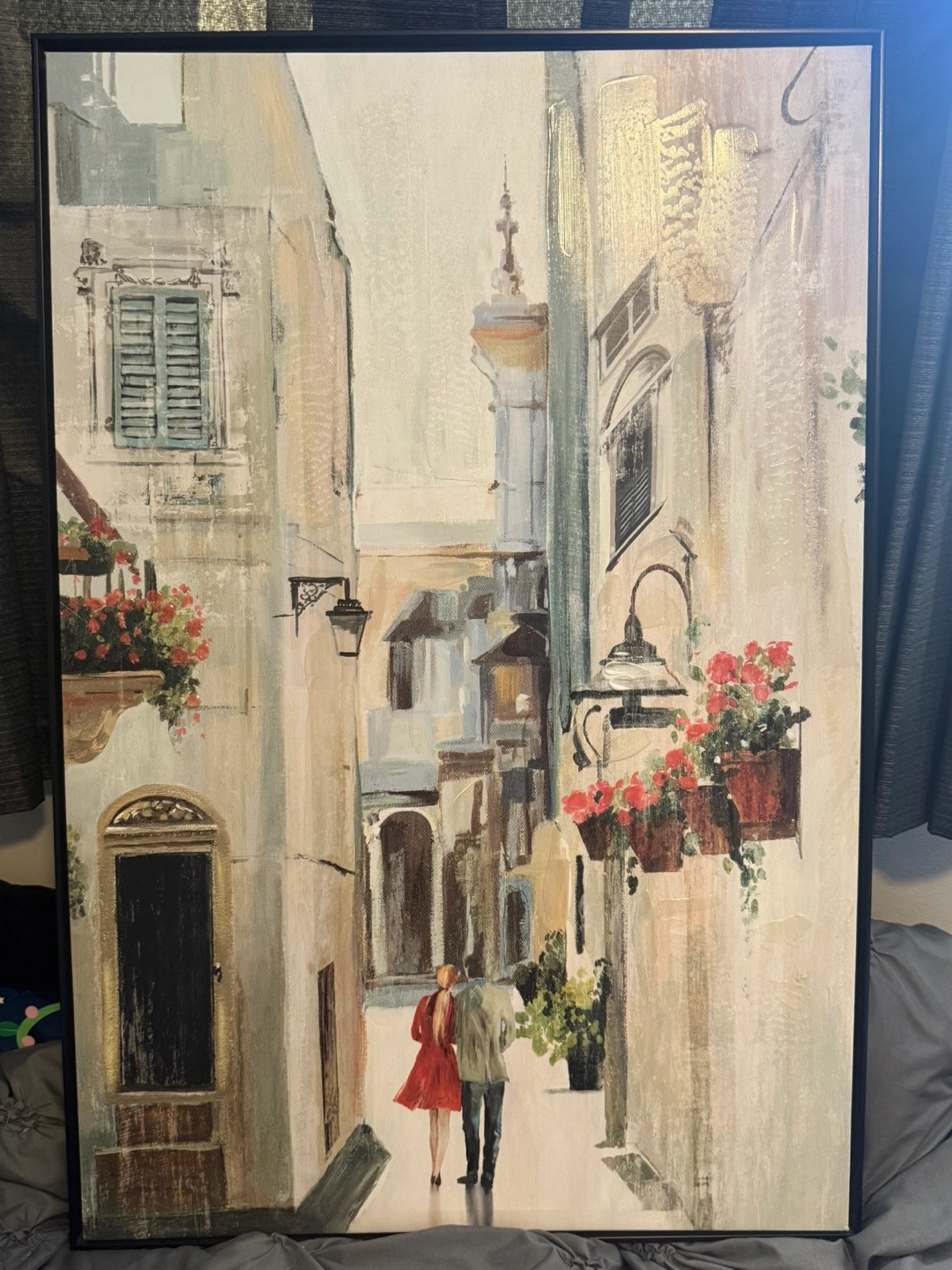 This is a used framed painting featuring a charming street scene with a couple walking down a narrow lane flanked by buildings with flower-filled balconies. The artwork brings a touch of European elegance to any room. Additional details include: * Framed and ready to hang * Dimensions: 36 inches height x 24 inches width * Style: Impressionist