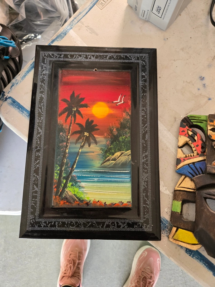 A framed painting featuring a beautiful sunset scene with palm trees. Perfect for adding a touch of tropical vibes to your home decor!