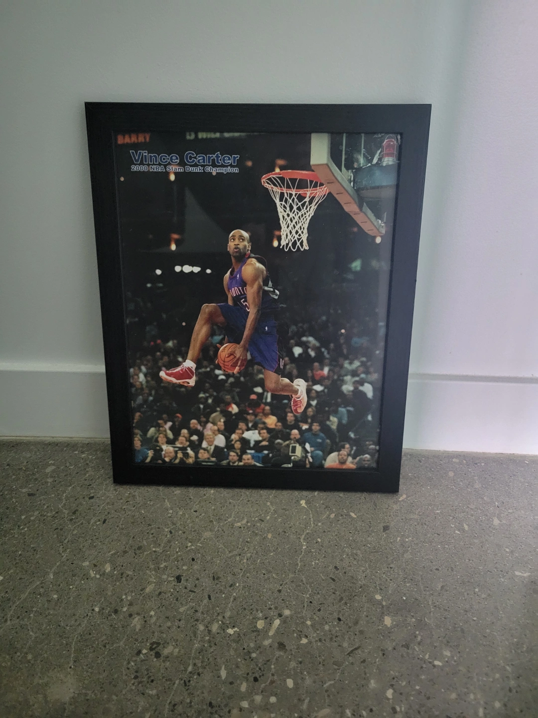 Framed poster of Vince Carter, 2000 NBA Slam Dunk Champion. Black frame. Ready to hang.