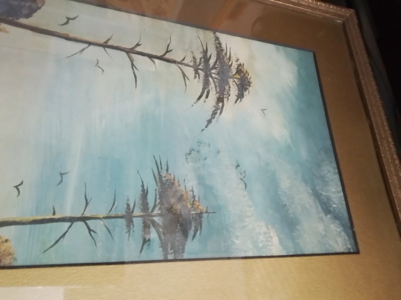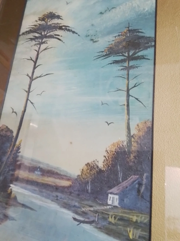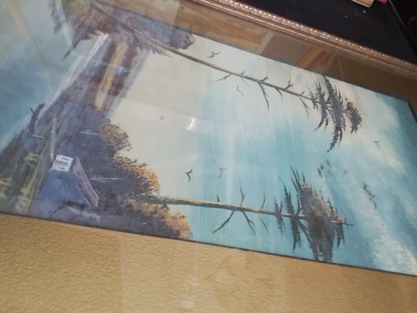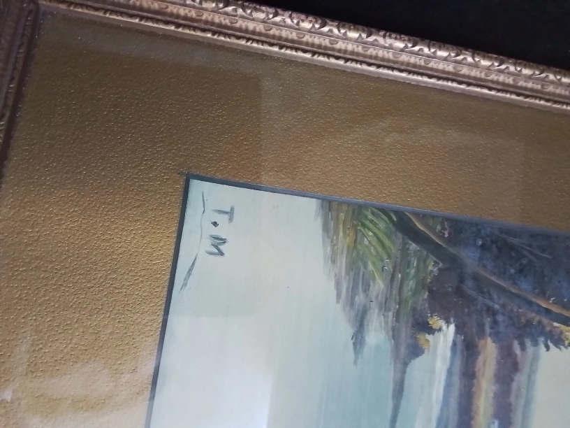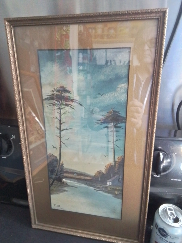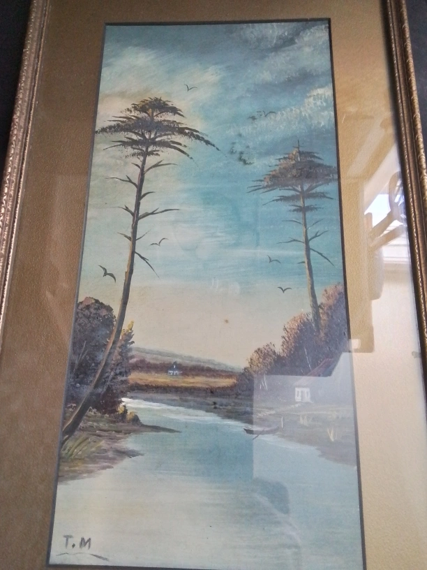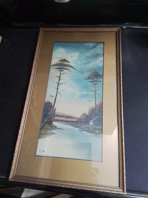 114Framed Vintage Landscape Painting by T.M. Framed landscape painting, signed T.M Vintage framed painting. Features a tranquil landscape scene. Gold-coloured frame. Artist signature T.M. visible. 12x20, featuring a serene scene with trees, birds, and a body of water. Please see photos for details. Pickup at Young Street and Steels Ave
