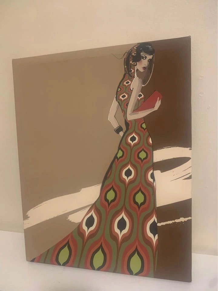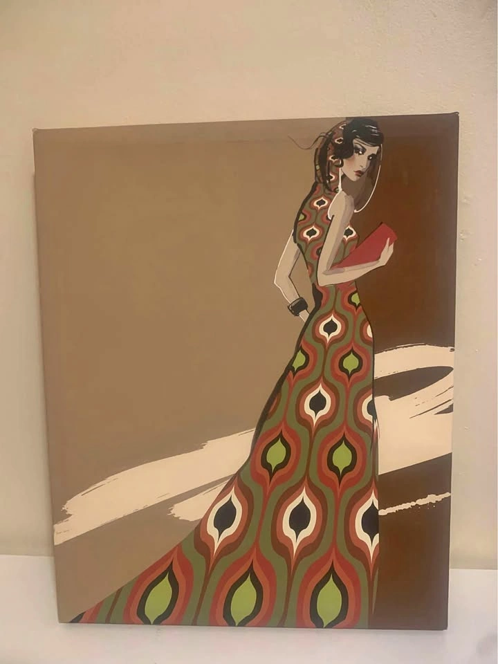 1000+A lovely framed piece of wall art! It features a stylish woman in a patterned dress. The canvas measures approximately 16 inches by 20 inches, making it a great size for adding a touch of elegance to any room.