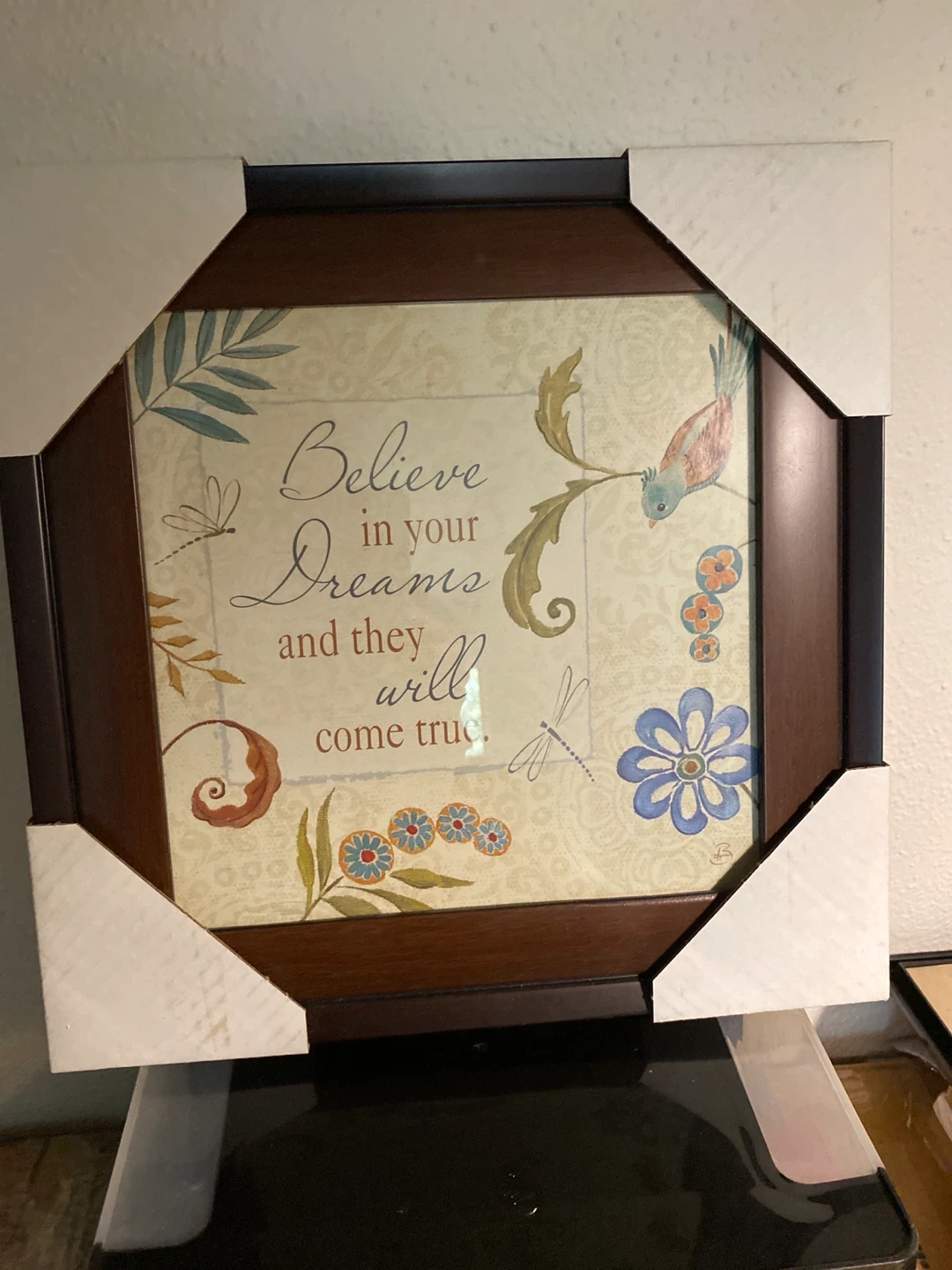 393This framed wall art features a lovely design with the words 'Believe in your dreams and they will come true'. It's a charming piece that would add a touch of inspiration to any room 13 1/4” square (34cm) Moving Sale Pick up only