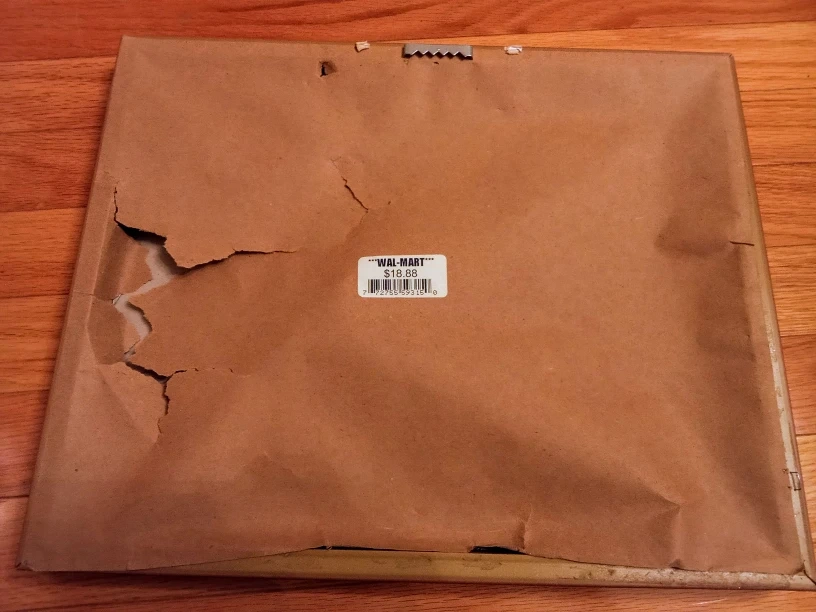 126A framed piece of wall art featuring the word "Smile" spelled out with architectural photos. The back has some damage to the paper covering, but the art itself is in good condition. Originally bought at Walmart for $18.88.