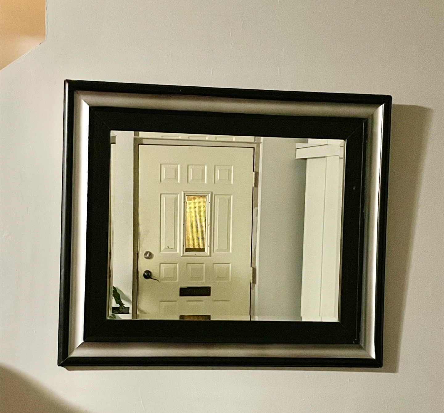 Selling a framed wall mirror. It's in good condition and ready to brighten up your space! The frame is a sleek black and silver colour, adding a touch of modern elegance to any room Can be painted to a colour more suitable to yours needs