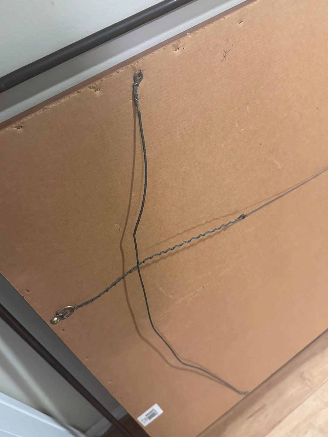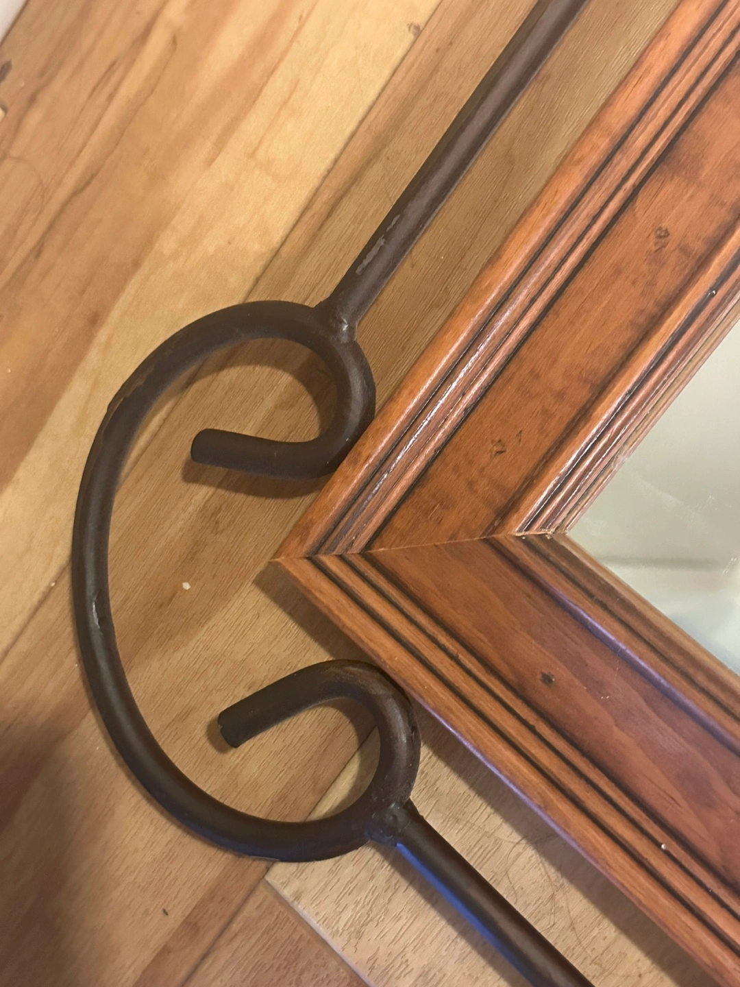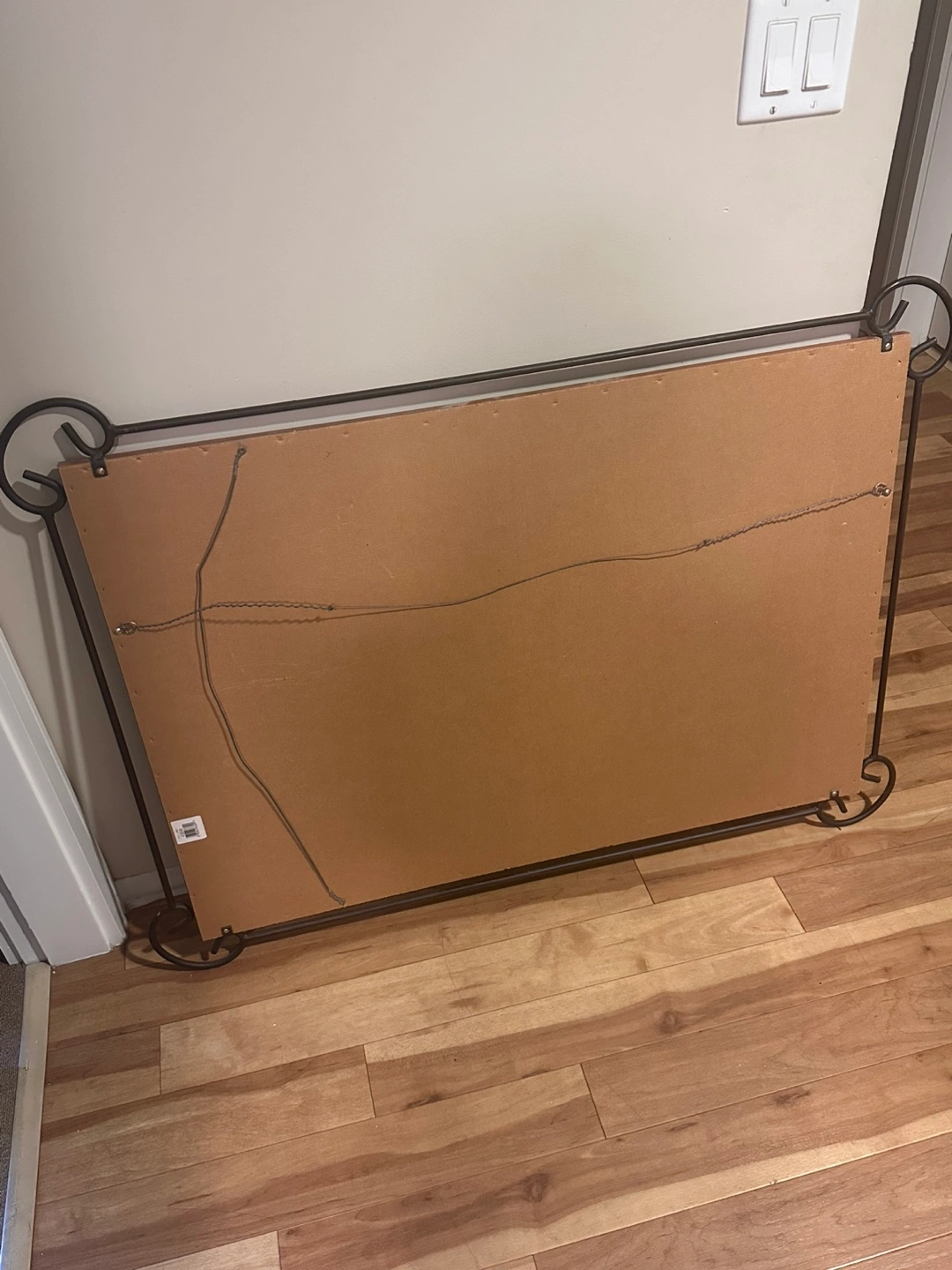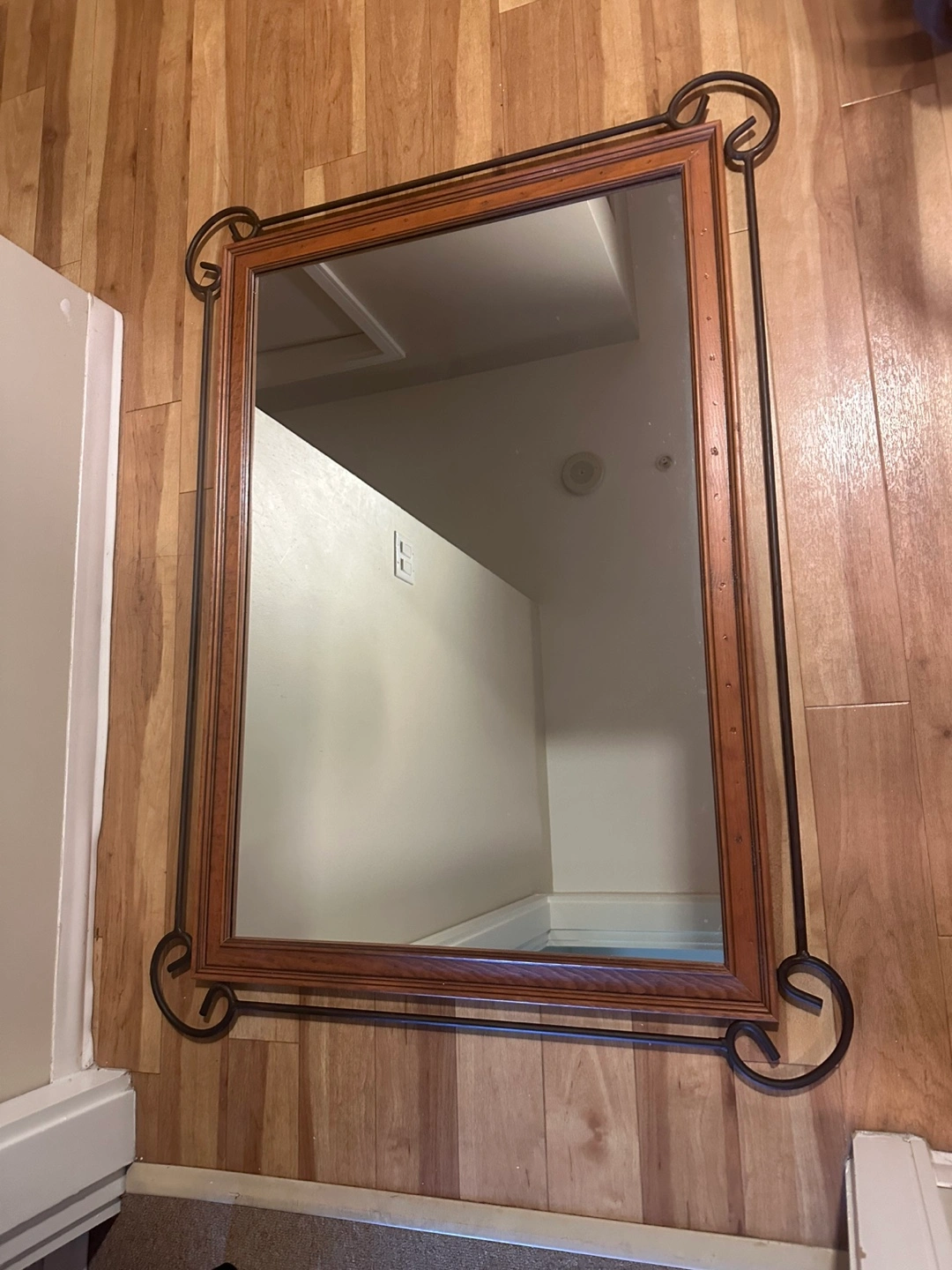42This is a nice wall mirror with a wood and metal frame. It’s in good shape and ready to hang. It has two strong strings, so you can hang it up either sideways or up-and-down. Looks very fancy and will make any room look nicer! 71cmx101cm