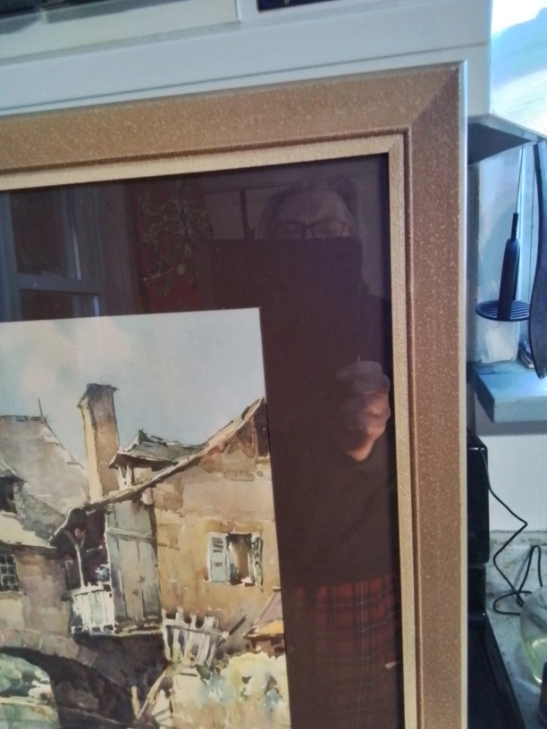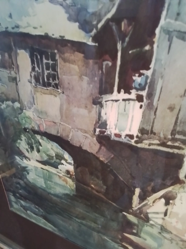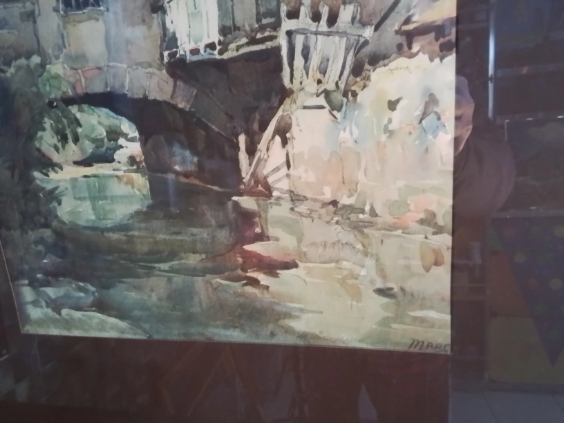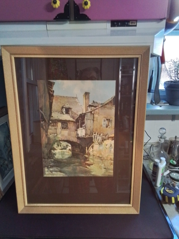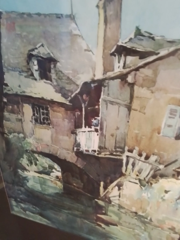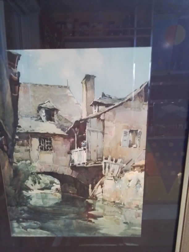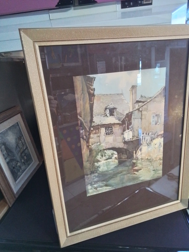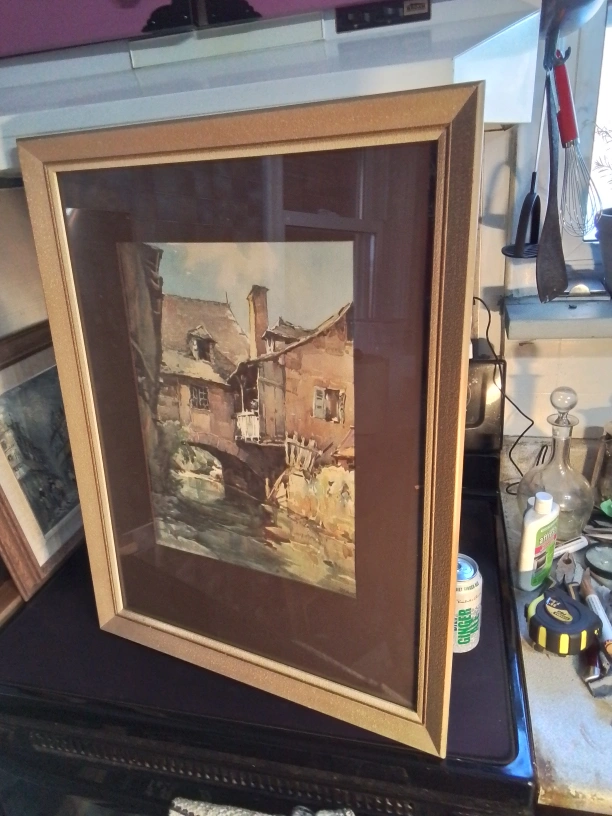 Framed Watercolor Painting of European Village Scene Vintage Signed 'Marc' Framed Watercolor Painting Lovely framed watercolor painting. Depicts a quaint European village scene with a bridge over a waterway. Features aged buildings and lush greenery. Presented in a golden-coloured frame. A lovely addition to any home. 20X26" H. Very good condition. Please See photos for more details. Pickup at Young Street and Steels Ave