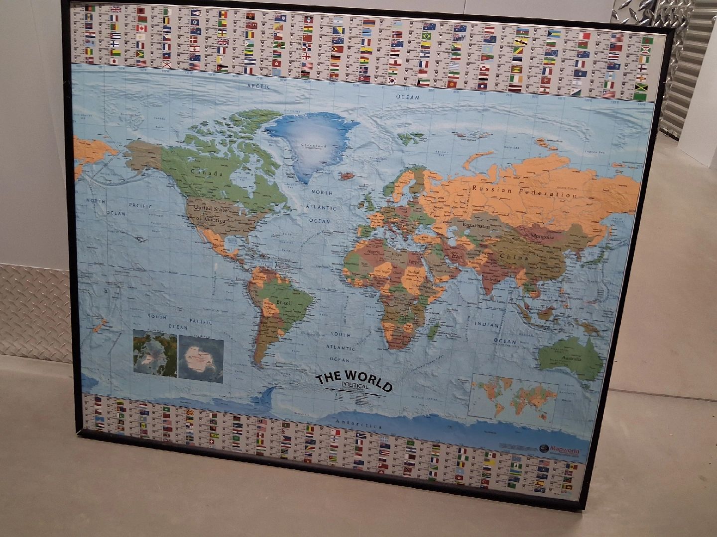 10Selling a framed world political map. It features country borders and names, plus a border of country flags around the edges. Great for a classroom or home office