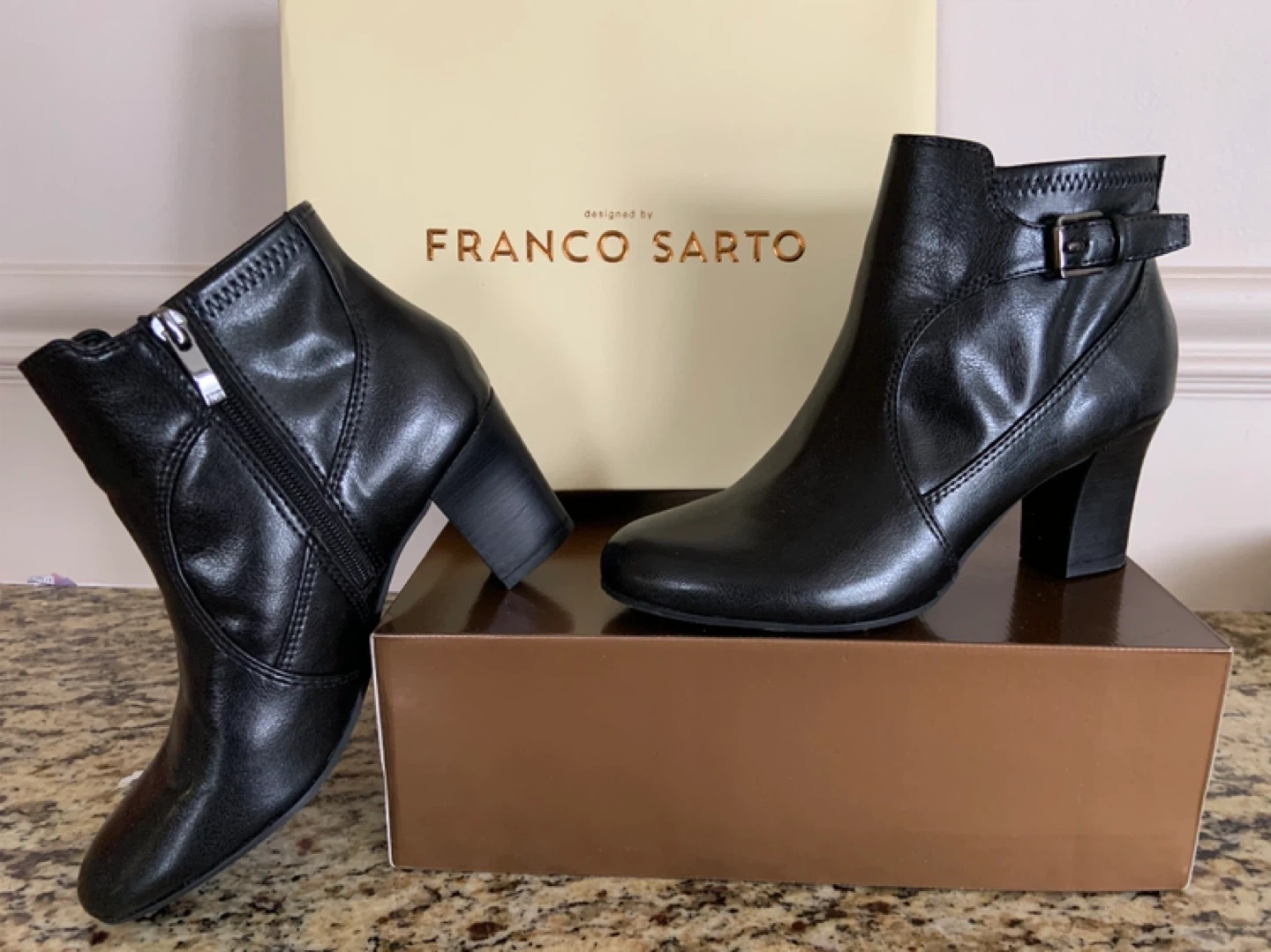10Franco Sarto black leather ankle boots in size 6.5M. These stylish boots feature a comfortable heel height of approximately 2 inches and a shaft height around 6.5 inches. The original box is included. Originally bought for $150!