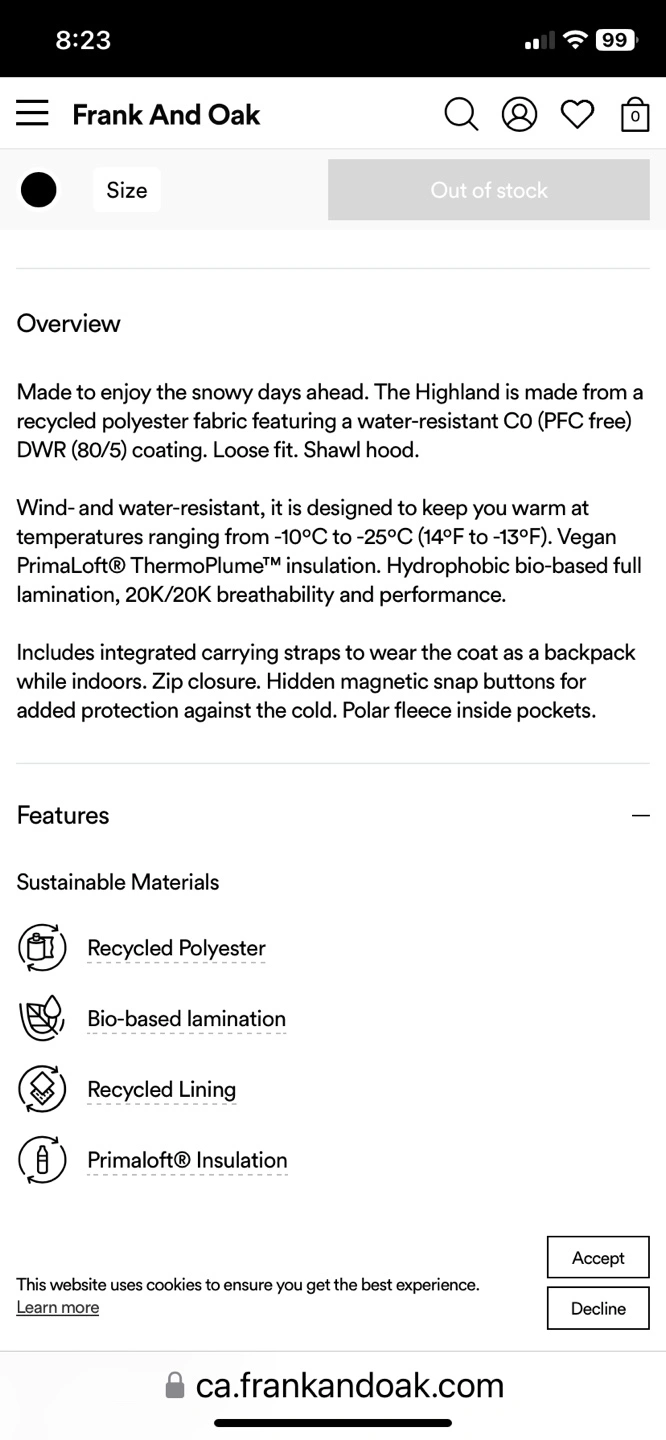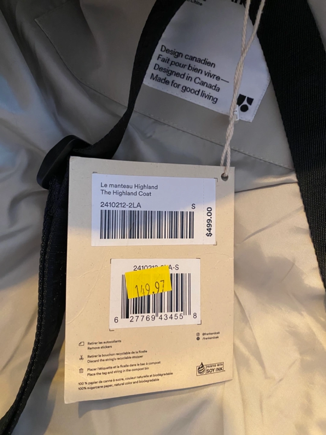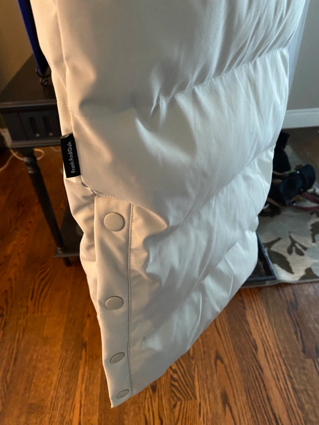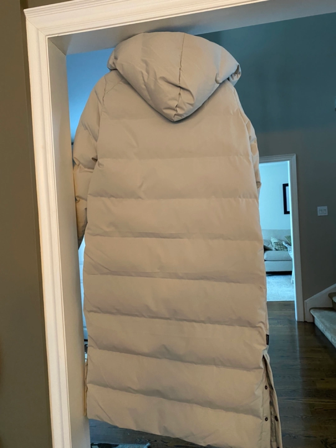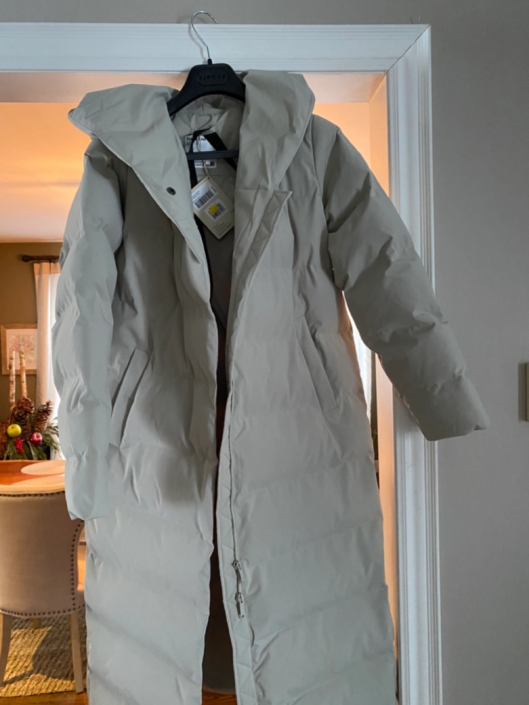 Brand new .Tag attached. Original price $499 now $150. Long puffer coat. Light beige colour. Size small. Water-resistant. Primaloft insulation. Recycled polyester. Features a shawl hood and integrated carrying straps. Can be worn as a backpack.