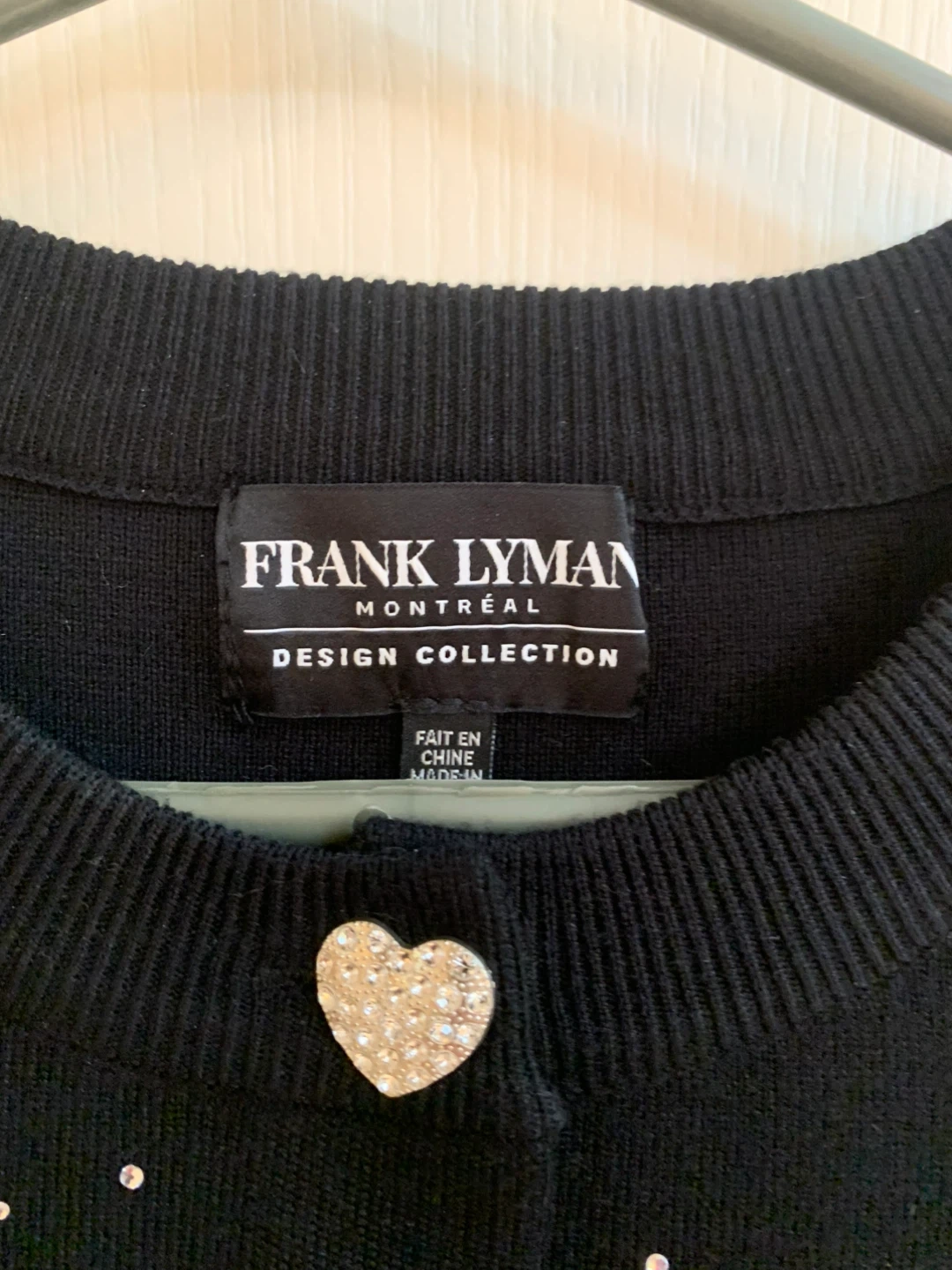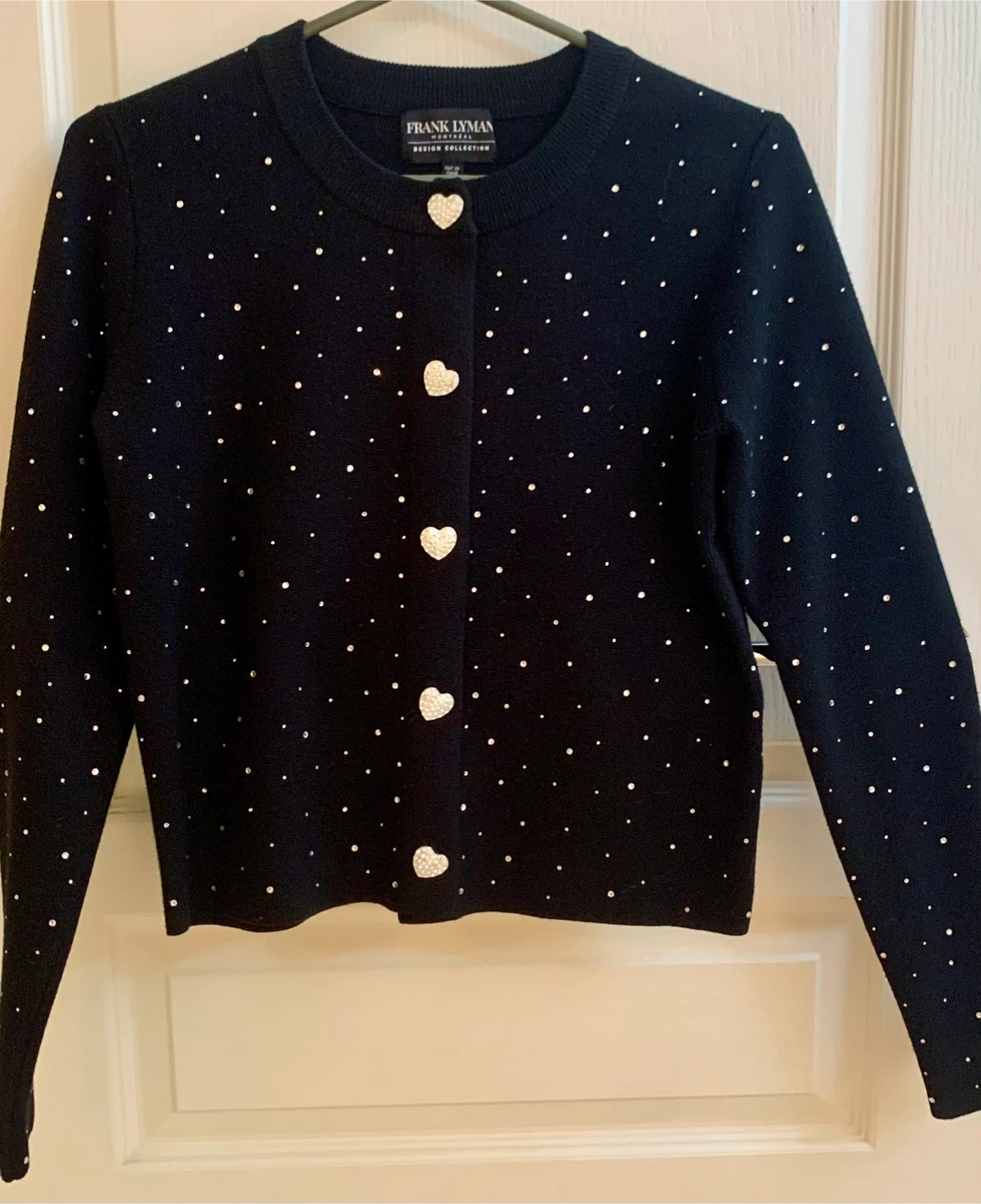 Selling a Frank Lyman Montreal Design Collection cardigan. It's a size S/P and features cute heart-shaped buttons. The cardigan is black with sparkly details throughout, adding a touch of elegance to any outfit. Was $240 new but bought too small.
