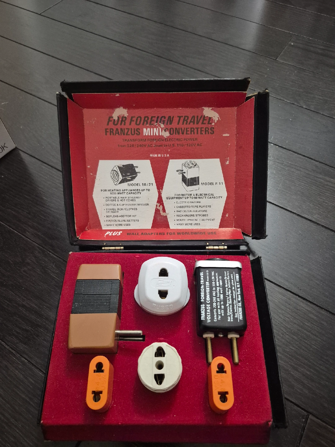 Selling a Franzus TK-7 Travel Converter Kit! A functional and collectible piece of travel history. It includes various adaptors for worldwide use.