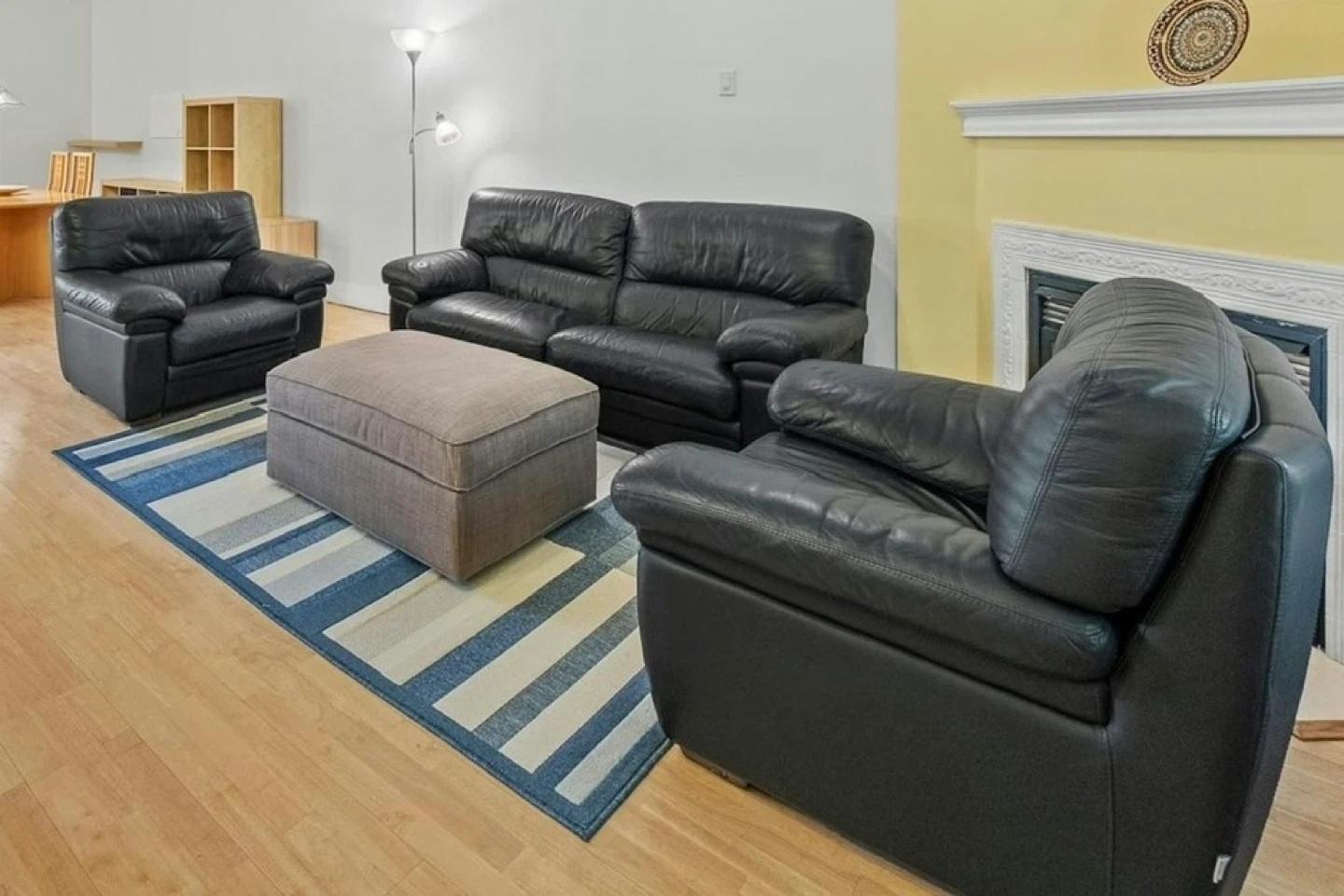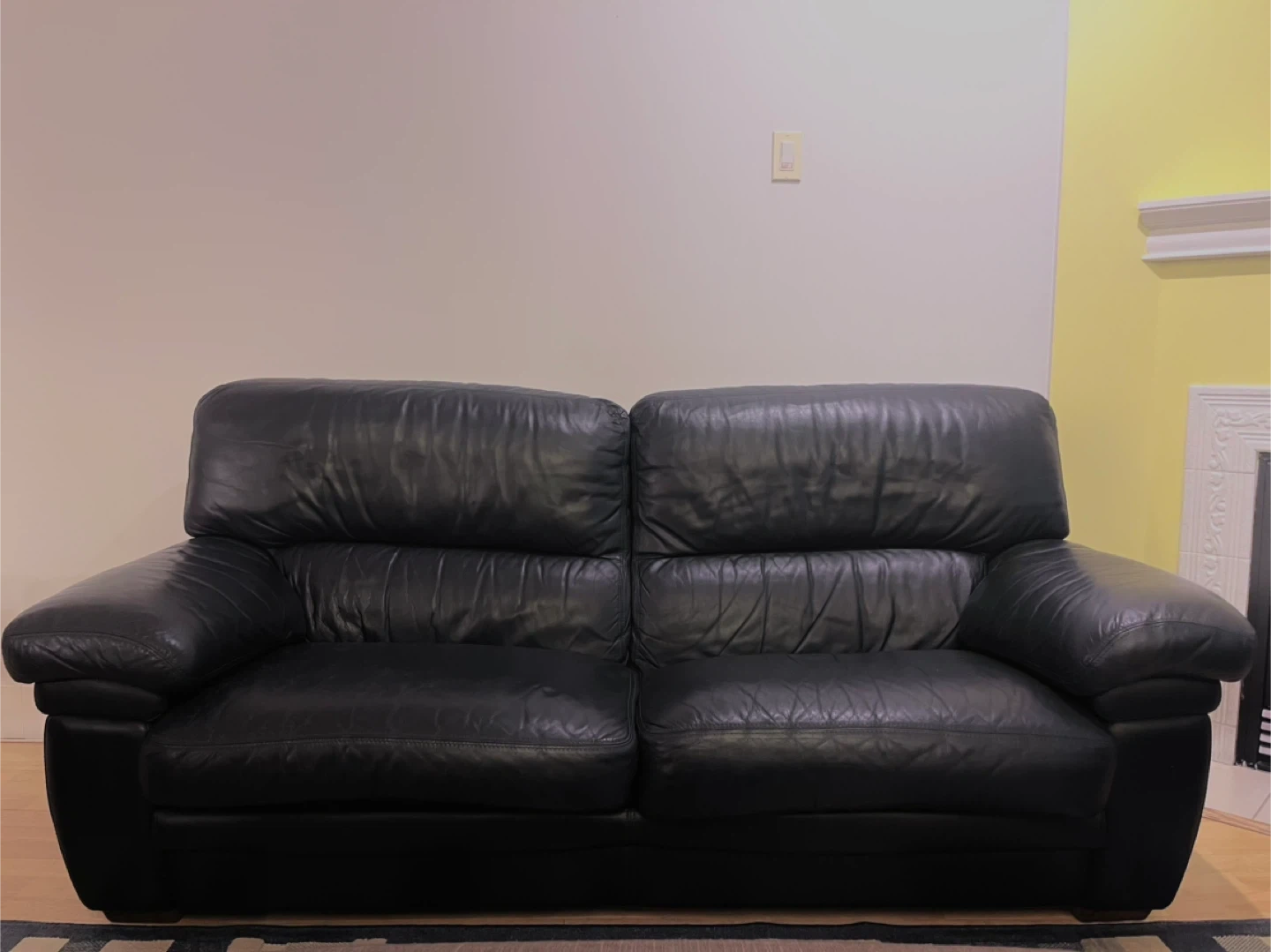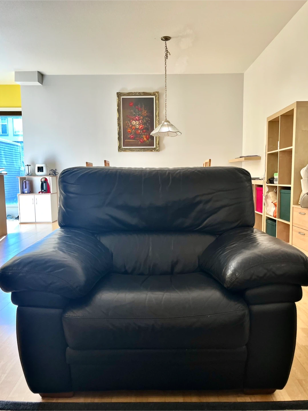 69MOVING OUT GIVEAWAY! A BARDI living room set (one sofa and two armchairs; black). Genuine leather, Italian handcrafted - Durable, Comfy, and Long-lasting. Removable cushions, easy cleaning. Good condition, fully functional (some minor wear from use). Approximate measurements: - Sofa: width 194cm x depth 80cm x height 88cm, seat height 40cm - Armchair: width 100cm x depth 80cm x height 88cm, seat height 40cm *Pick up only. Located on second floor - will need to be carried down one flight of stairs.