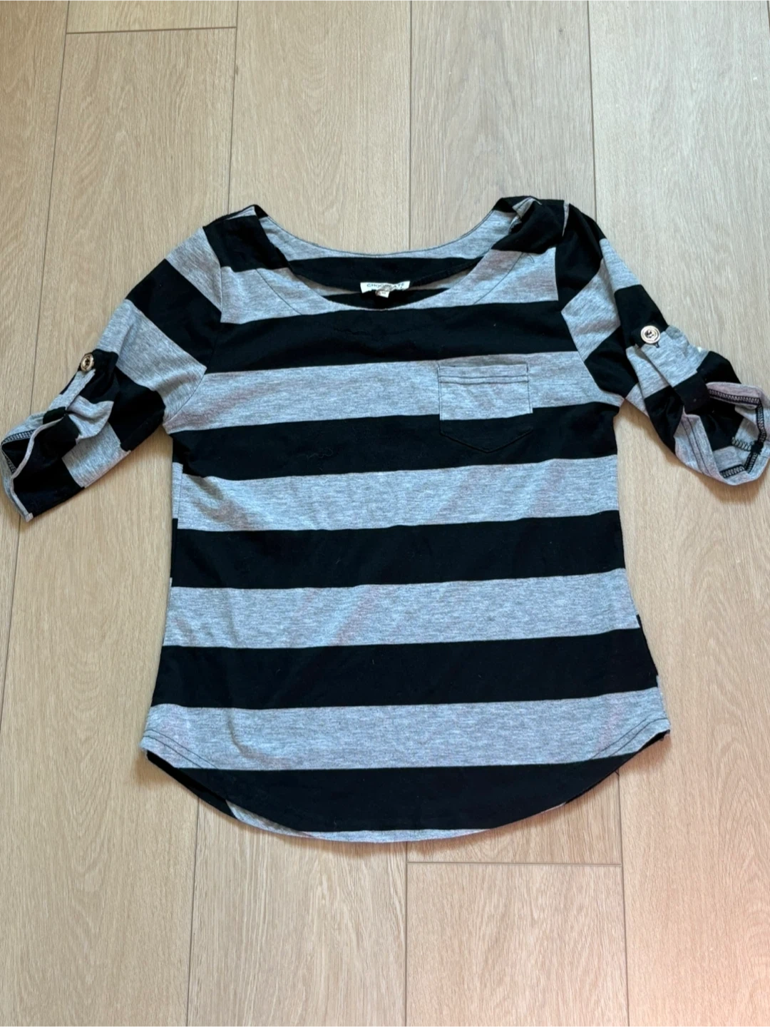621Cute striped top with 3/4 sleeves It's a size medium and features a pocket on the front. The sleeves can be rolled up and buttoned. Perfect for a casual look! Porch Pickup near Main subway station/Danforth go station (near Ted Reeves park). Specific address to be provided. I do not deliver.