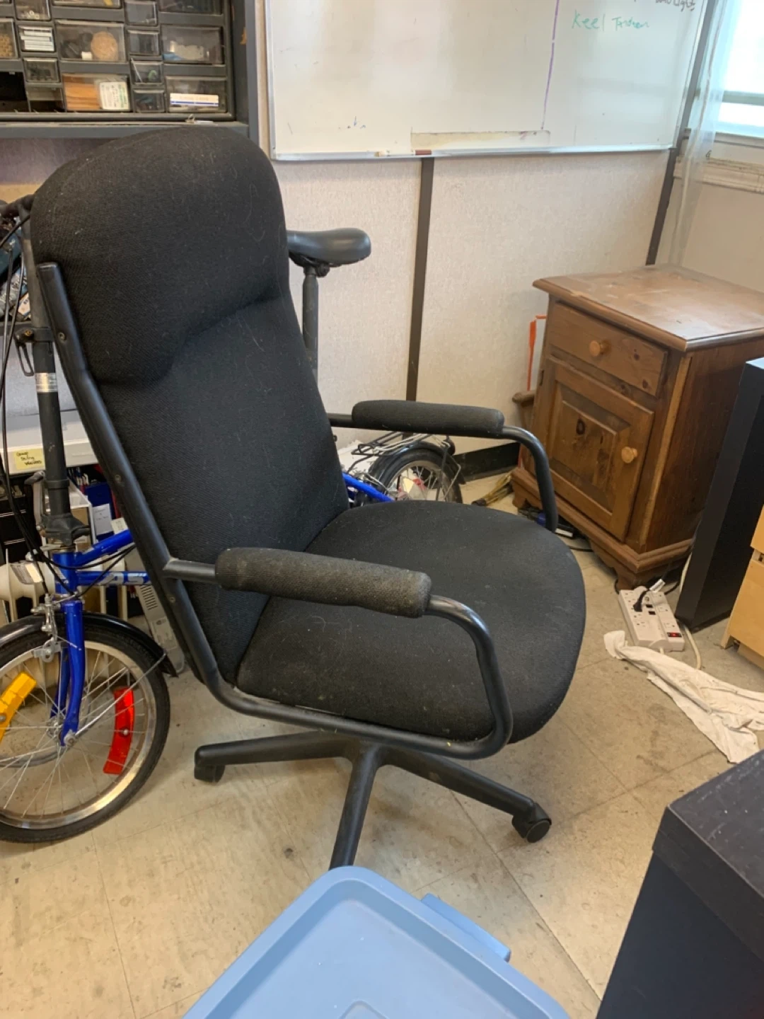 149Giving away a black office chair in used condition. It has a high back and armrests, perfect for working from home or in the office. It's a standard size and the material is a durable fabric. It has some signs of wear, needs a good cleaning but is still functional and comfortable, and only shows light signs of wear