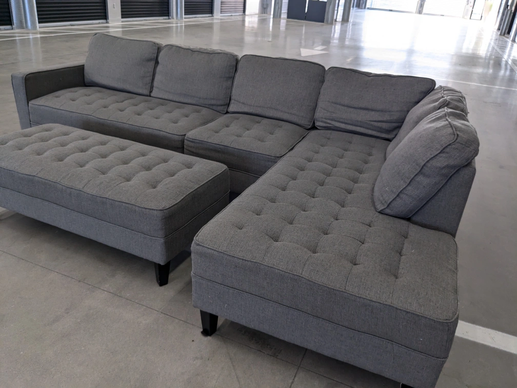 114 inches in length, chaise is 6 ft long and the chair width is 35 inches. Ottoman is 51 inches long. Couch is comfy! There's no damages or stains, smoke and pet free. Some cushion pilling due to the wooly material but otherwise great couch