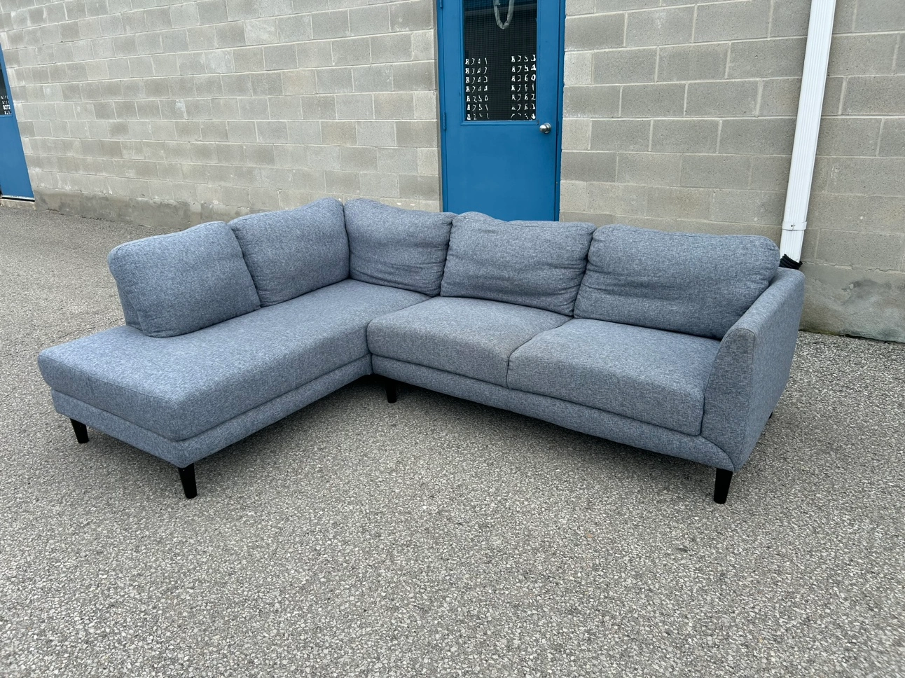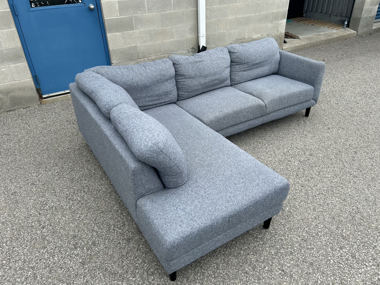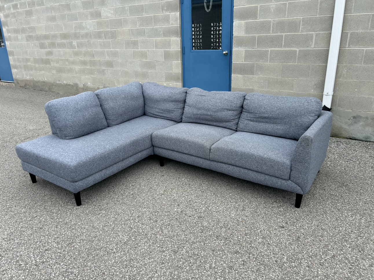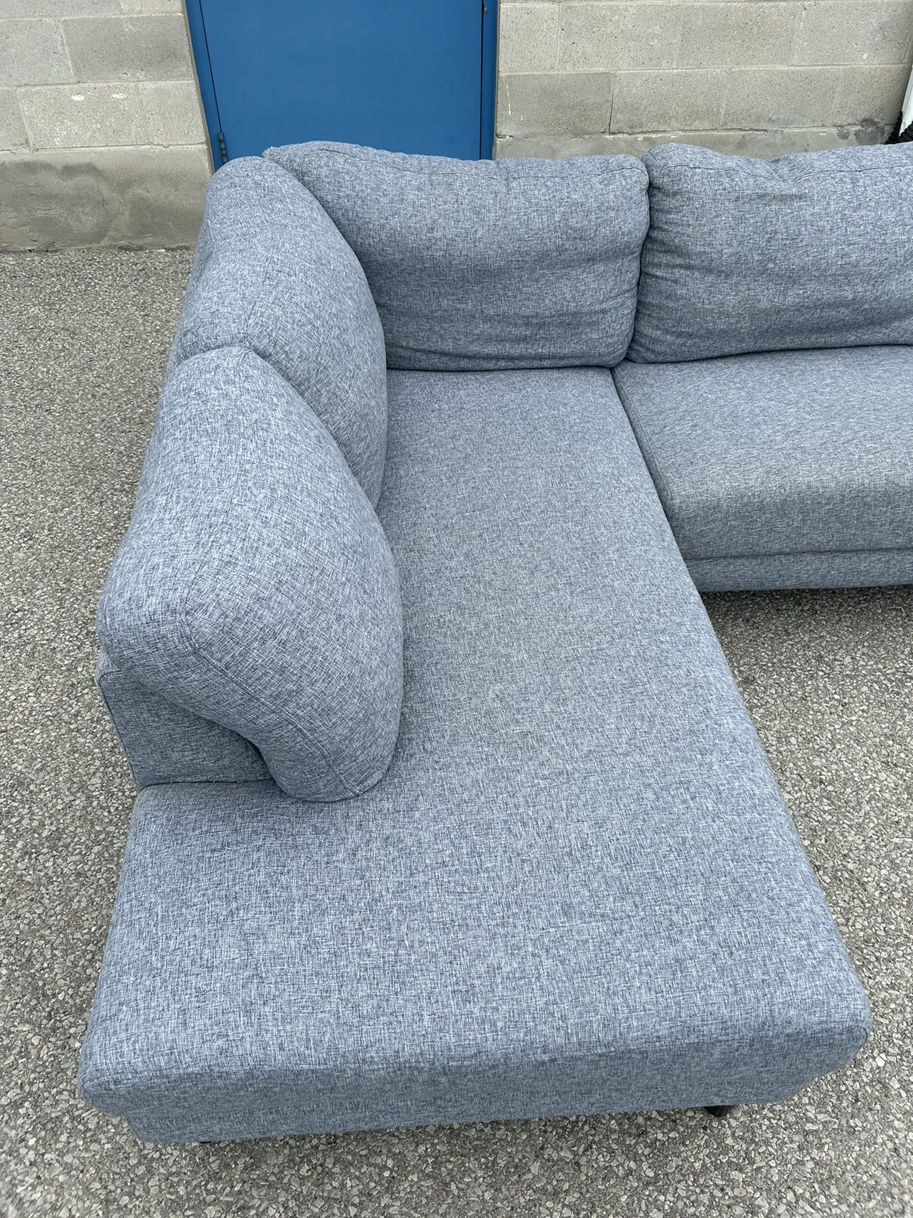 **SAME DAY FREE DELIVERY AVAILABLE** $450/OBO Description - Sectional shaped couch - Colour: Grey - comes in pieces for easy transport (2) - comfy - nice design - some wear / lint pile up - no major stains/marks - L: 100” x W: 76” x H:30” (approx) First come first serve! **SAME DAY FREE DELIVERY AVAILABLE**