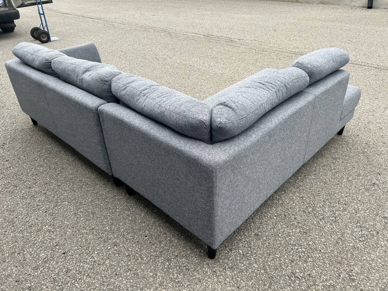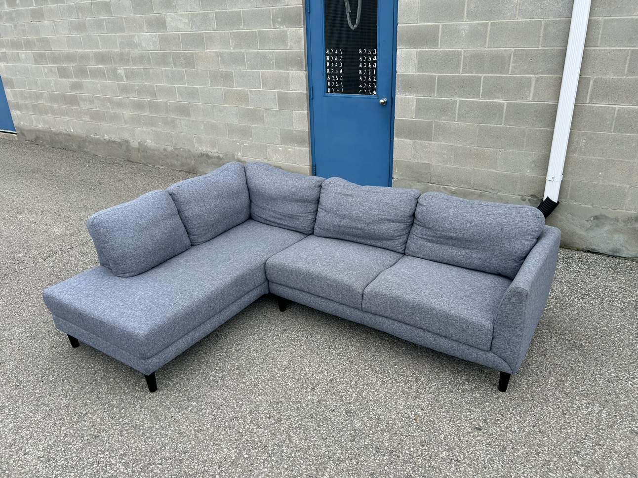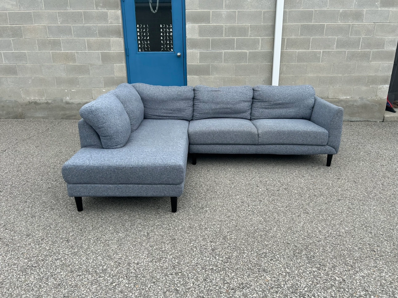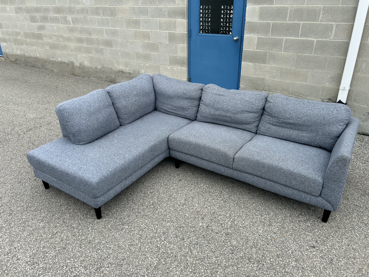 **SAME DAY FREE DELIVERY AVAILABLE** $450/OBO Description - Sectional shaped couch - Colour: Grey - comes in pieces for easy transport (2) - comfy - nice design - some wear / lint pile up - no major stains/marks - L: 100” x W: 76” x H:30” (approx) First come first serve! **SAME DAY FREE DELIVERY AVAILABLE**