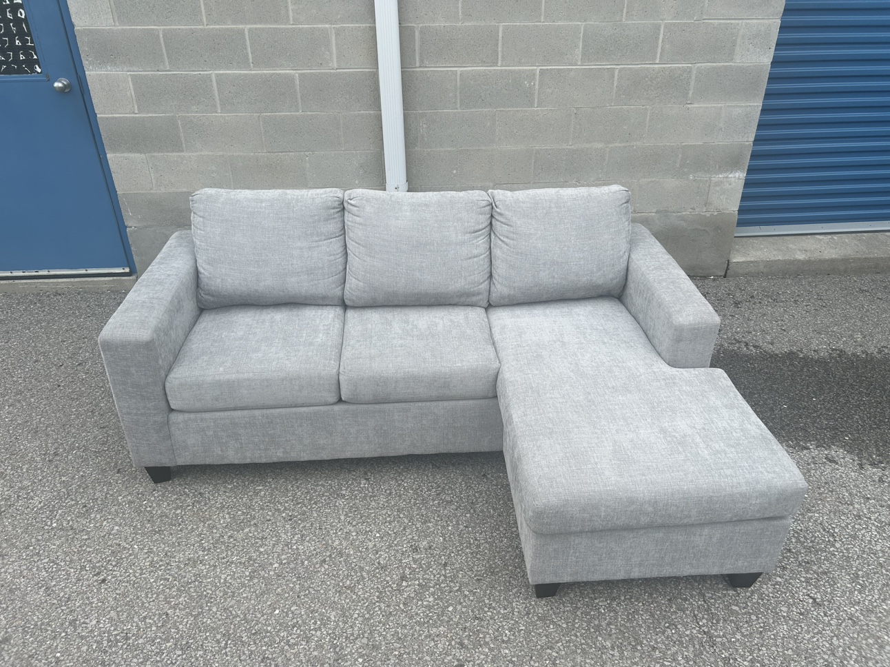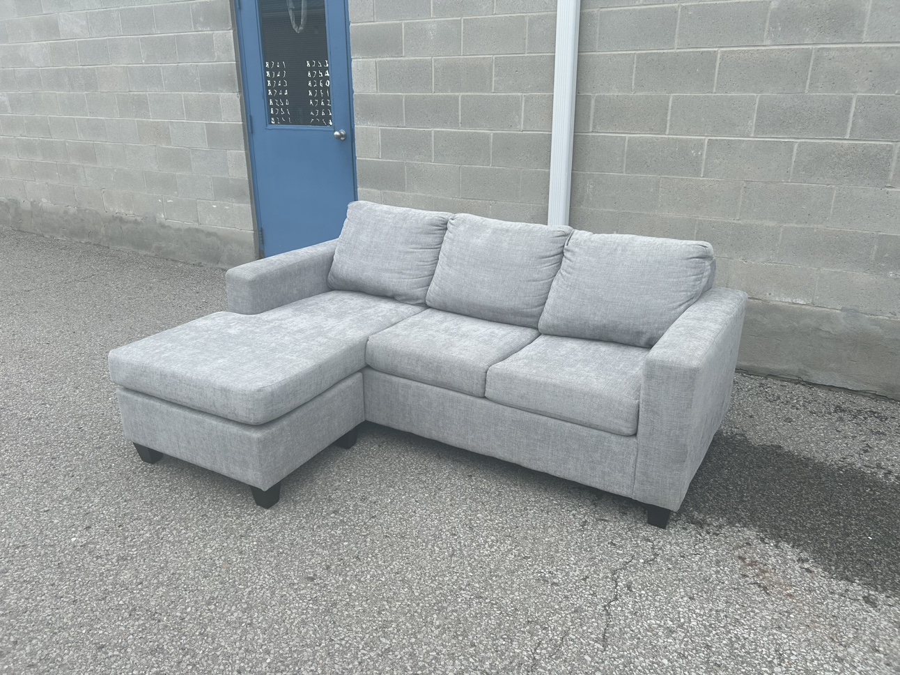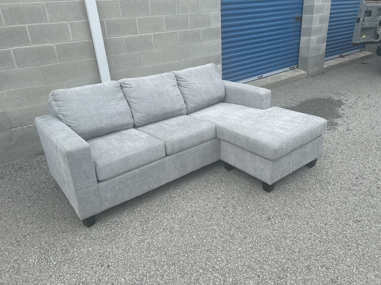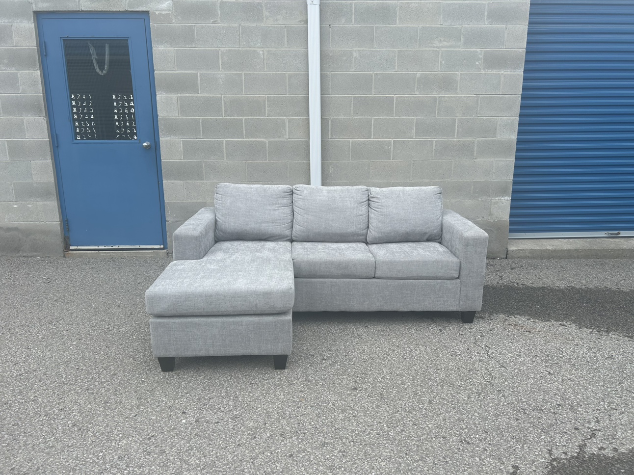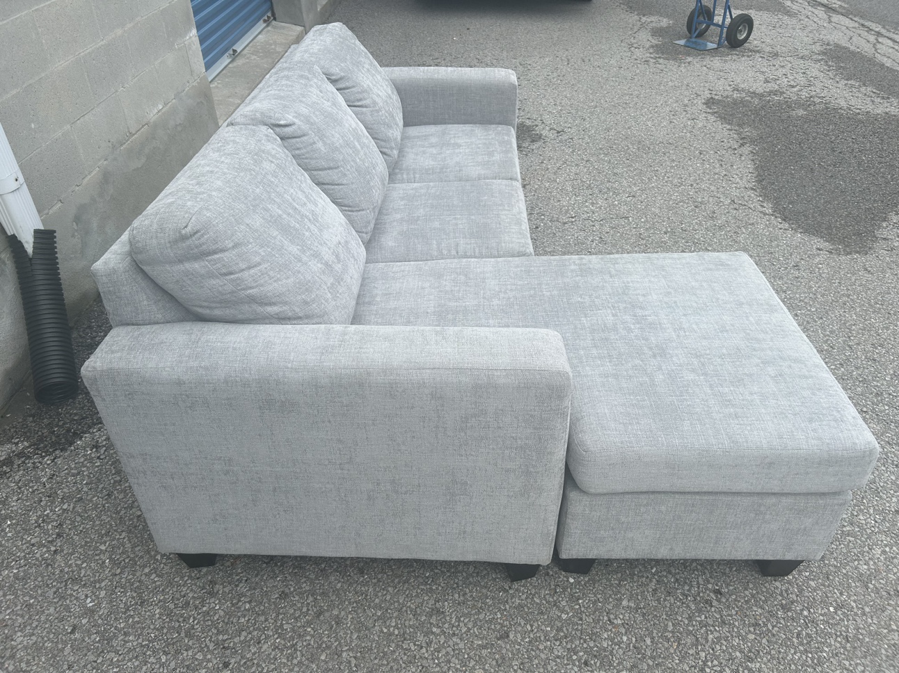 **SAME DAY FREE DELIVERY AVAILABLE** $500/OBO Description - Sectional shaped couch - Colour: Grey - comes in pieces for easy transport (2) - cushions come off to be washed - reversible chaise - comfy - nice design - minor wear - no major stains/marks - L: 82” x W: 60” x H:30” (approx) - 9.5/10 condition First come first serve! **SAME DAY FREE DELIVERY AVAILABLE**
