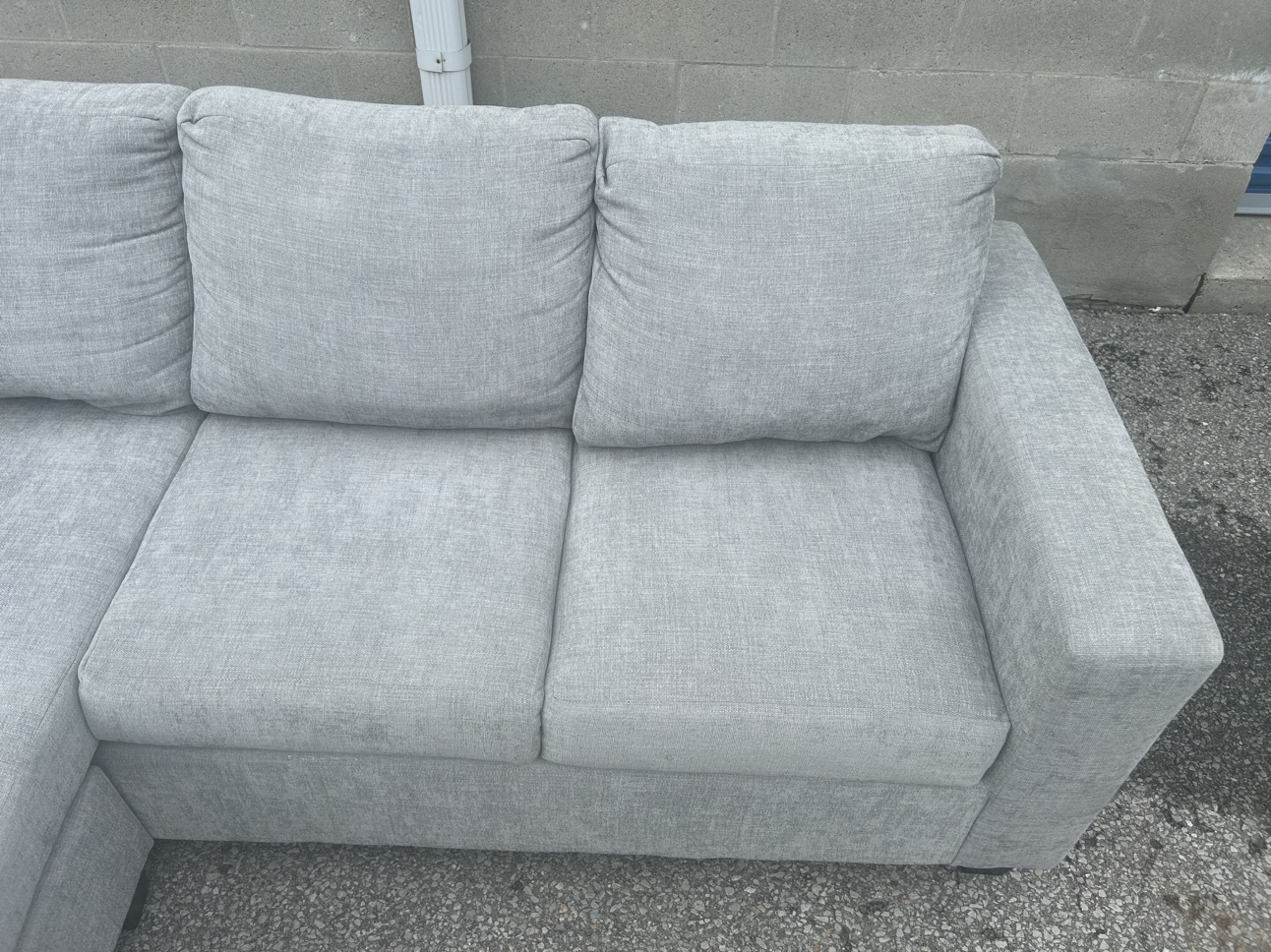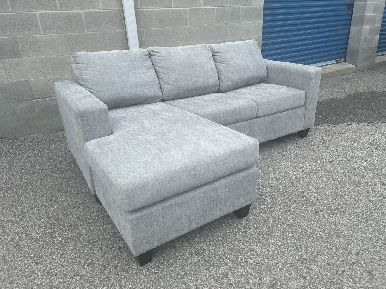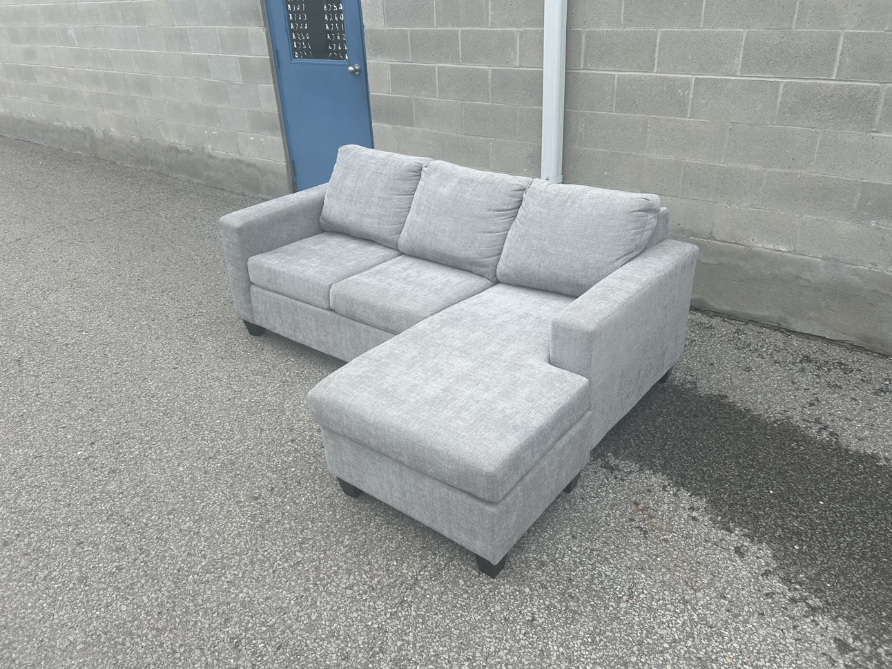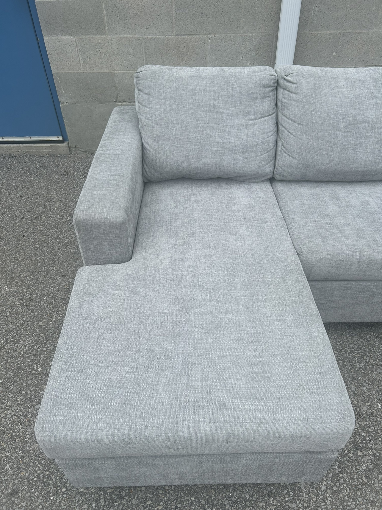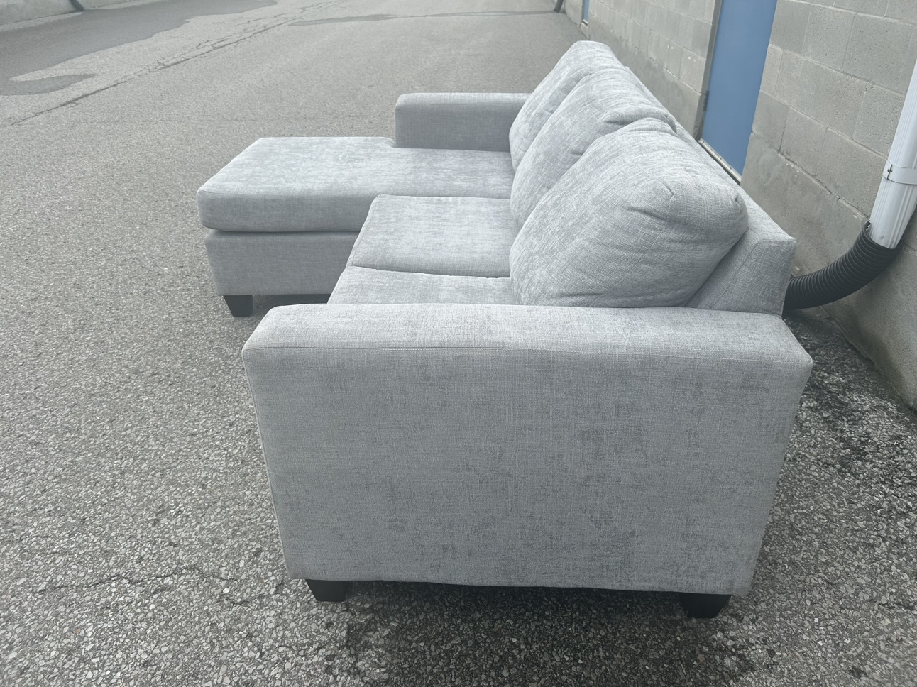 **SAME DAY FREE DELIVERY AVAILABLE** $500/OBO Description - Sectional shaped couch - Colour: Grey - comes in pieces for easy transport (2) - cushions come off to be washed - reversible chaise - comfy - nice design - minor wear - no major stains/marks - L: 82” x W: 60” x H:30” (approx) - 9.5/10 condition First come first serve! **SAME DAY FREE DELIVERY AVAILABLE**