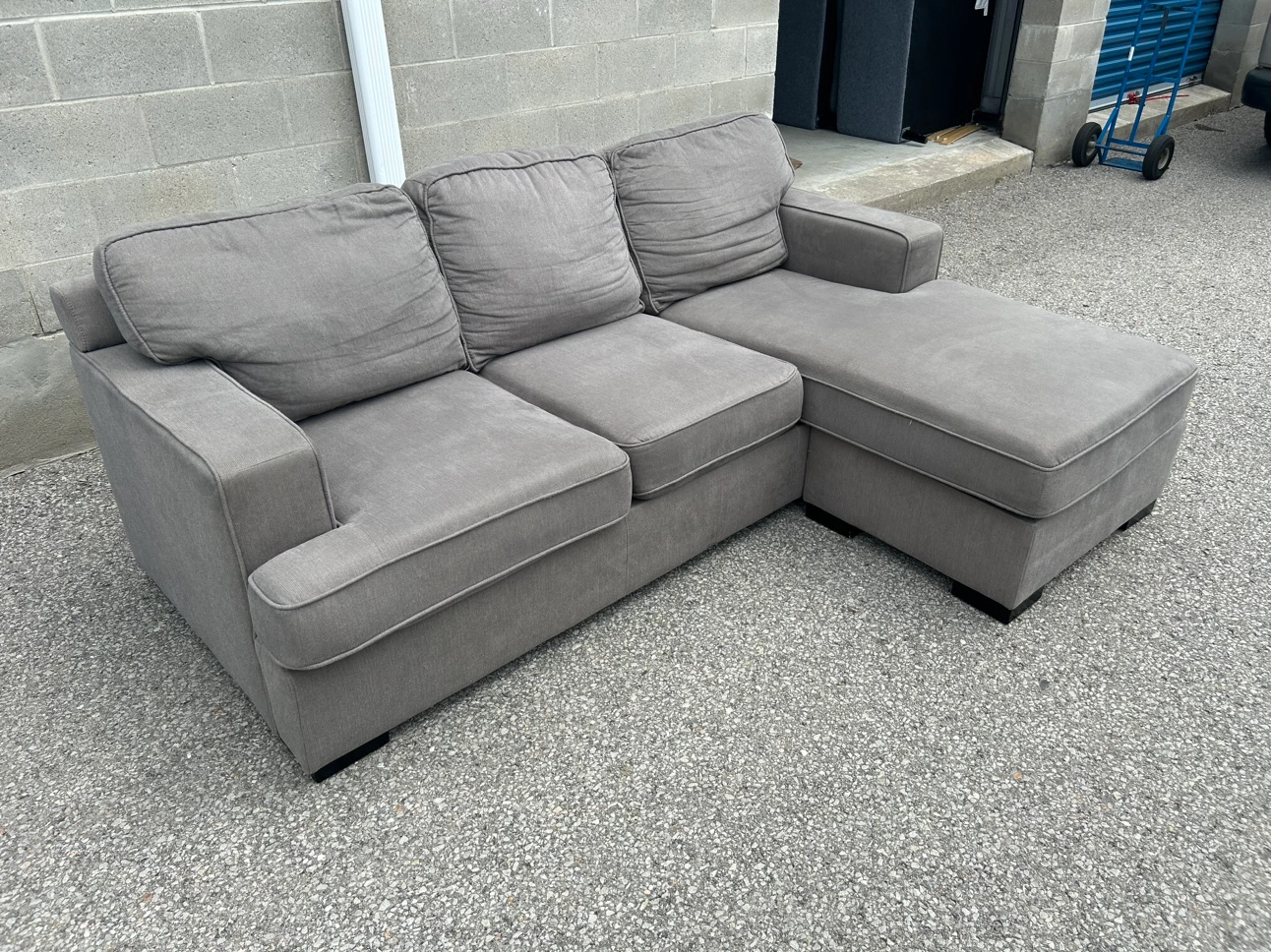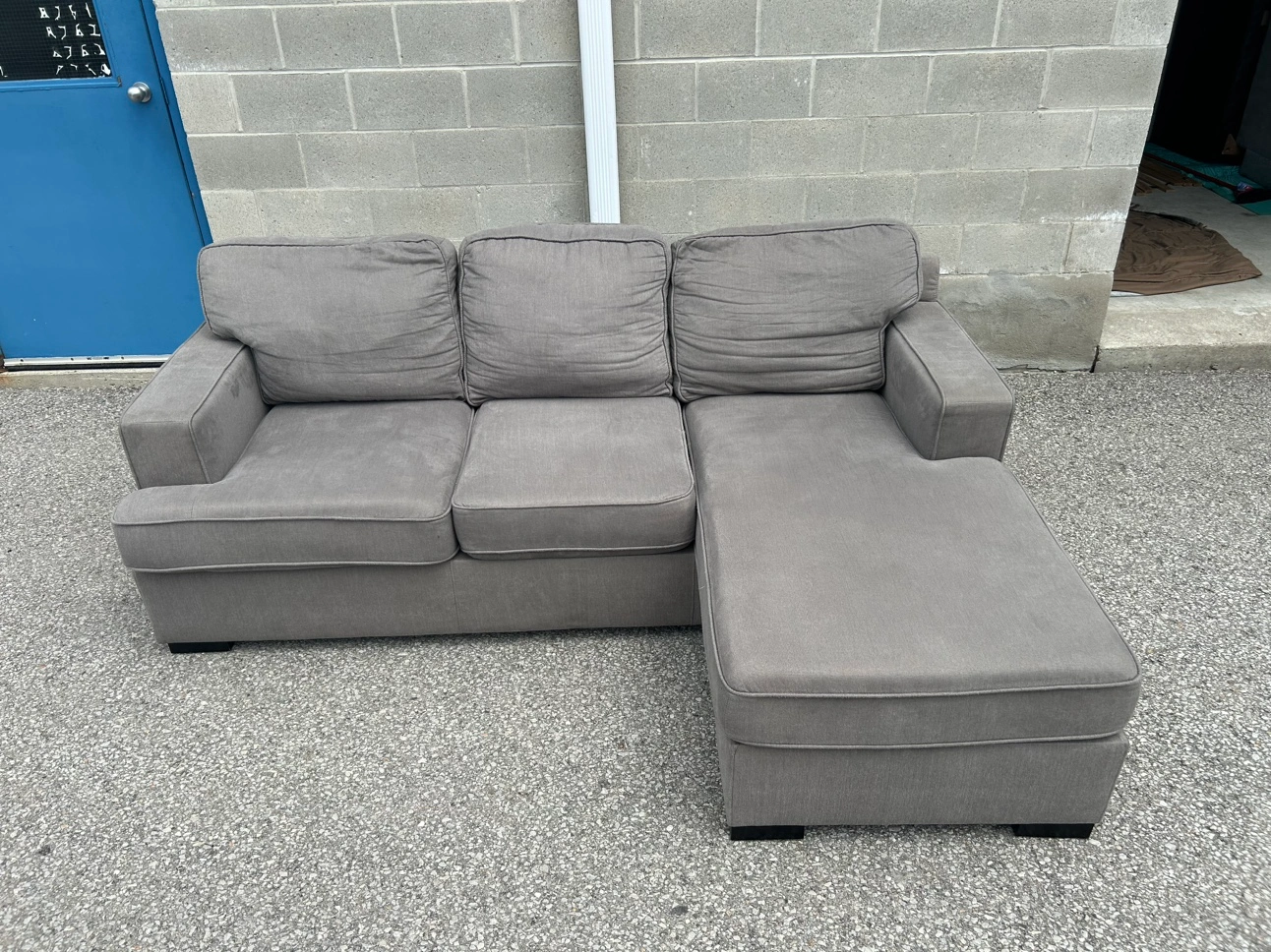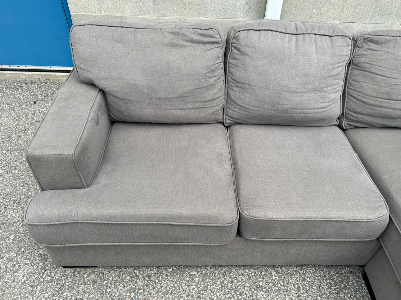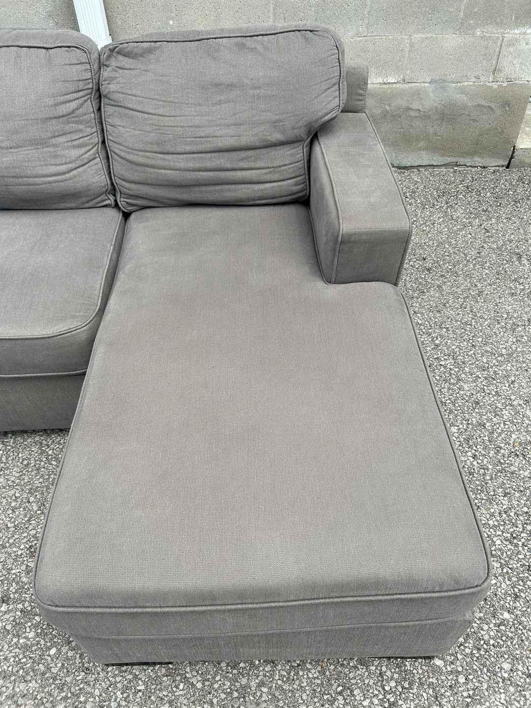 **SAME DAY FREE DELIVERY AVAILABLE** $450/OBO Description - sectional couch / l shape couch / corner couch - Colour: grey - pullout bed w/ mattress - small storage compartment - comfy - nice design - washable cushions & pillows - can be dissembled for easy transporting - minor wear - no major marks/stain - L: 86” x W: 60” x H:30” (approx) First come first serve! **SAME DAY FREE DELIVERY AVAILABLE**