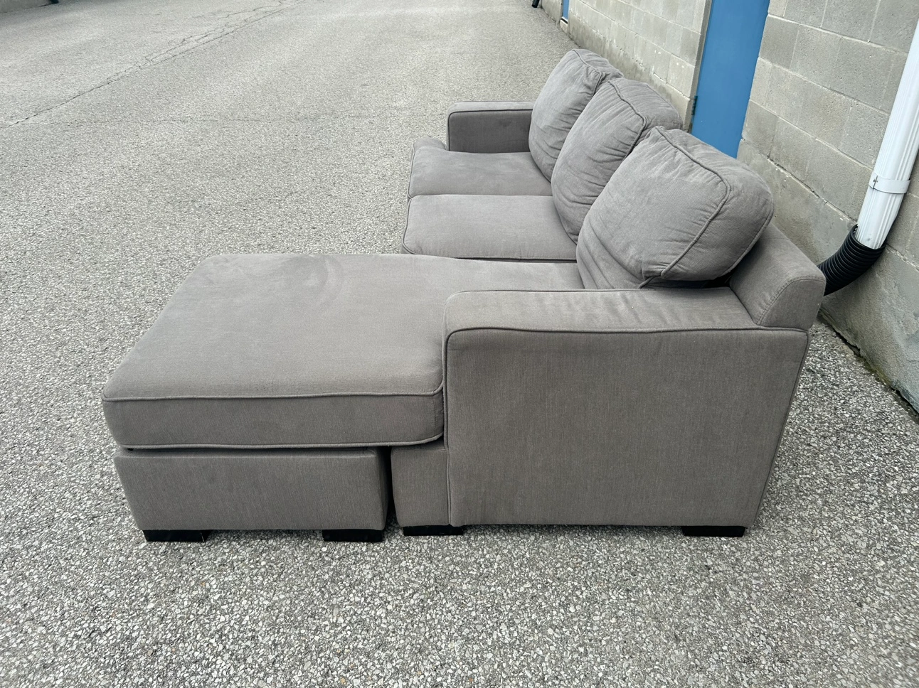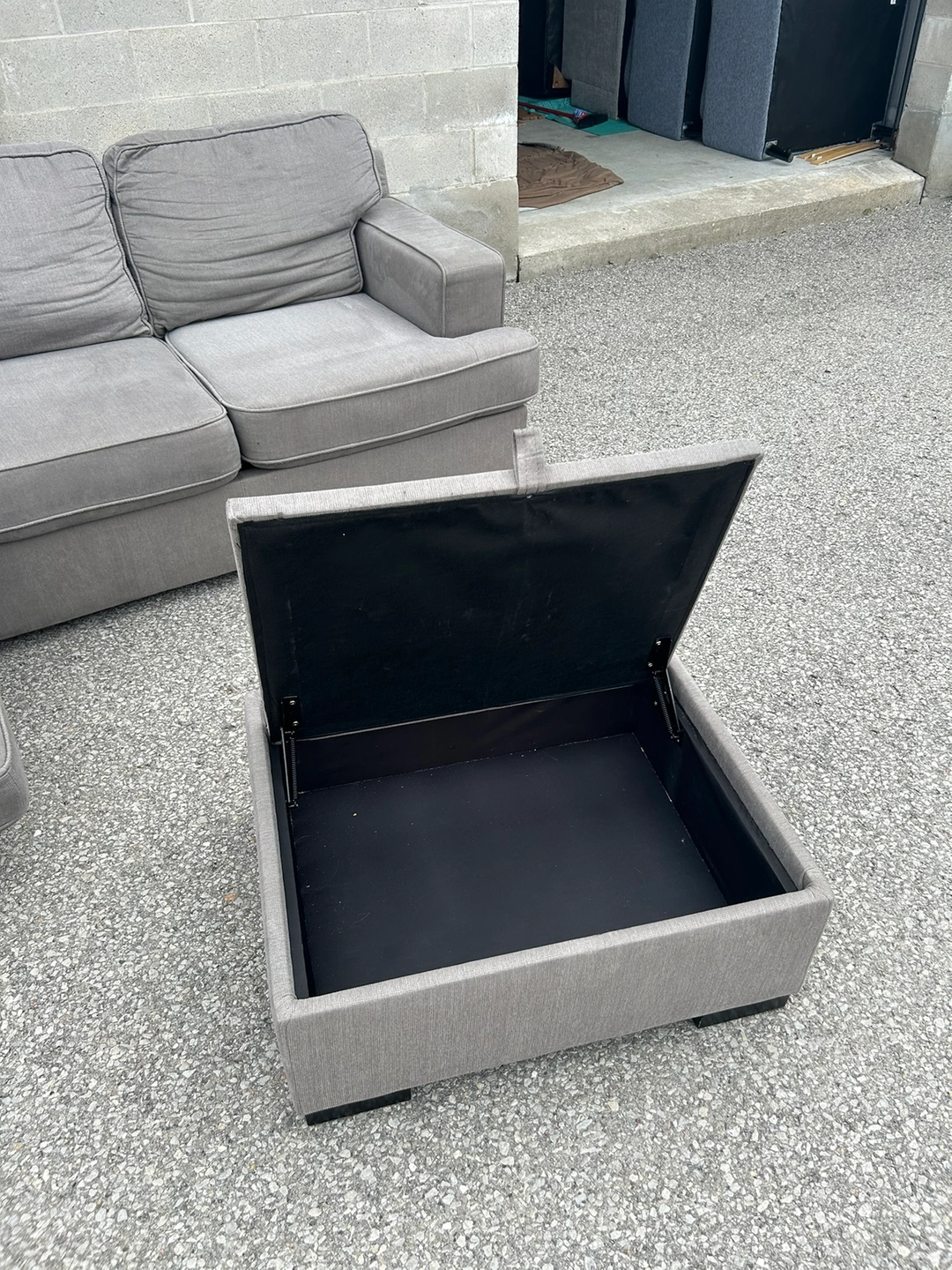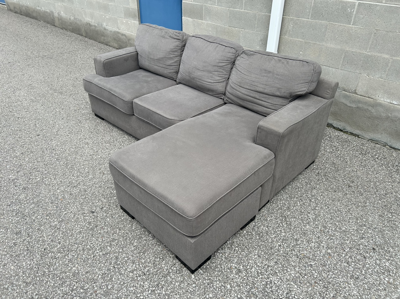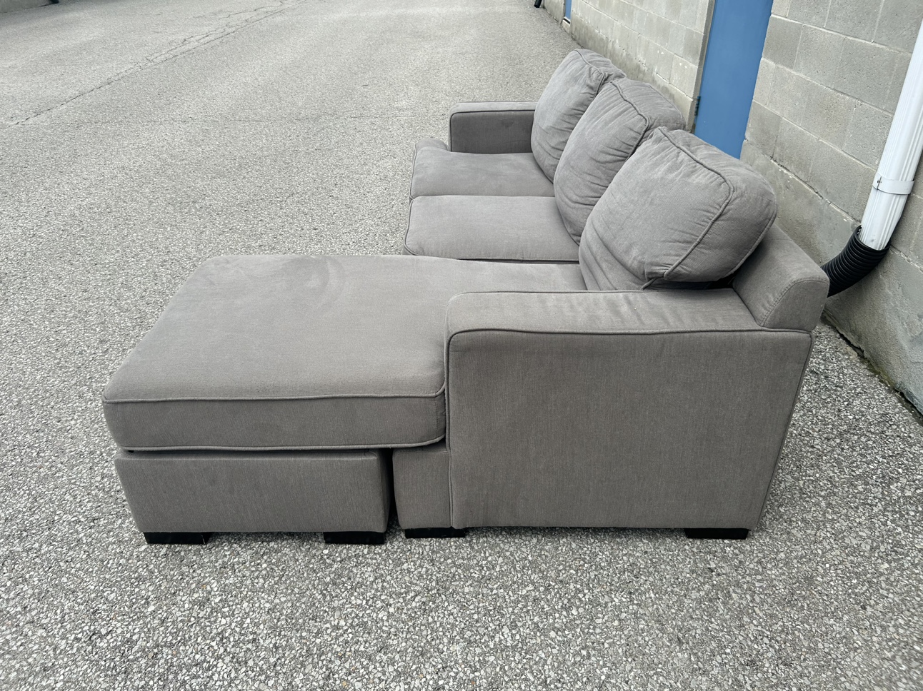 **SAME DAY FREE DELIVERY AVAILABLE** $450/OBO Description - sectional couch / l shape couch / corner couch - Colour: grey - pullout bed w/ mattress - small storage compartment - comfy - nice design - washable cushions & pillows - can be dissembled for easy transporting - minor wear - no major marks/stain - L: 86” x W: 60” x H:30” (approx) First come first serve! **SAME DAY FREE DELIVERY AVAILABLE**