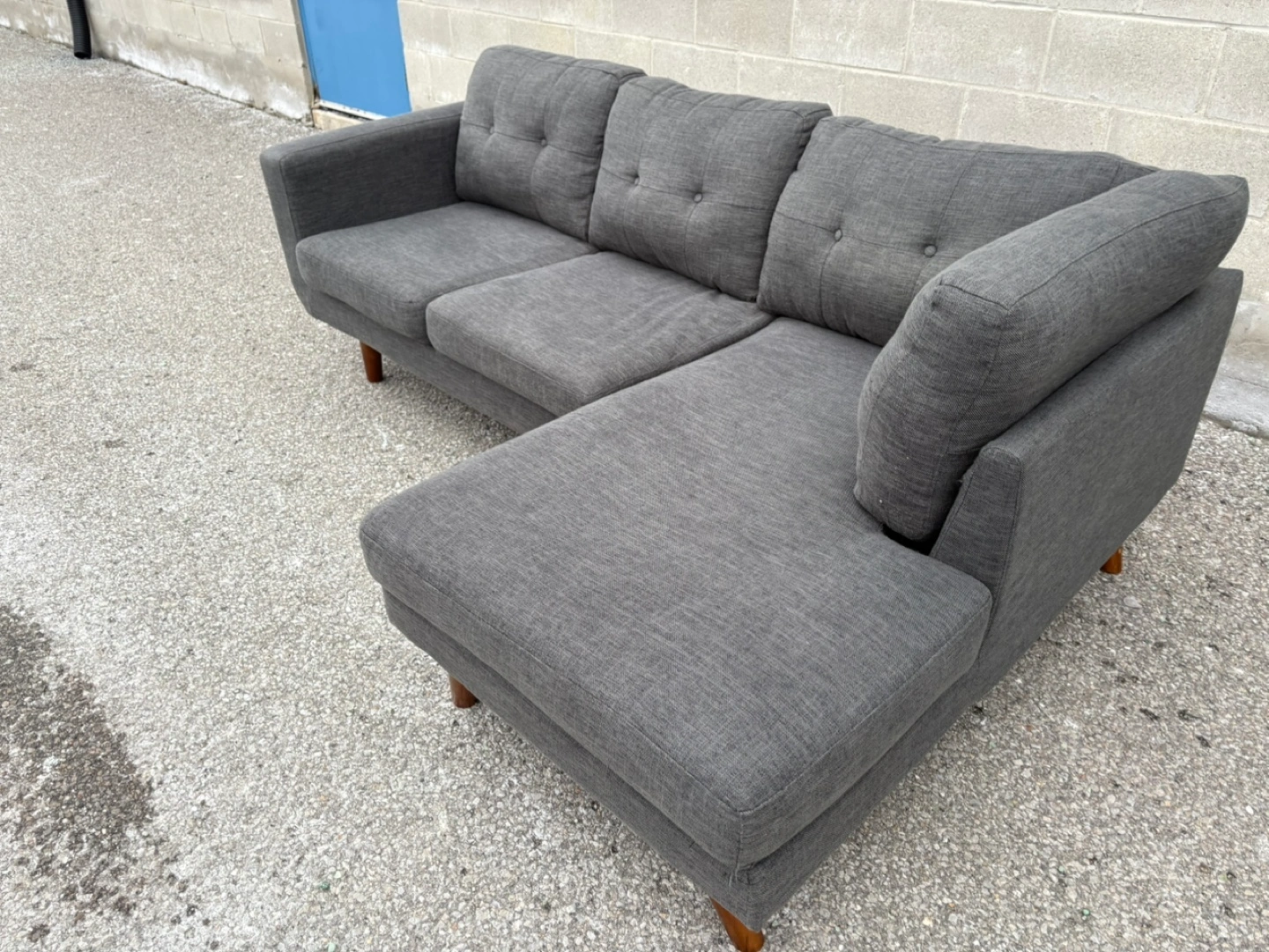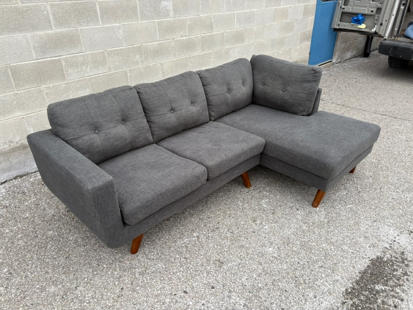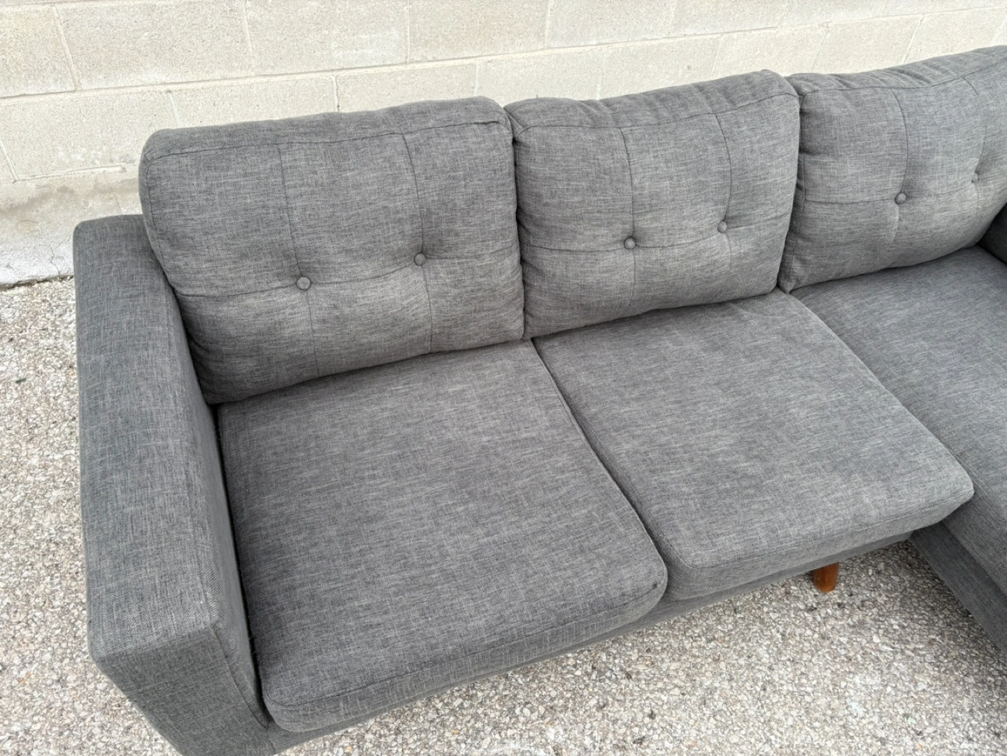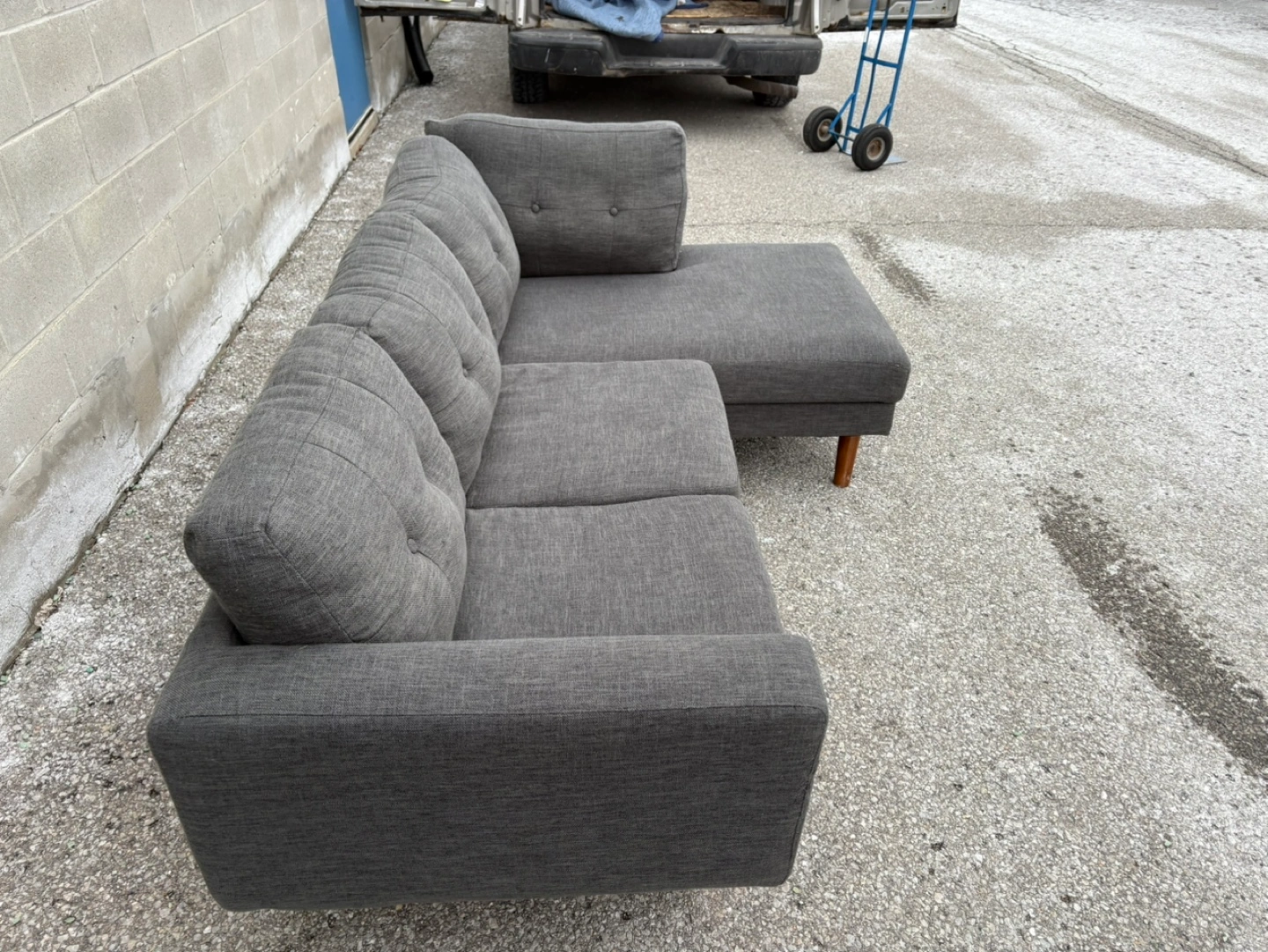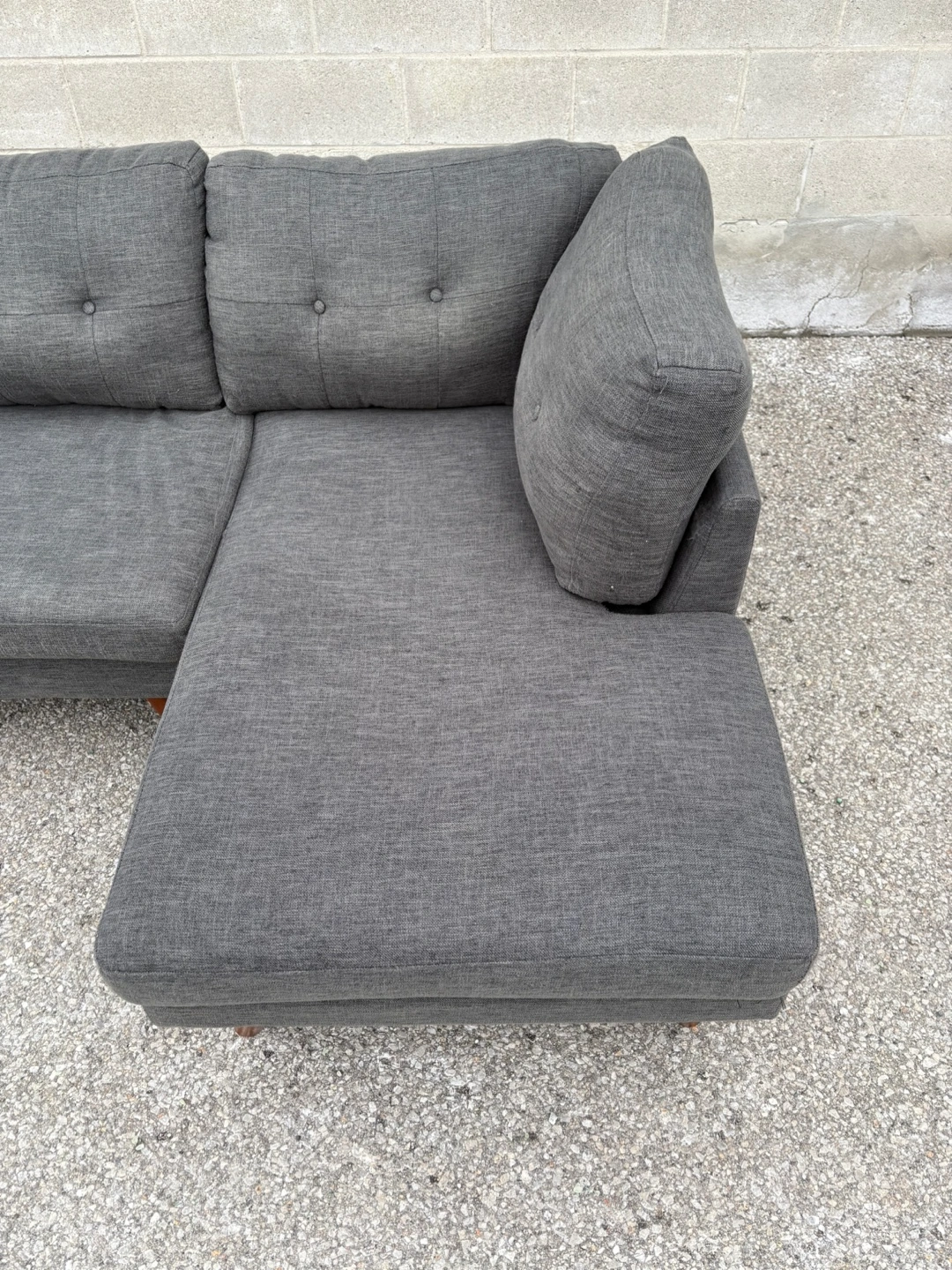 ✅ SAME DAY FREE DELIVERY AVAILABLE🚚💨 $300 🏷️ (OBO) ITEM DESCRIPTION: - Sectional shaped couch - cushions & pillows come off to be washed - Colour: Grey - comes in pieces for easy transport (2) - reversible chaise - comfy - nice design - some wear / fraying (as shown in images) - no major stains/marks MEASUREMENTS 📏: - L: 82” x W: 52” x H:30” (approx) ✅ SAME DAY FREE DELIVERY AVAILABLE ✅ ✨ALL ITEMS FIRST COME FIRST SERVE ✨