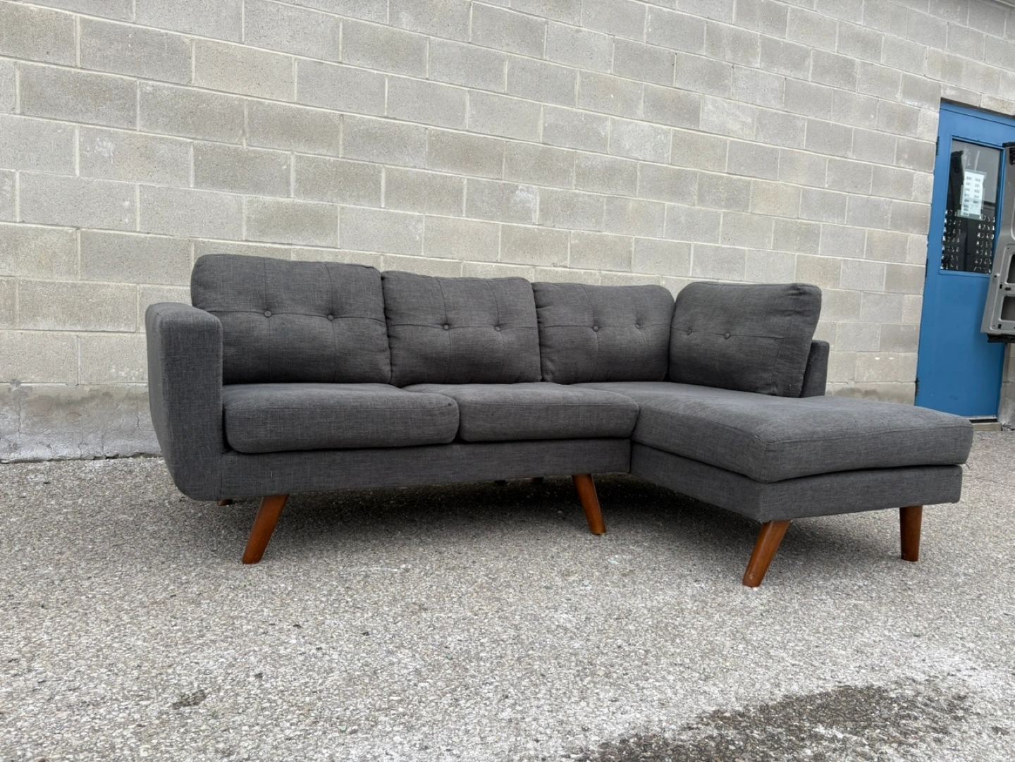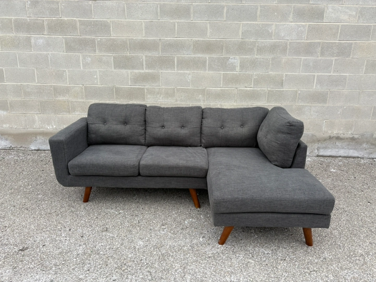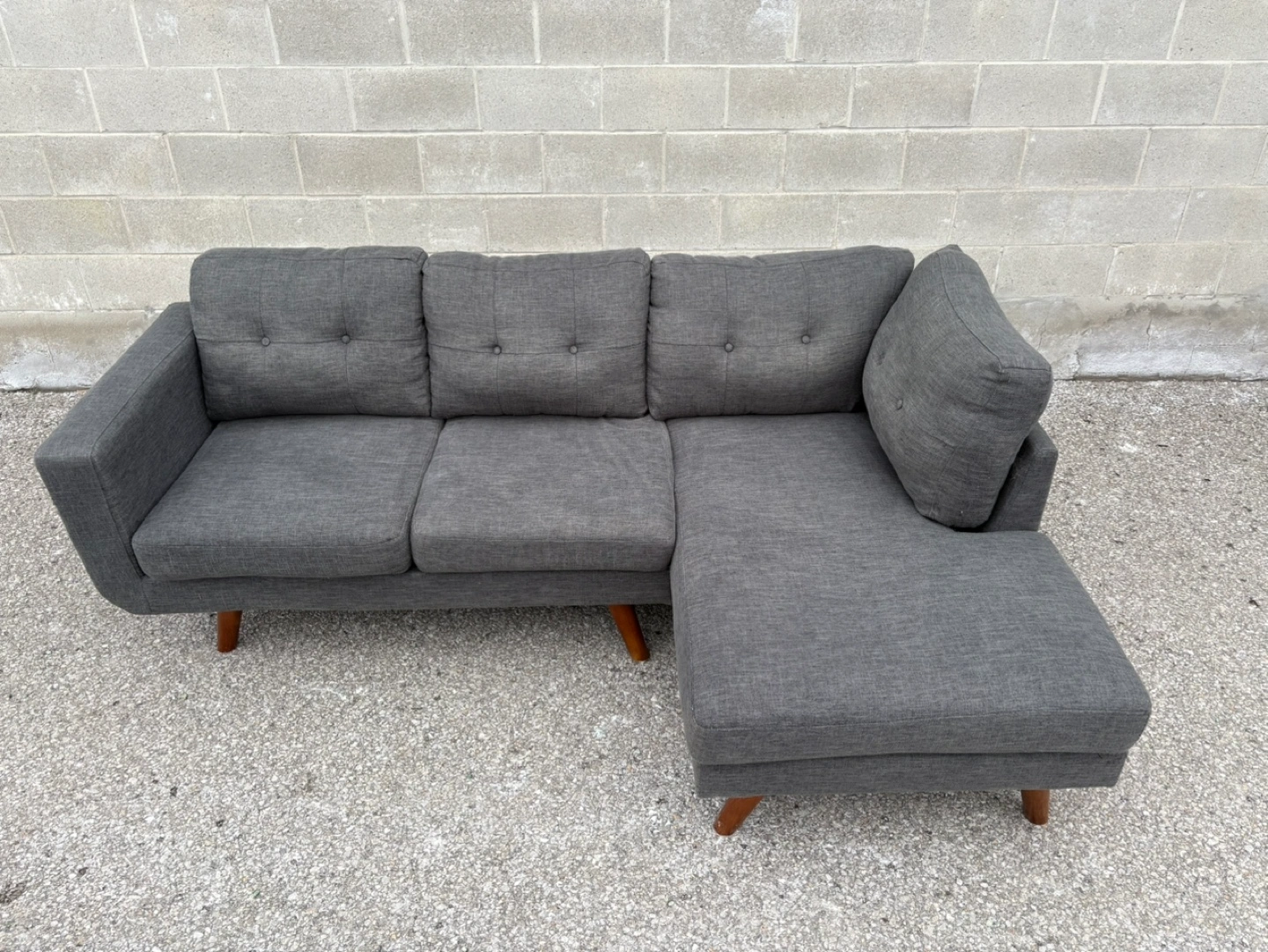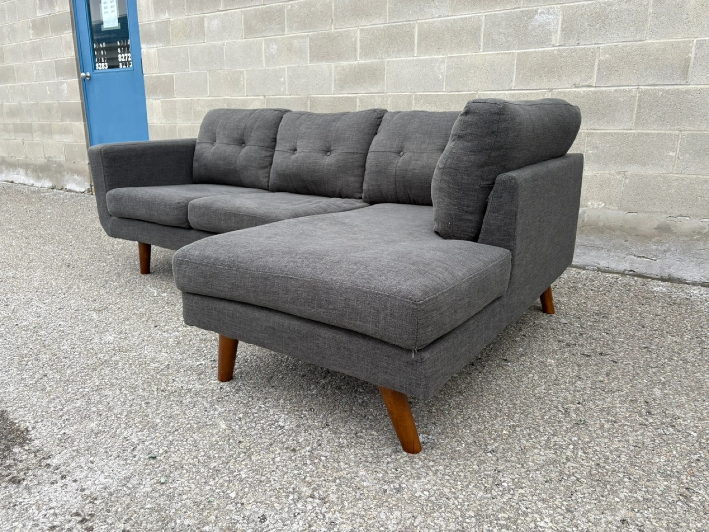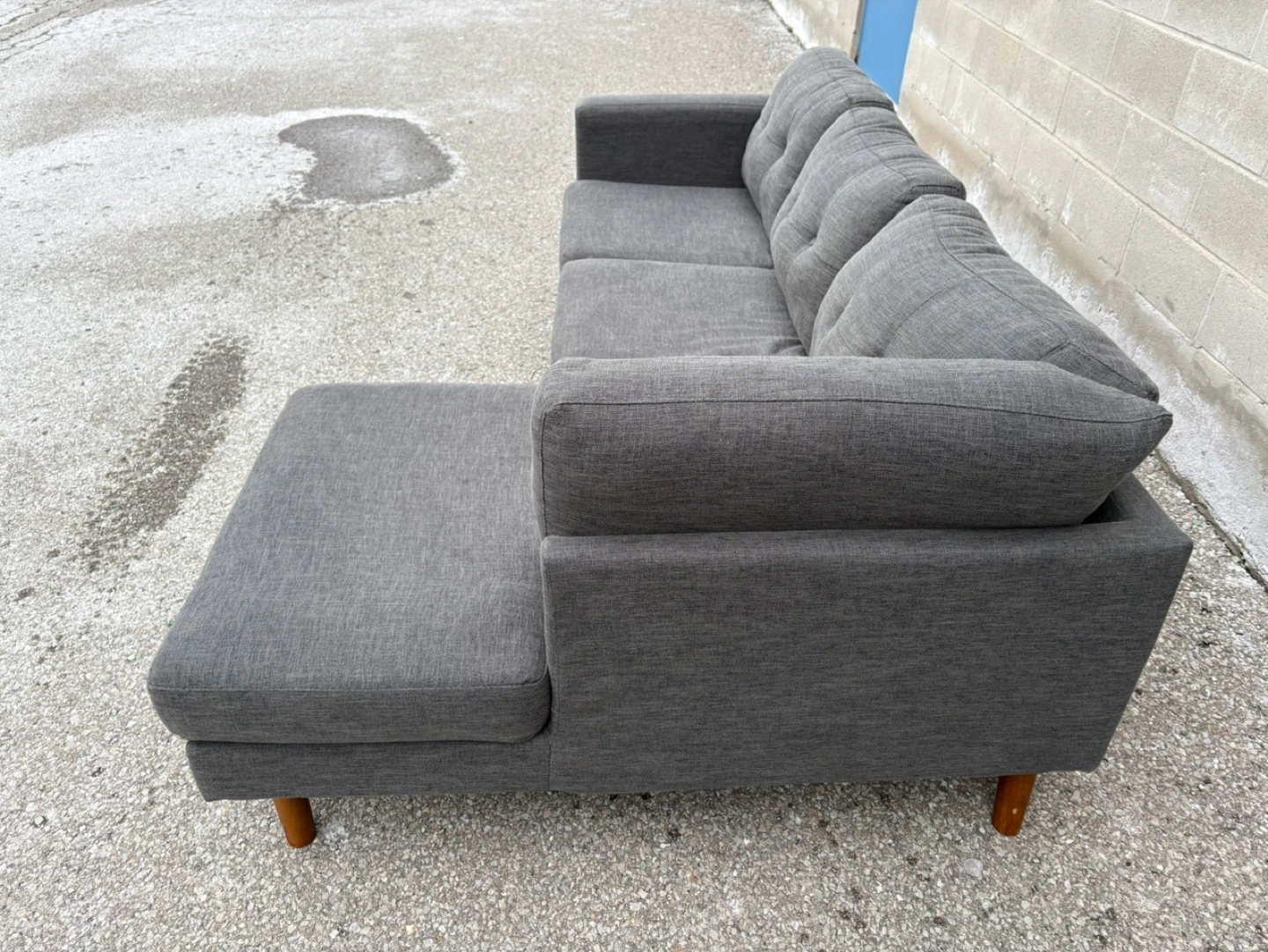 ✅ SAME DAY FREE DELIVERY AVAILABLE🚚💨 $300 🏷️ (OBO) ITEM DESCRIPTION: - Sectional shaped couch - cushions & pillows come off to be washed - Colour: Grey - comes in pieces for easy transport (2) - reversible chaise - comfy - nice design - some wear / fraying (as shown in images) - no major stains/marks MEASUREMENTS 📏: - L: 82” x W: 52” x H:30” (approx) ✅ SAME DAY FREE DELIVERY AVAILABLE ✅ ✨ALL ITEMS FIRST COME FIRST SERVE ✨