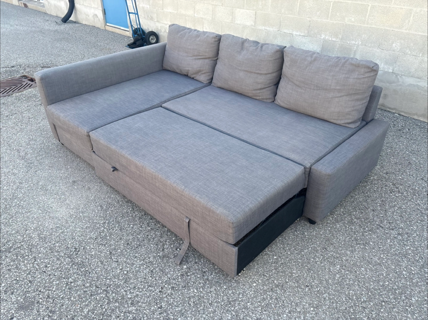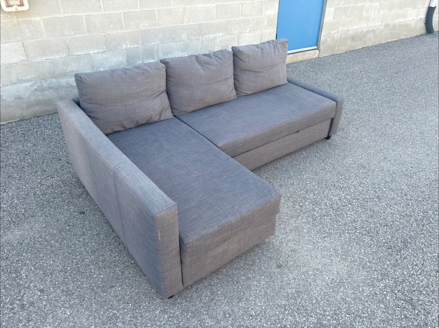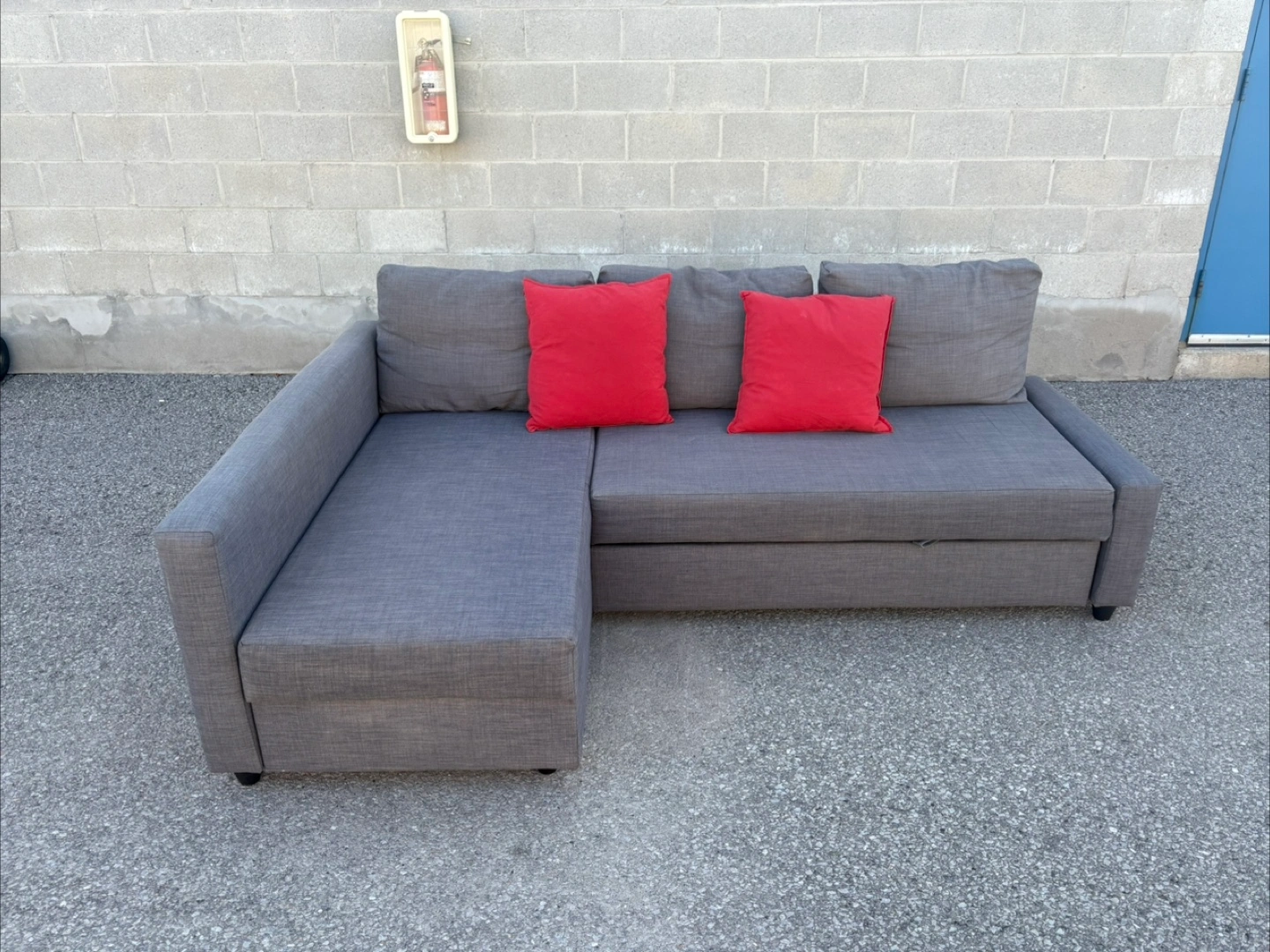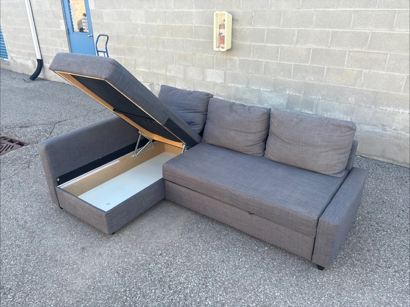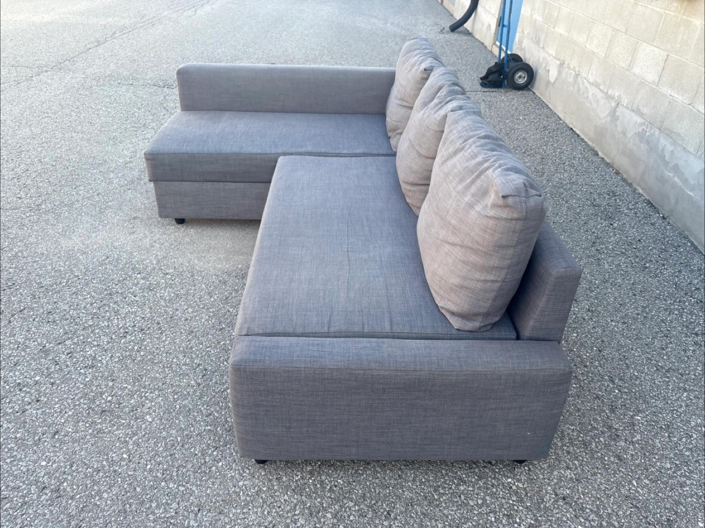 ✅ SAME DAY FREE DELIVERY AVAILABLE🚚💨 $400 🏷️ (OBO) ITEM DESCRIPTION: Description - Sectional shaped couch w/ pull out bed & storage - Colour: Grey - pull out bed - large storage - washable pillows - comes in pieces for easy transport (can fit in basement) - chaise can go on either side - comfy - nice design - minor wear - some discolouration on chaise side arm (as shown in images) - no major stains/marks (some white paint stains that can come out are in front of chaise) MEASUREMENTS 📏: - L: 90” x W: 60” x H:30” (approx) ✅ SAME DAY FREE DELIVERY AVAILABLE ✅ ✨ALL ITEMS FIRST COME FIRST SERVE ✨