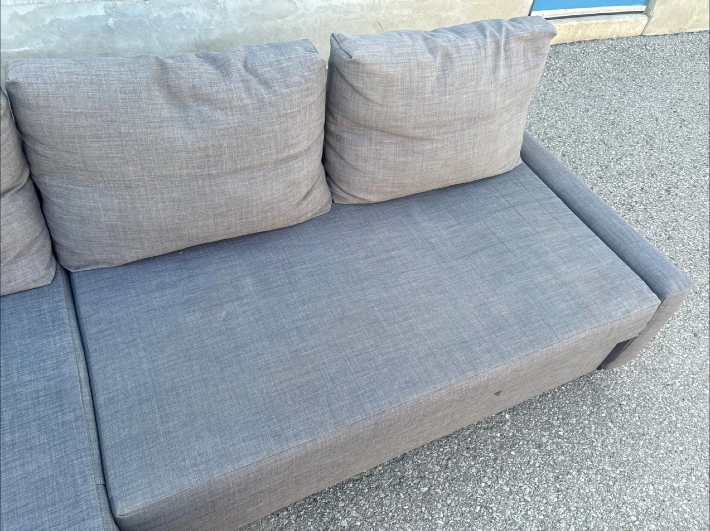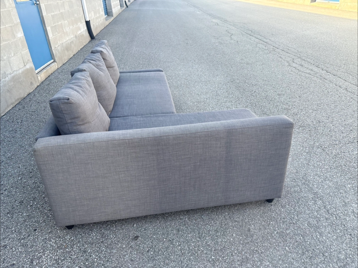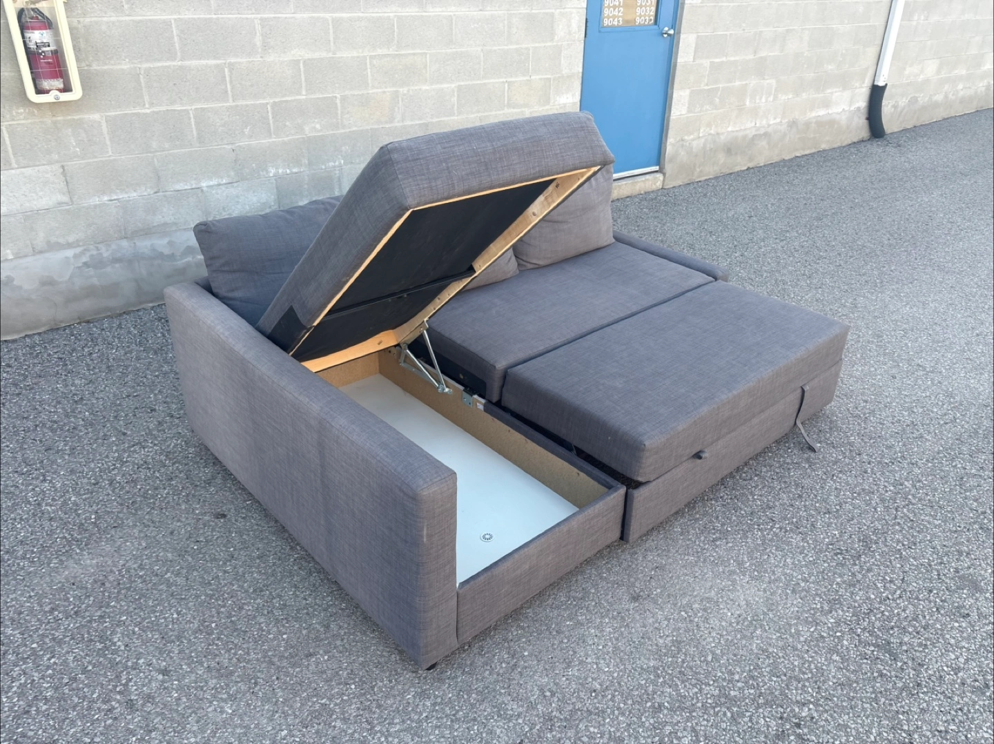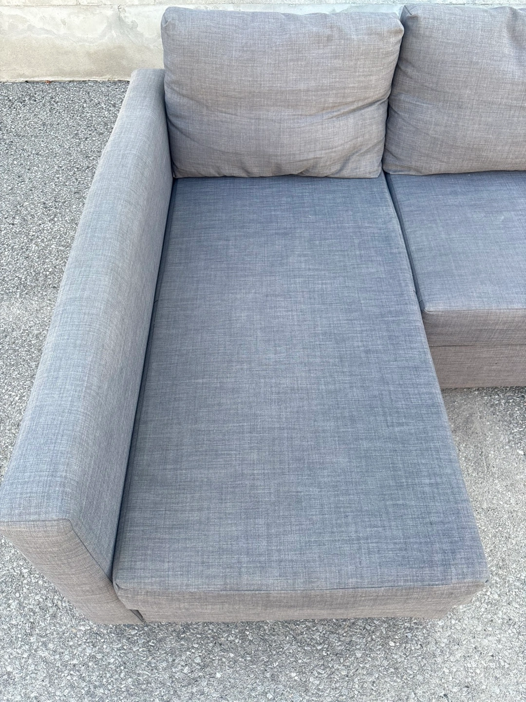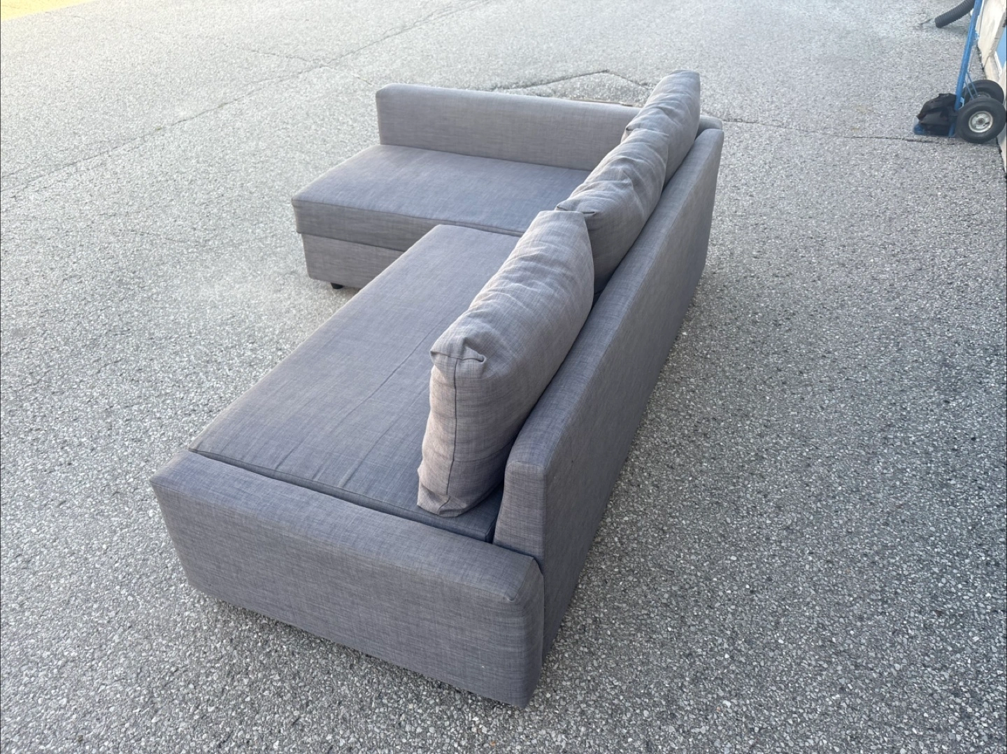 ✅ SAME DAY FREE DELIVERY AVAILABLE🚚💨 $400 🏷️ (OBO) ITEM DESCRIPTION: Description - Sectional shaped couch w/ pull out bed & storage - Colour: Grey - pull out bed - large storage - washable pillows - comes in pieces for easy transport (can fit in basement) - chaise can go on either side - comfy - nice design - minor wear - some discolouration on chaise side arm (as shown in images) - no major stains/marks (some white paint stains that can come out are in front of chaise) MEASUREMENTS 📏: - L: 90” x W: 60” x H:30” (approx) ✅ SAME DAY FREE DELIVERY AVAILABLE ✅ ✨ALL ITEMS FIRST COME FIRST SERVE ✨