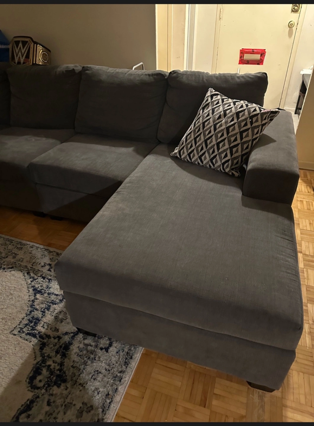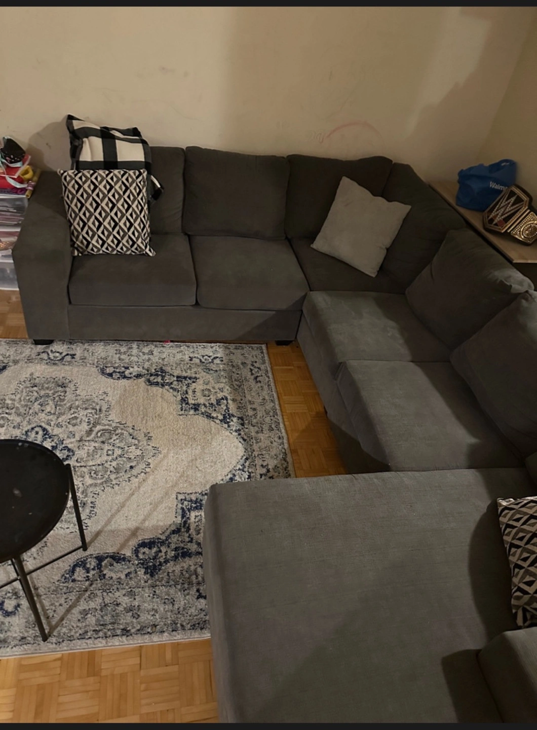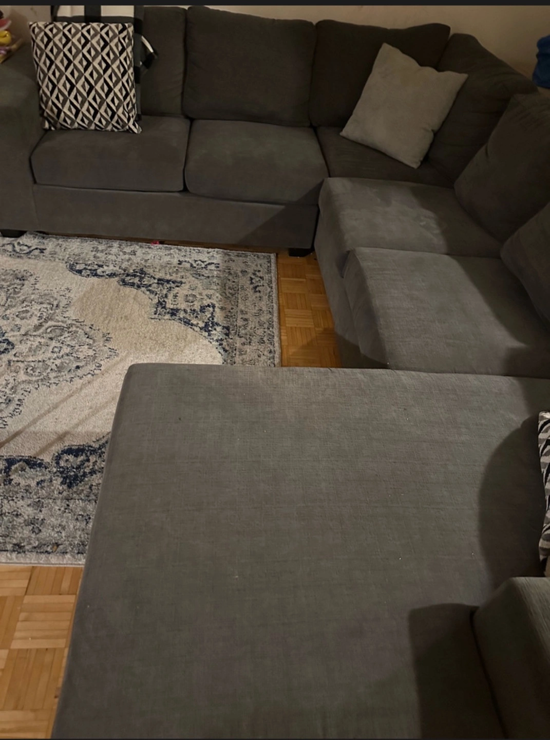 ✅ SAME DAY FREE DELIVERY AVAILABLE🚚💨 $700 🏷️ (OBO) ITEM DESCRIPTION: - Sectional / u shaped couch - Colour: grey - easy to transport (splits in 3-4 pieces) - cushions come off to be washed - nice design - comfy & cozy - easy to clean and maintain material - spacious - seats 6-9 - minor wear - no major marks/stains MEASUREMENTS 📏: L: 118” x CHAISE : 92” x CHAISE: 64” x H:30” (approx) ✅ SAME DAY FREE DELIVERY AVAILABLE ✅ ✨ALL ITEMS FIRST COME FIRST SERVE ✨