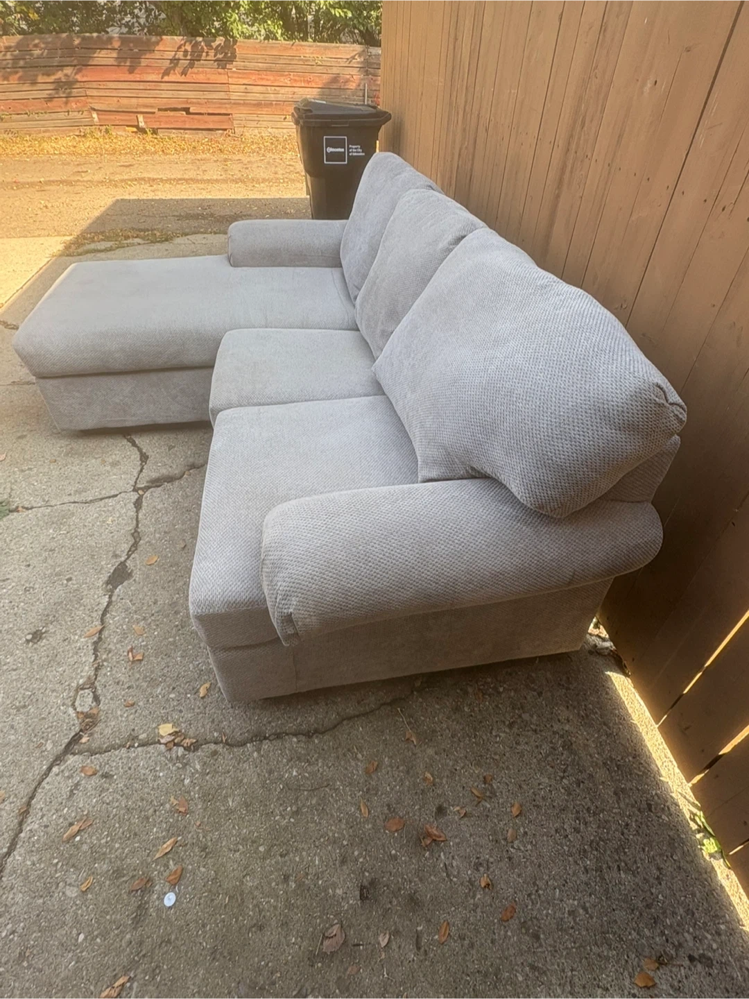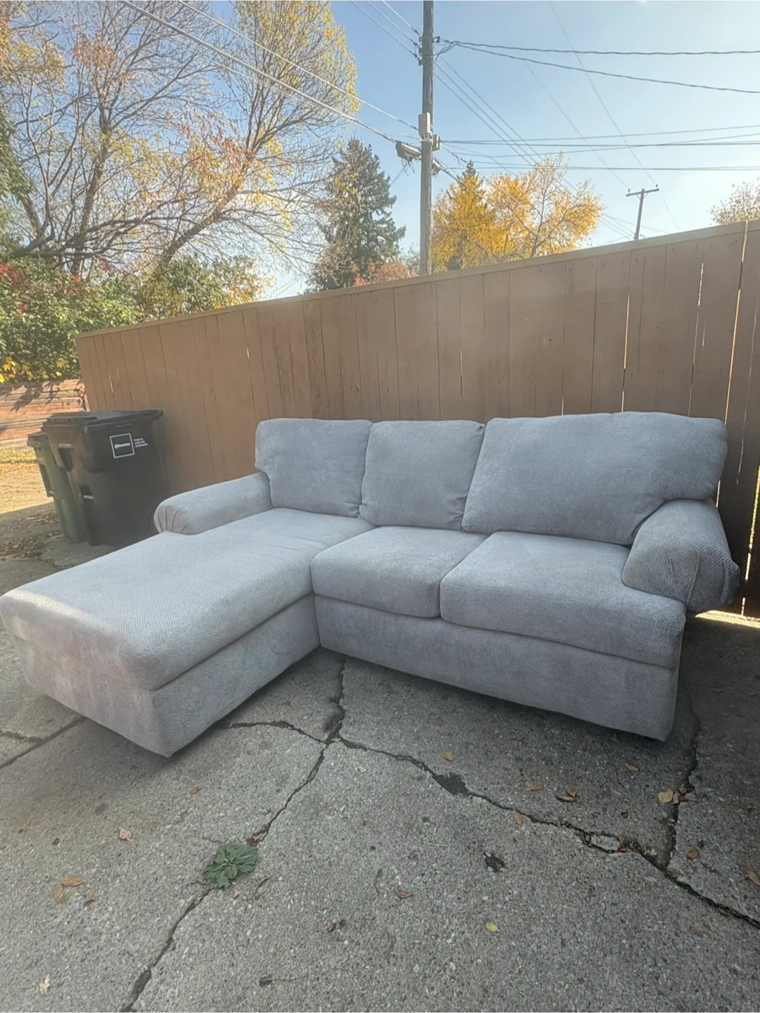 Selling a comfy grey sectional sofa! Perfect for lounging and relaxing after a long day. It's in great condition and ready for a new home. The neutral colour will fit right in with any decor. A great addition to any living room or entertainment space