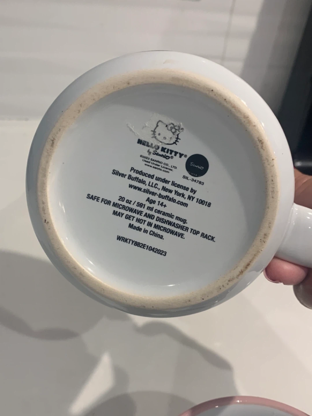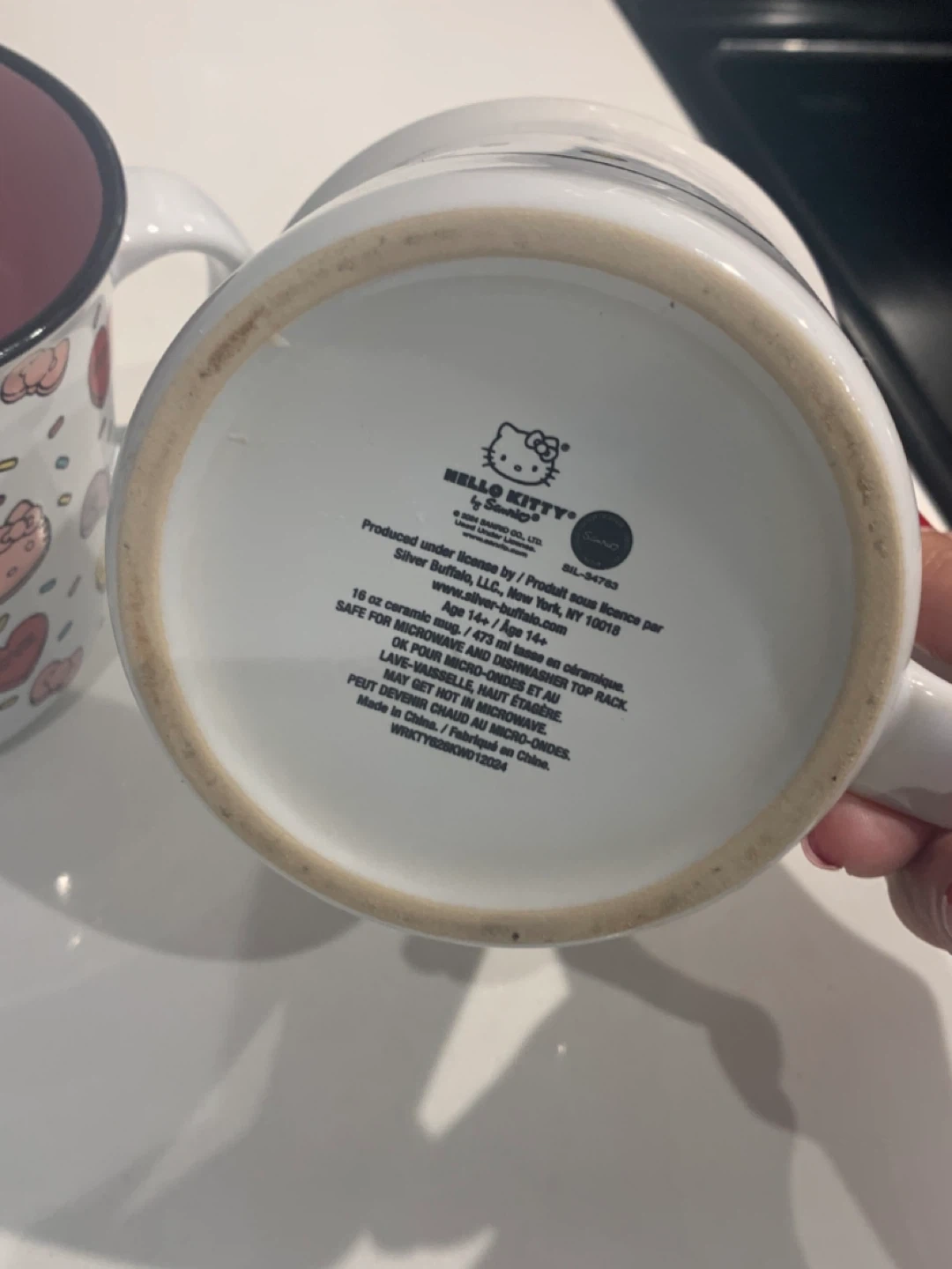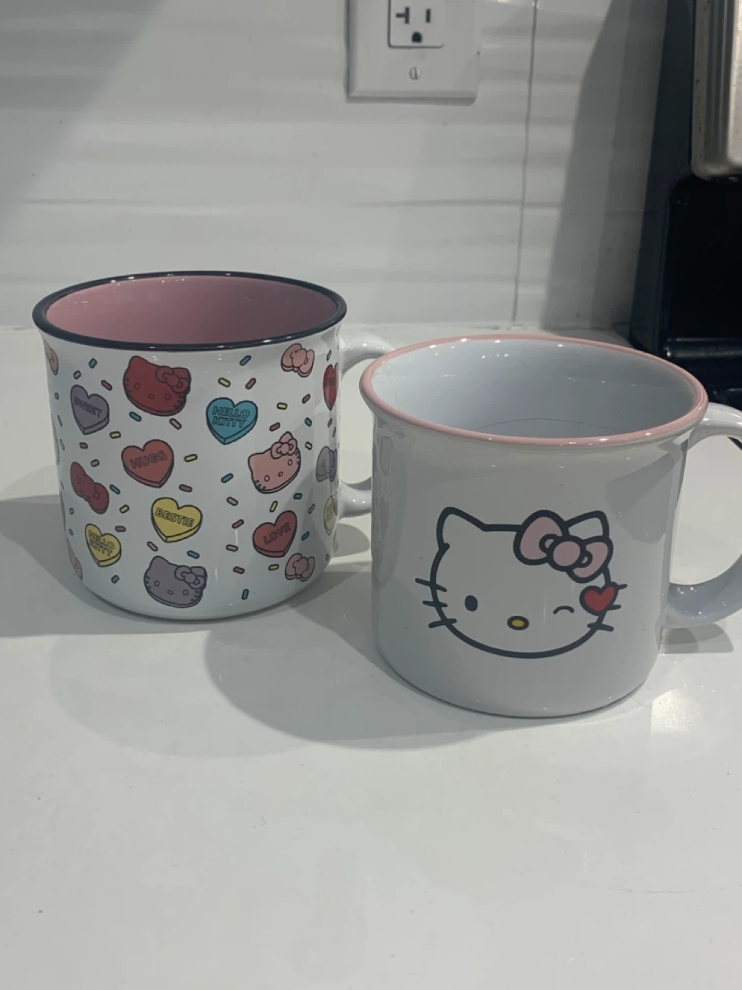 Selling a cute set of two Hello Kitty mugs! One is decorated with Hello Kitty and candy hearts, and the other features Hello Kitty's face with a pink bow. Both are in great shape and ready for a new home. The mugs are 20 oz and 16 oz ceramic mugs, respectively. They are safe for microwave and dishwasher top rack
