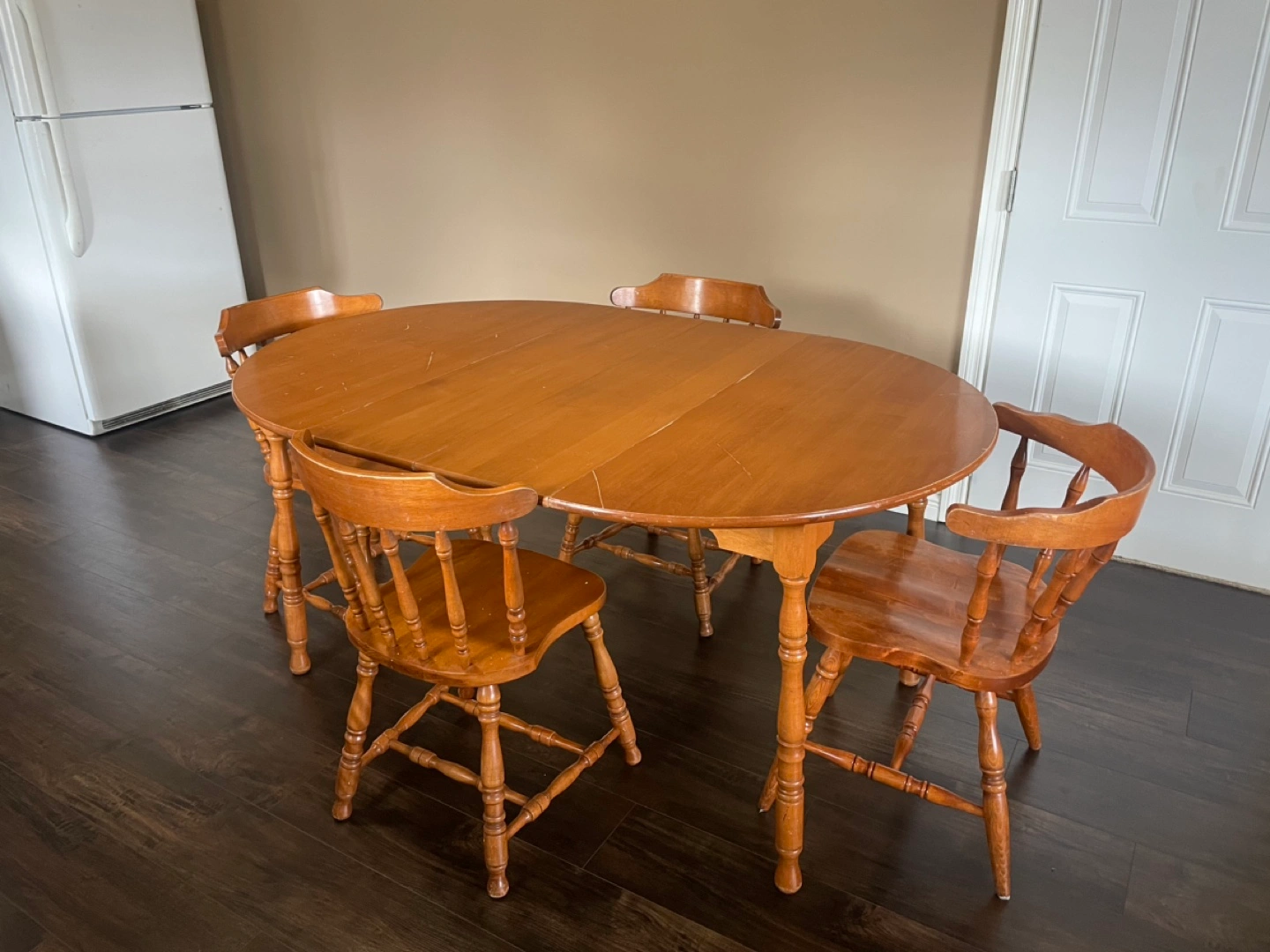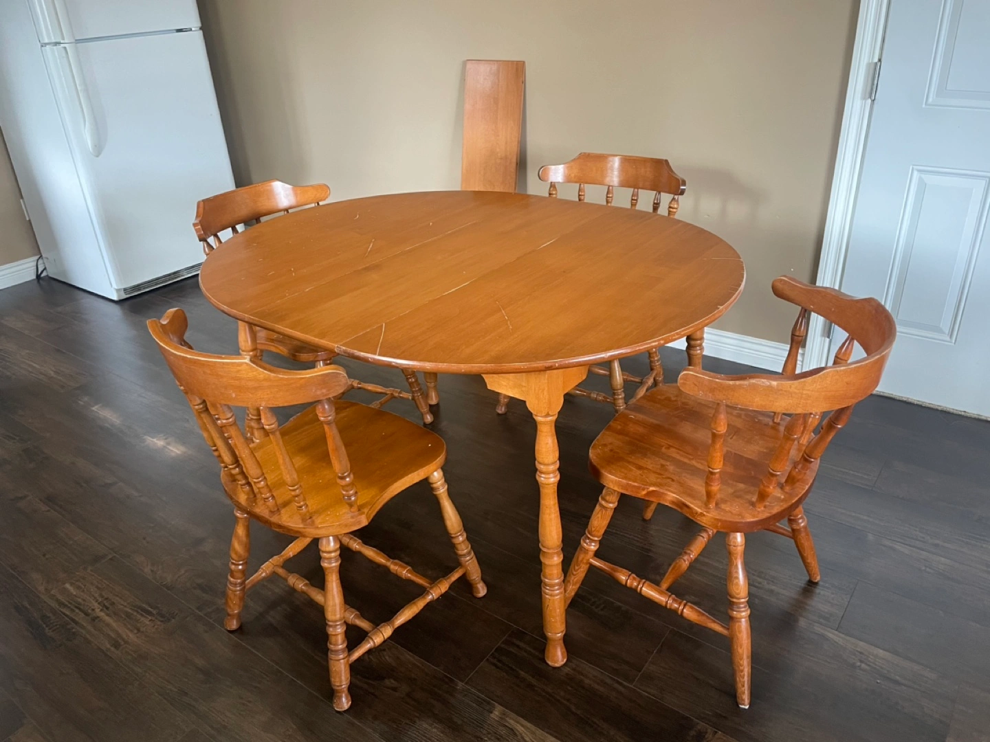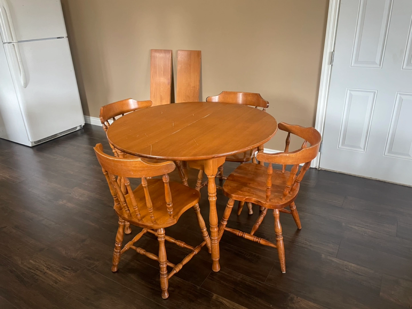 75This table works great if you would like to change sizes because it has three different options as shown in the pictures. The top of the table has some scratches, but would look nice with a table cloth. I think it would also be a nice fix-up project for someone who wants to put the time in to refinish the table. It comes apart very easily because it has wing nuts, so no tools needed. It fits in a hatchback and possibly a small car with a trunk too.