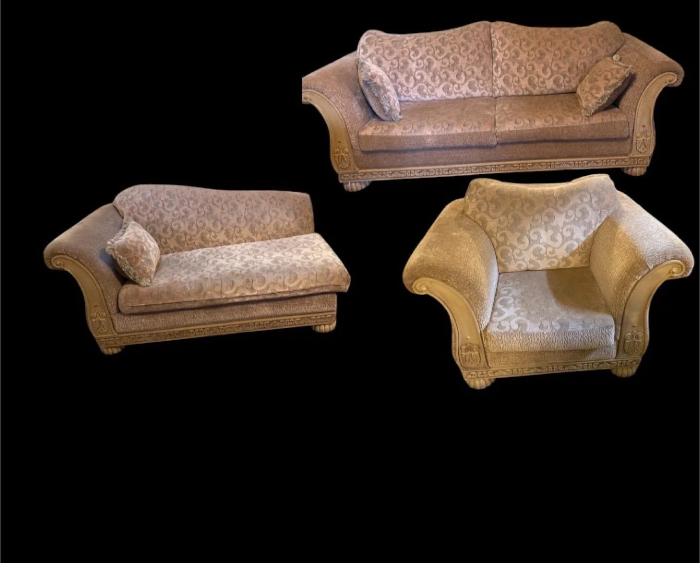 No pets No kids Nonsmoking house Selling a sofa set that includes a loveseat, a sofa, and an armchair. It features a patterned fabric and ornate detailing. Perfect for a living room or den!