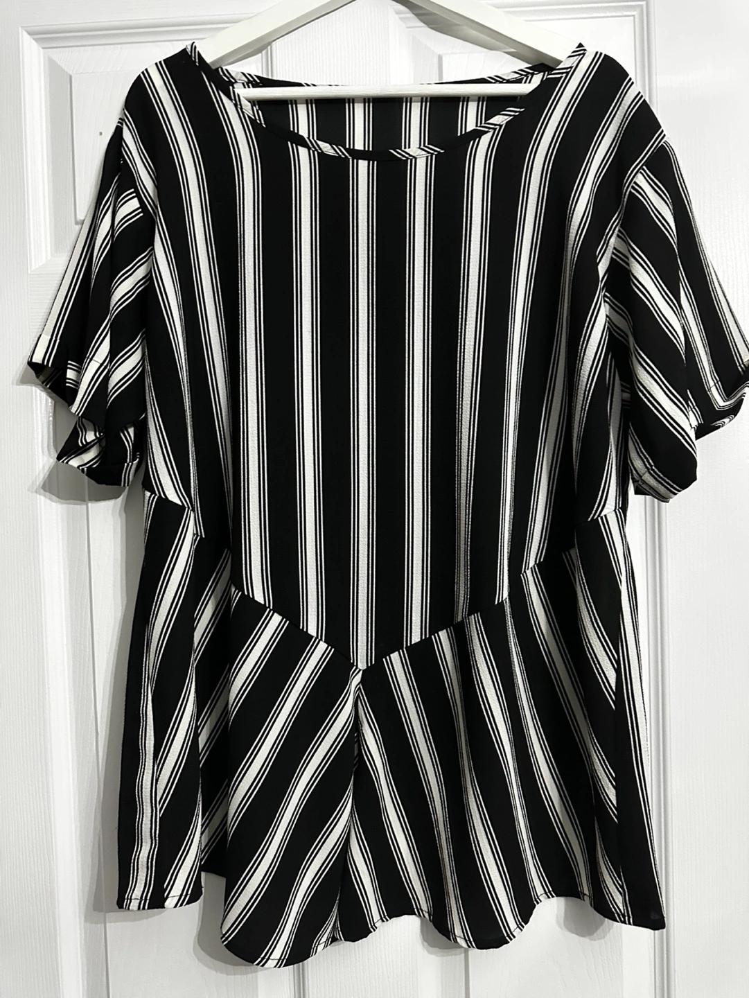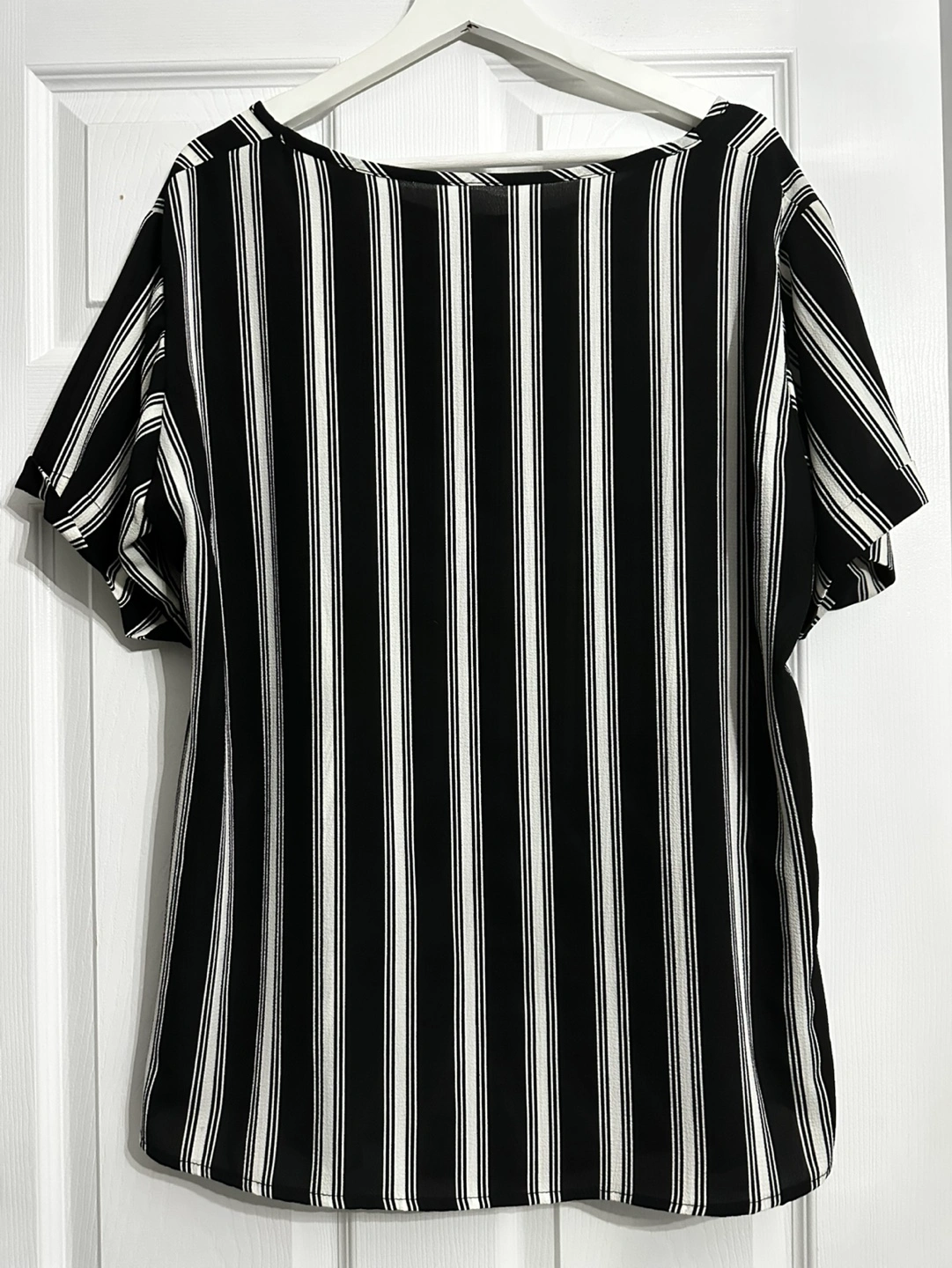 442Black and white striped blouse with short sleeves. The blouse has a slightly flared hem.