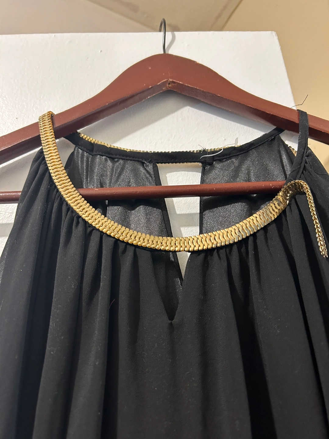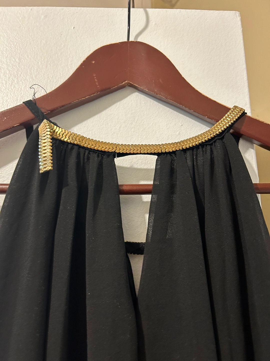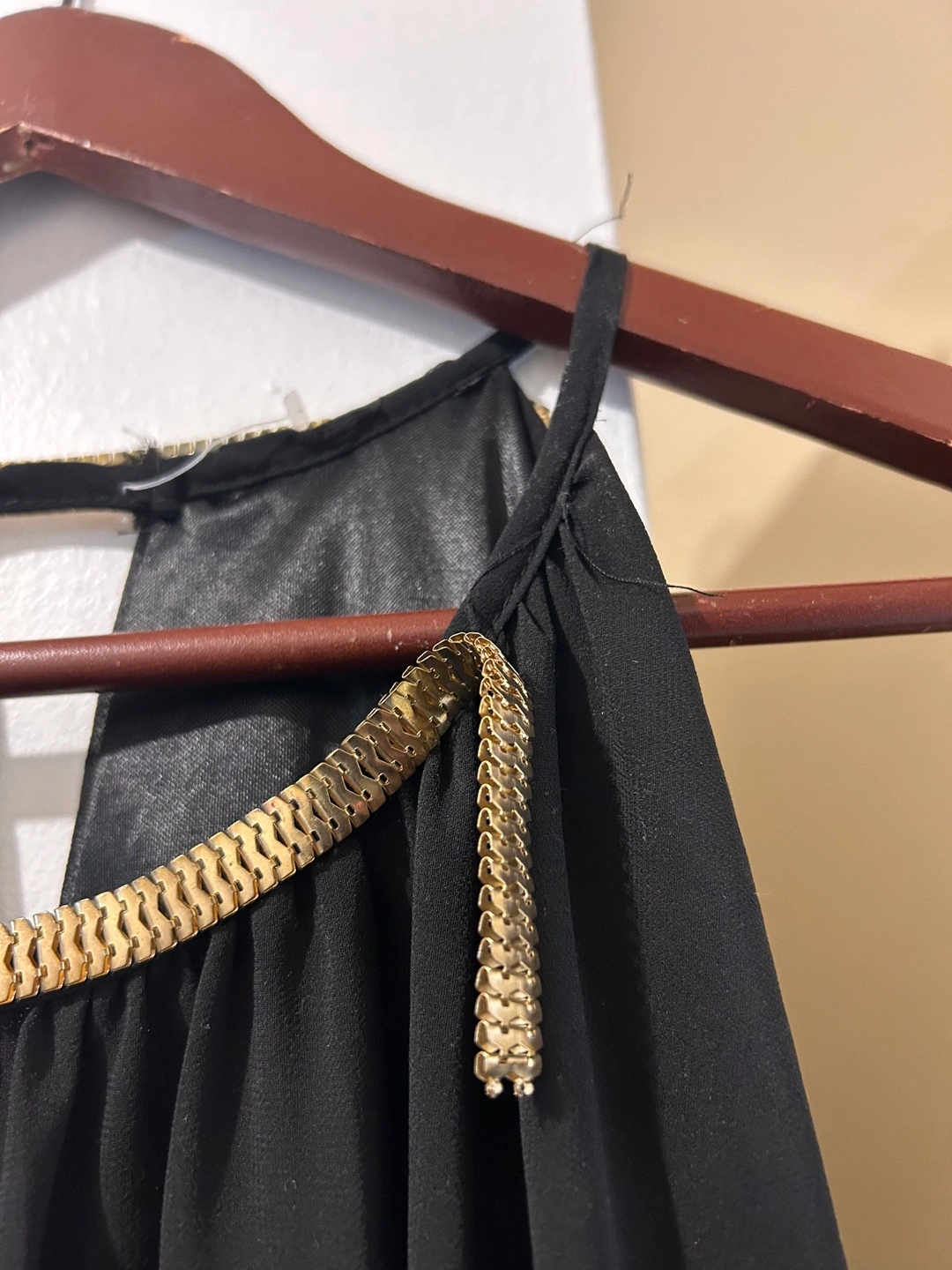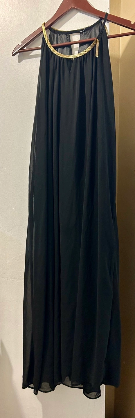 Black halter dress with a gold chain detail around the neckline. The dress is sleeveless and falls nicely . The fabric is lightweight and flowy. Never worn. If you are good with your hands, you can repair the gold metal part on one side coming off. It can just use a little bit of glue like E 6000 or a good fabric glue and it should be fine Brown stretch dress pants his size large