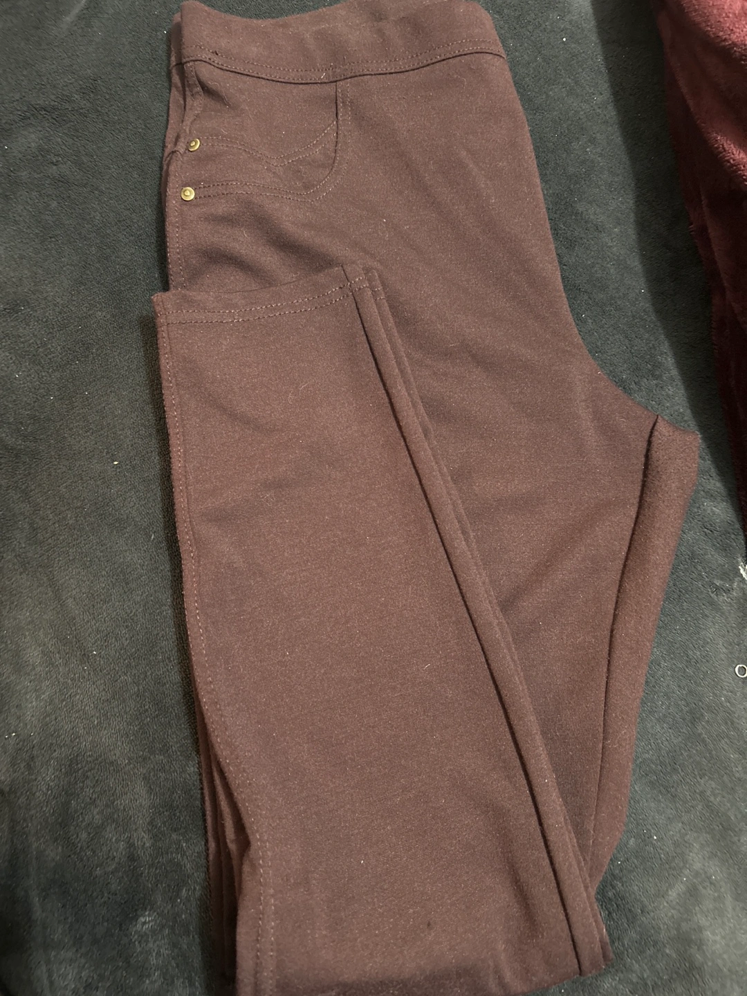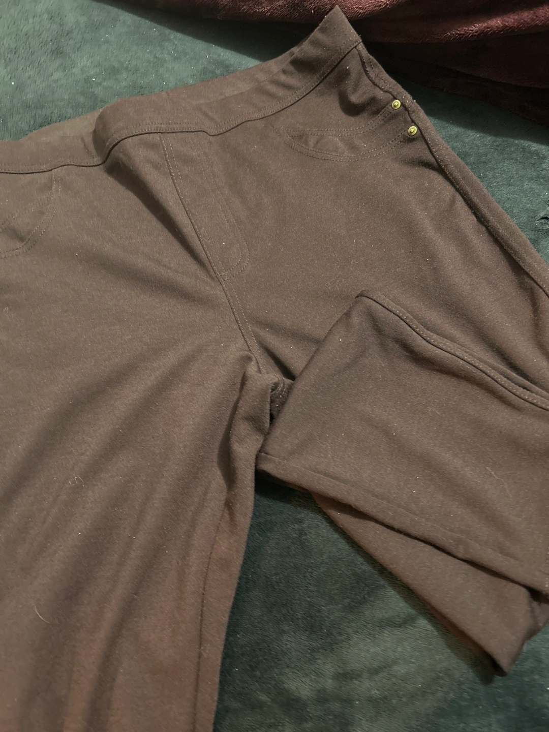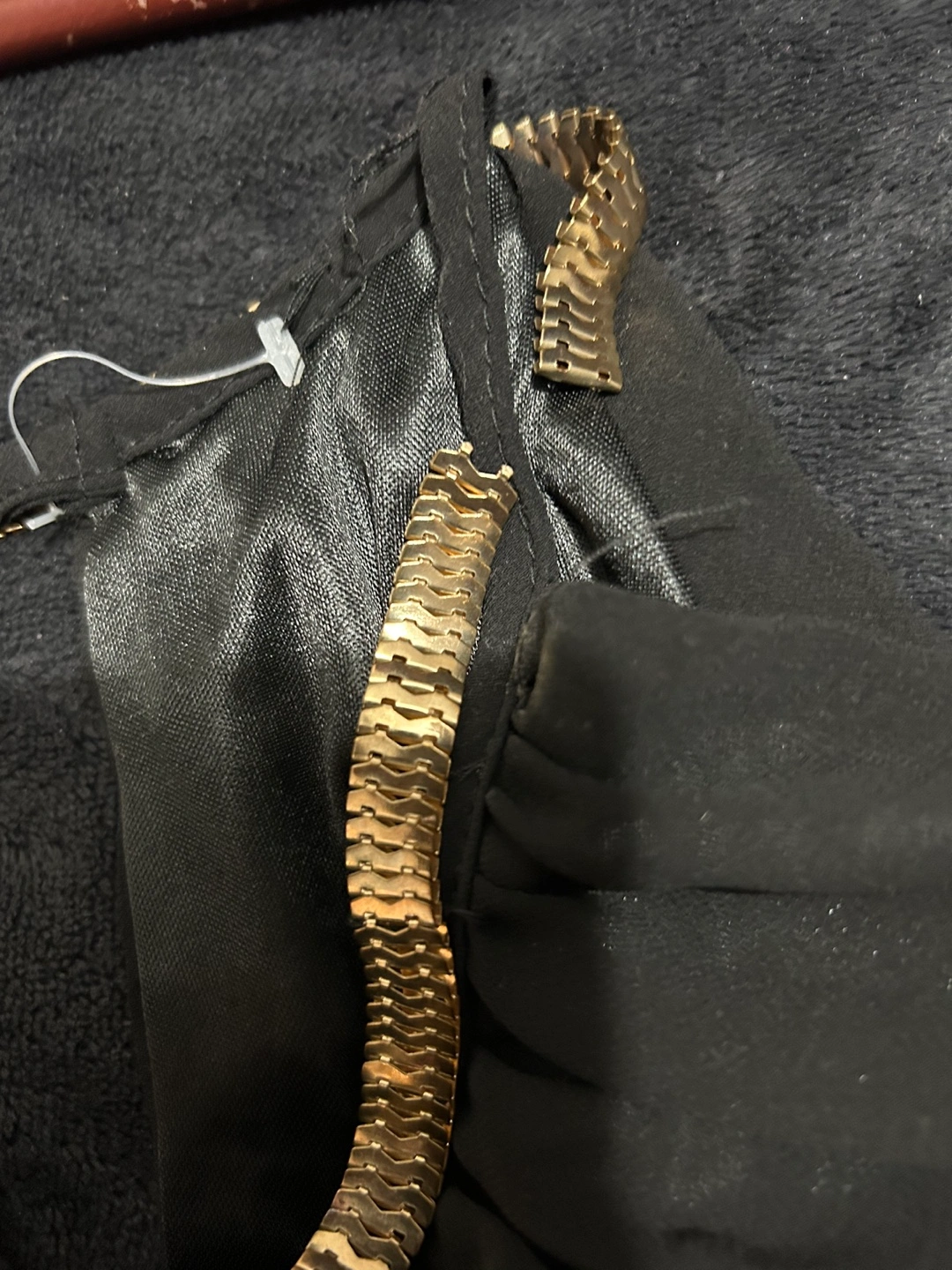 Black halter dress with a gold chain detail around the neckline. The dress is sleeveless and falls nicely . The fabric is lightweight and flowy. Never worn. If you are good with your hands, you can repair the gold metal part on one side coming off. It can just use a little bit of glue like E 6000 or a good fabric glue and it should be fine Brown stretch dress pants his size large
