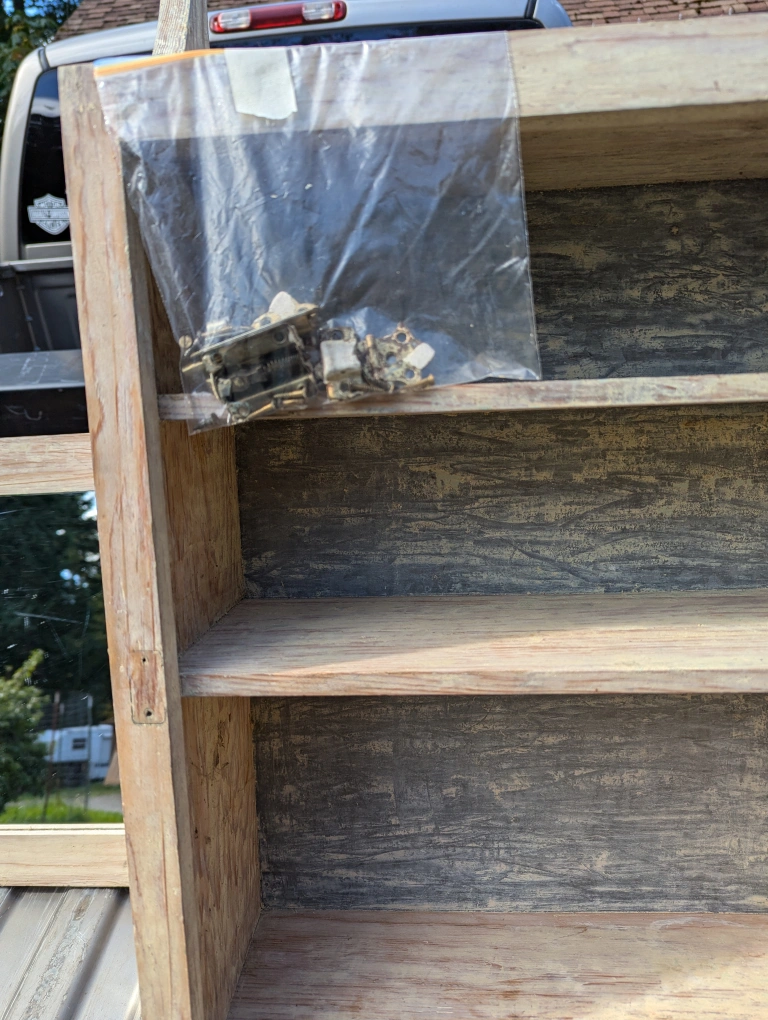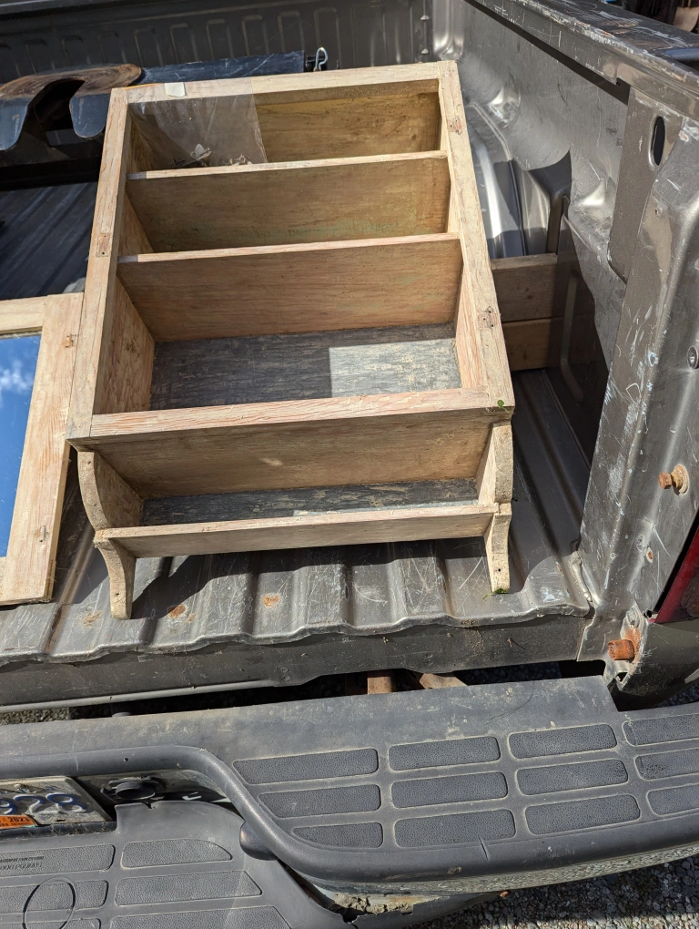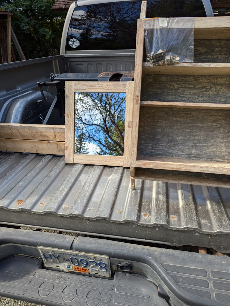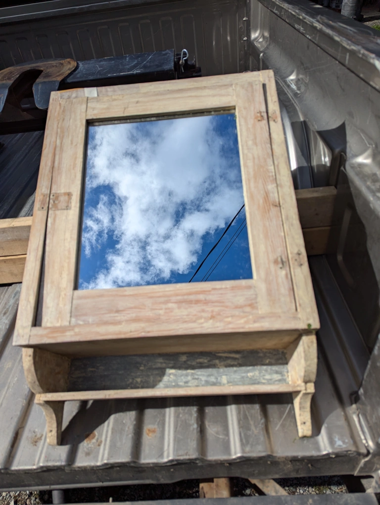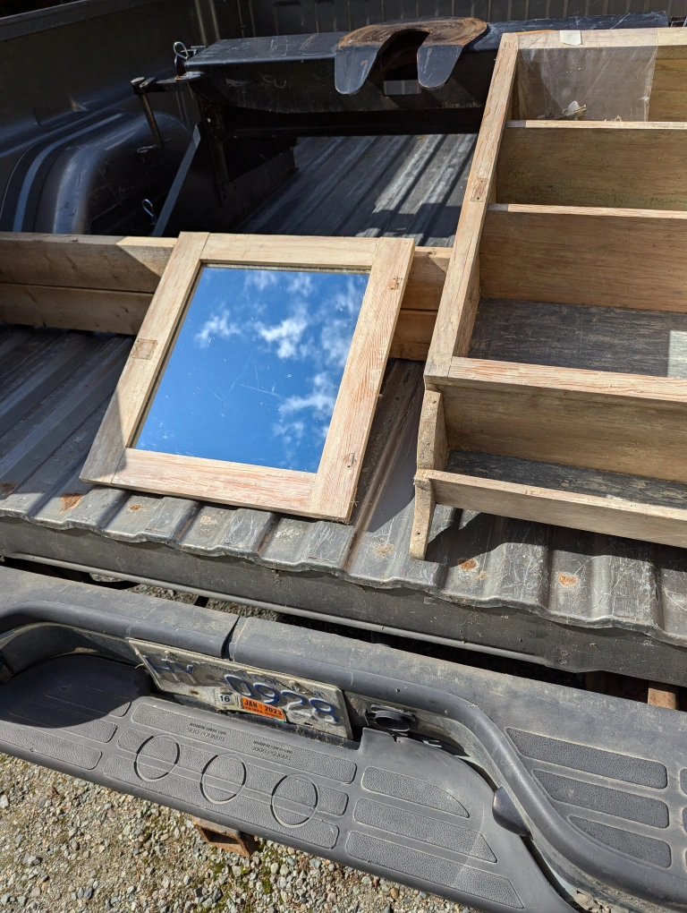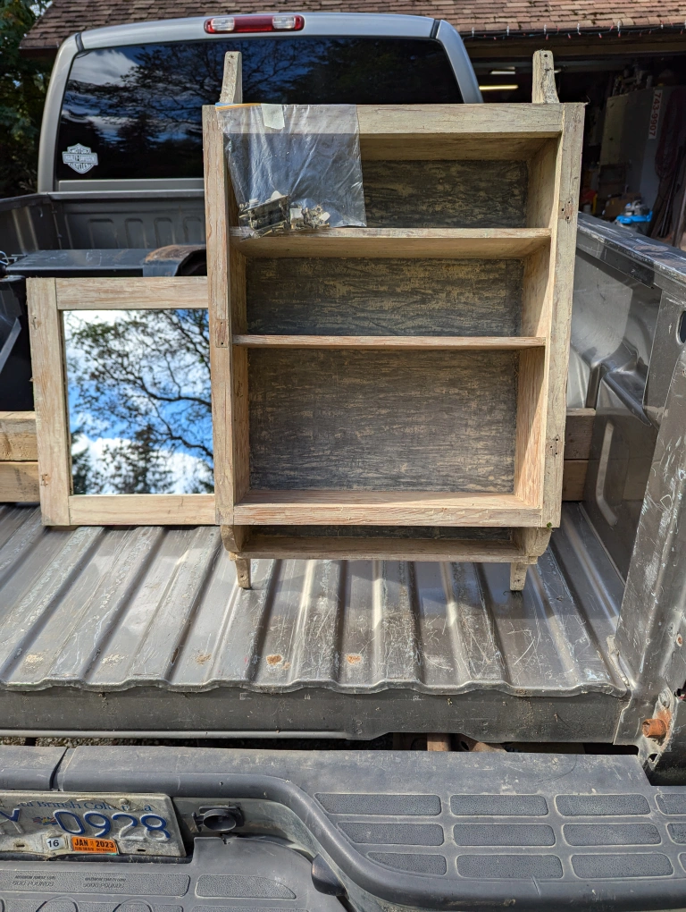 20This wall shelf is in good used condition. It has three shelves and a mirror. The shelf is made of wood and the mirror is framed in wood. The shelf comes with all of the necessary hardware for mounting. The dimensions are 18.5 inches (width) x 12 inches (depth) x 26 inches (height). Located in Cobble Hill