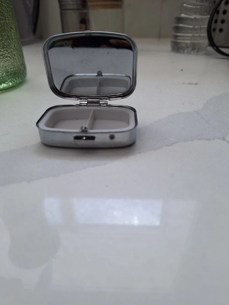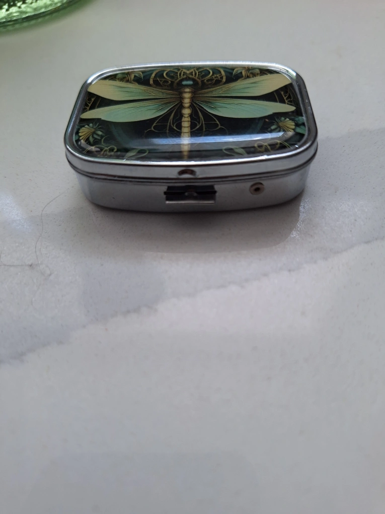 Elegant dragonfly design | Great for purse or travel This compact metal pill case has two sections inside and a built-in mirror. Perfect for meds, mints, or even tiny jewelry ๐๐ ๐ฟ Lightweight, clean, and closes securely. ๐Pickup near Yorkville SW ๐ฌ Message if you'd like it! Sharing this as part of Karrotโs Freecycle to pass on something useful ๐ #freecycle
